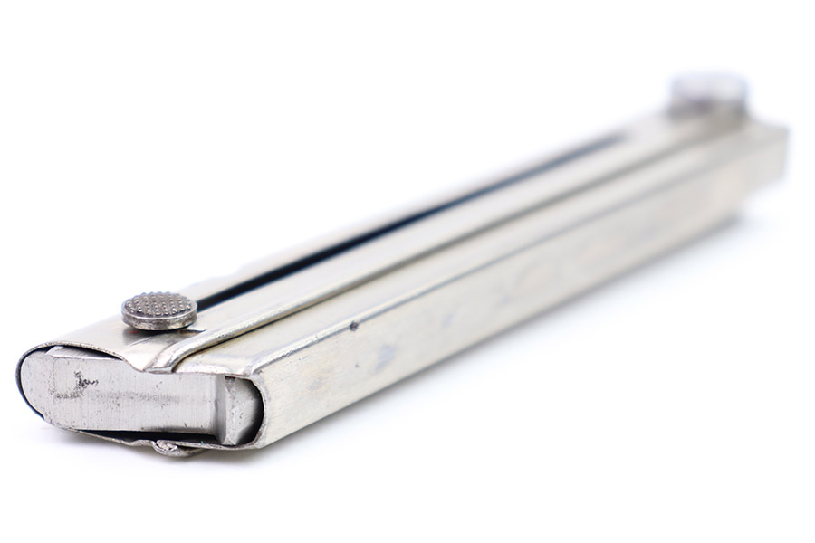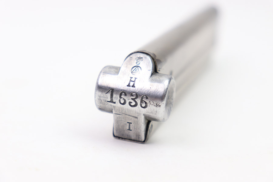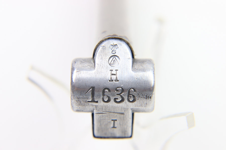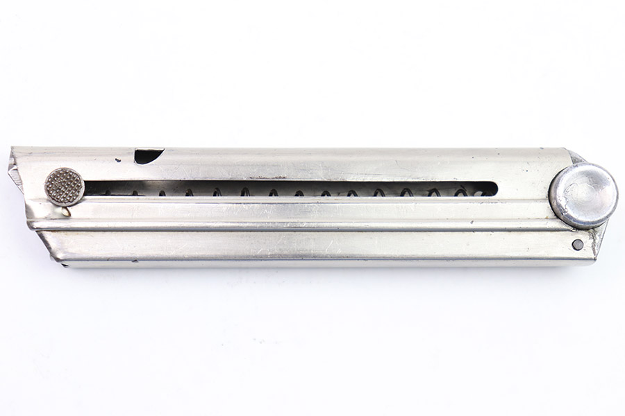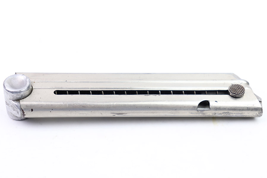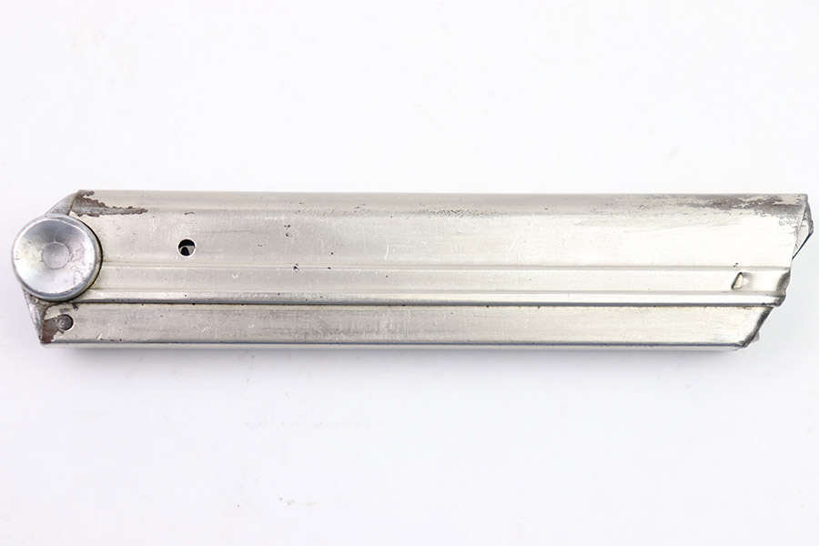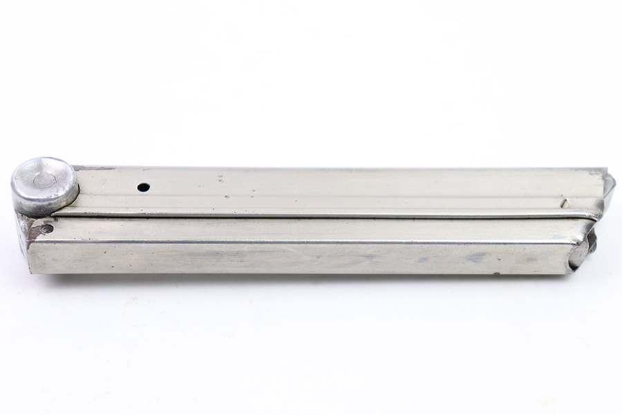 10/31/22 – This is a great example of an original Simson Police Luger Magazine from the Pre-WW2 era. The nickeled tube has retained a majority of its finish with some minor use wear along its edges and a few spots of finish chipping toward the base. The magazine bottom is in great condition with minor signs of wear throughout and small patches of pinpricking on its face. There is an eagle 6 proof marking, a police numbering mark “H 1636”, “I” marking, and a “S” within a triangle, within a circle mark that we are unable to identify. The spring is strong and functional.