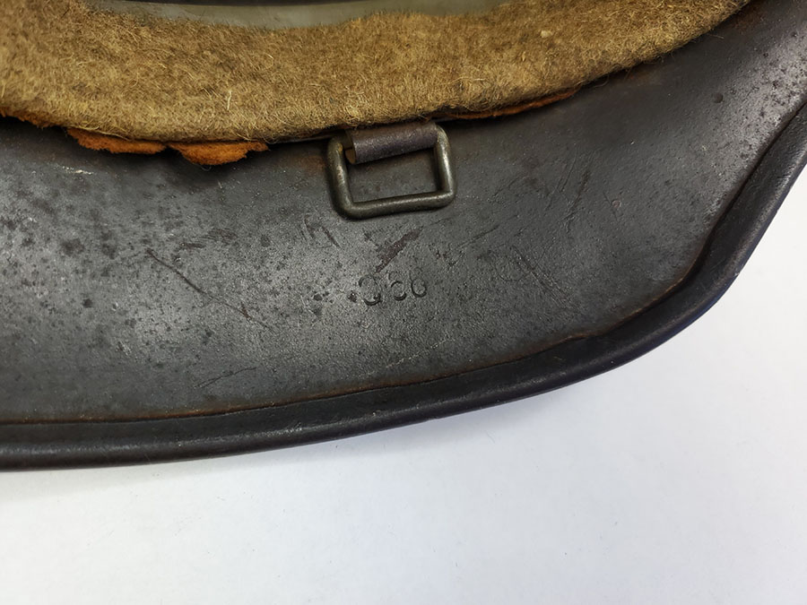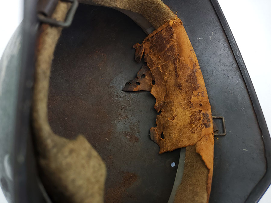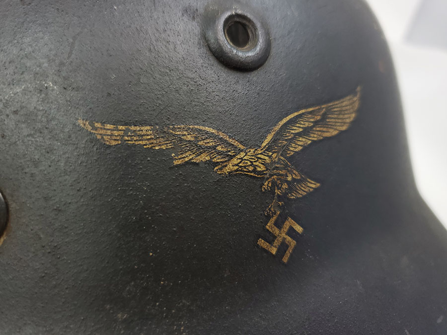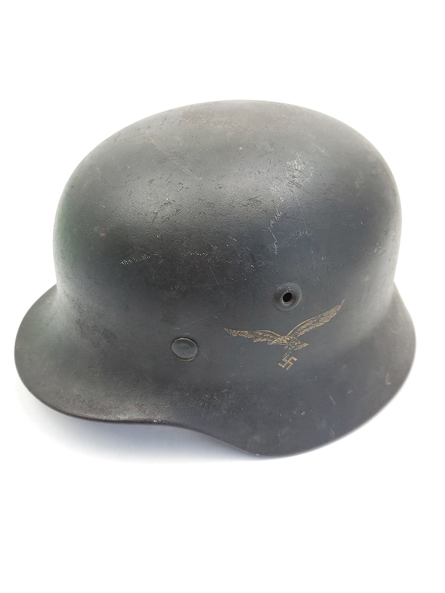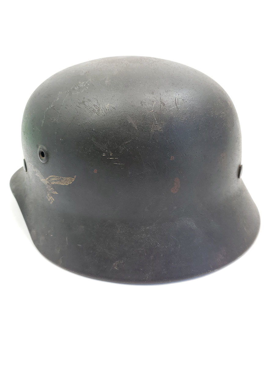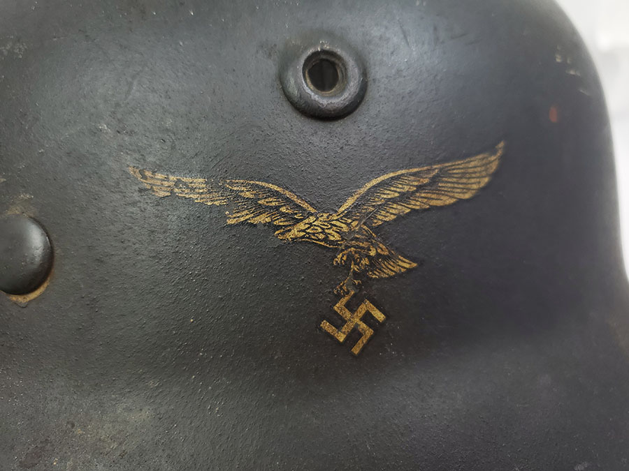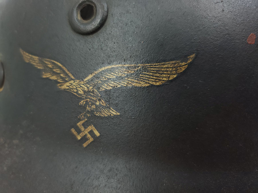 7/22/20 – This is an original WW2 Luftwaffe M40 helmet, single decal with no interior liner. The liner has all worn away – as shown in photos. The shell is in great overall condition though with rough 90% of the luftwaffe decal still in tact. There are no dents in the helmet, just typical paint loss and aging. Size is 56 as shown on the interior of the shell. There is a “Q” for Quist maker stamp in front of the “56” but it is somewhat hard to see.