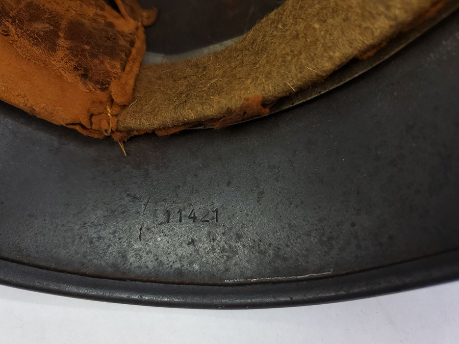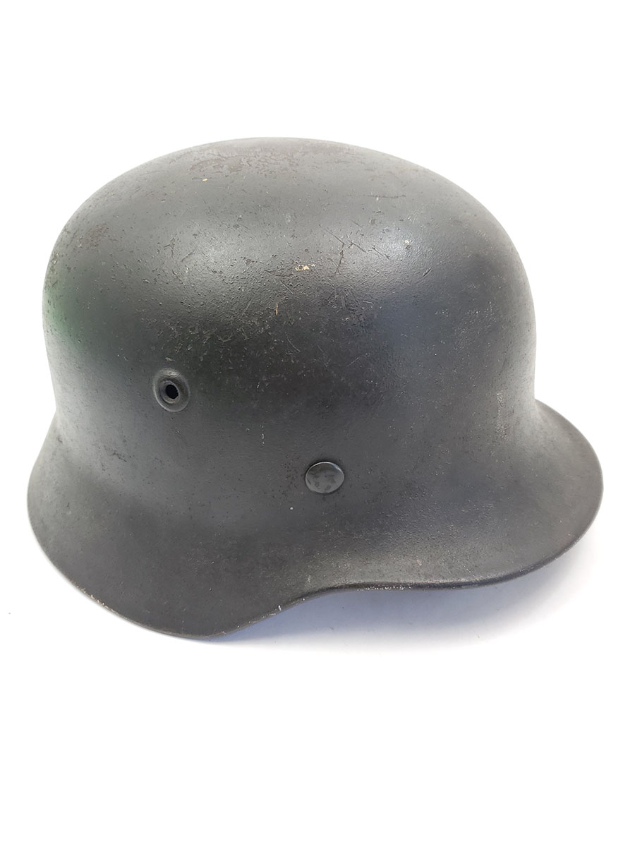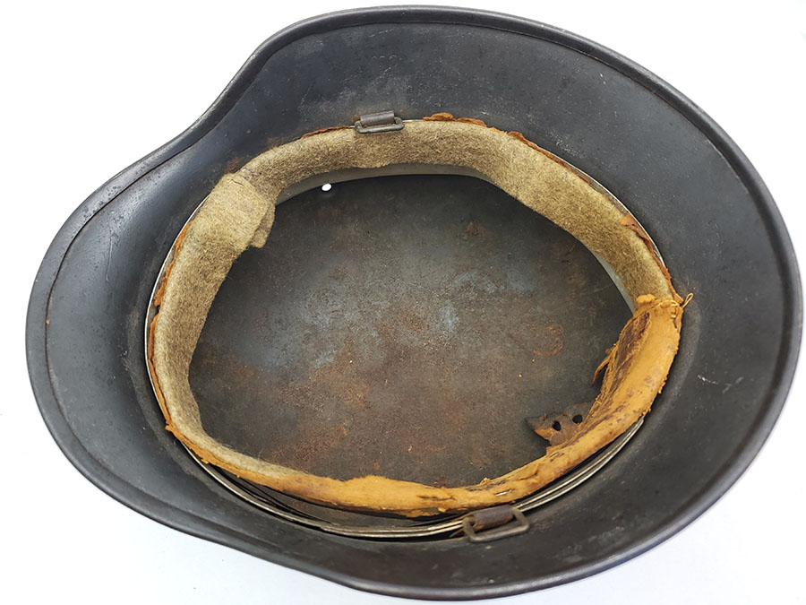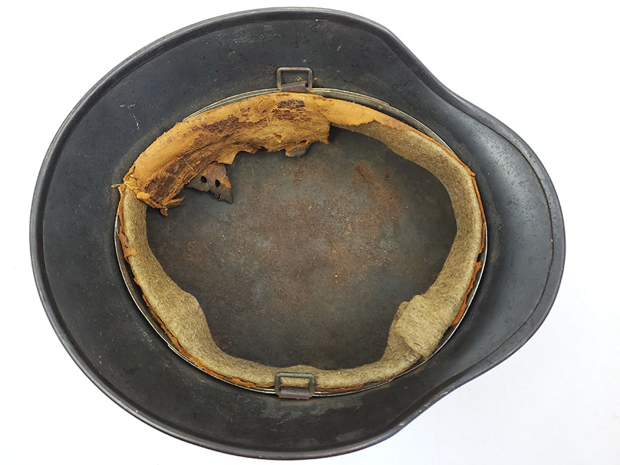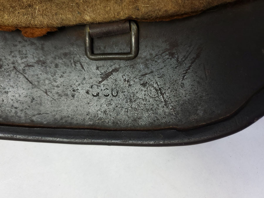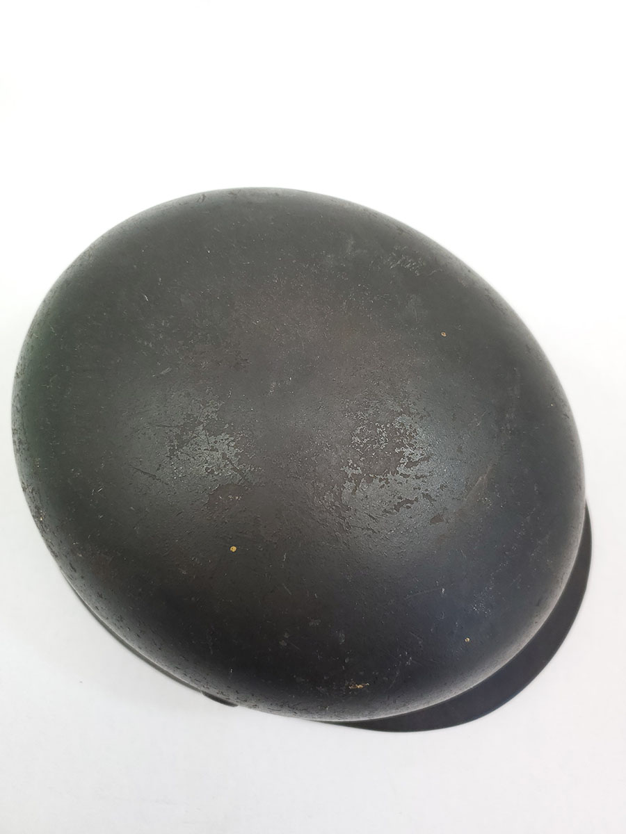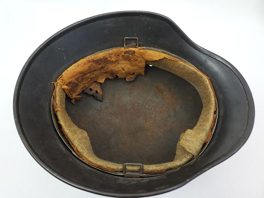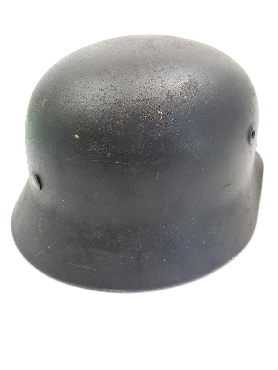 7/22/20 – This is an original WW2 Luftwaffe M40 helmet, single decal with no interior liner. The liner has all worn away – as shown in photos. The shell is in great overall condition though with rough 90% of the luftwaffe decal still in tact. There are no dents in the helmet, just typical paint loss and aging. Size is 56 as shown on the interior of the shell. There is a “Q” for Quist maker stamp in front of the “56” but it is somewhat hard to see.