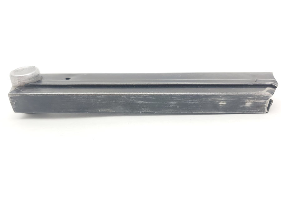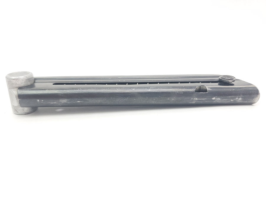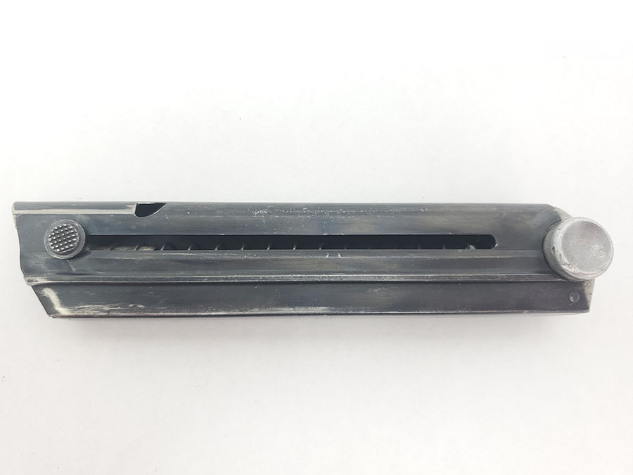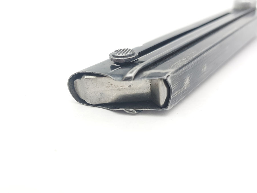 6/17/20 – This is an original Mauser Luger magazine from WW2. The base has a rare single digit serial number, and “r” letter suffix with an eagle 63 military proof stamp. The blued frame is in great shape but there is one small dent on the left side towards the base. This doesn’t affect functionality. Spring is fully functional.