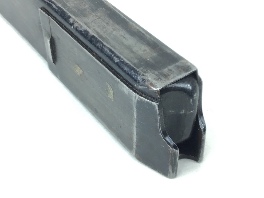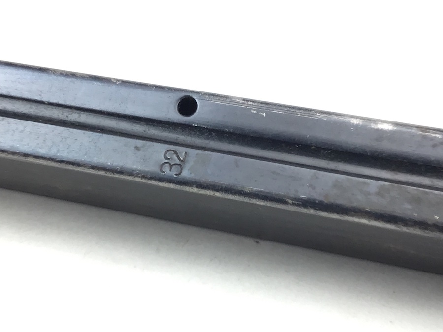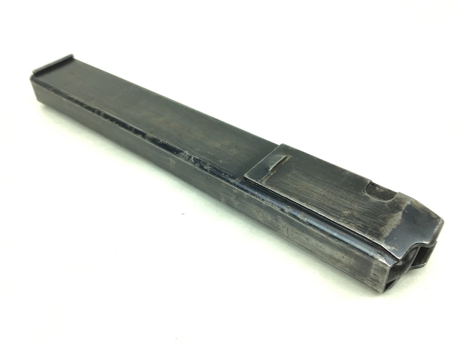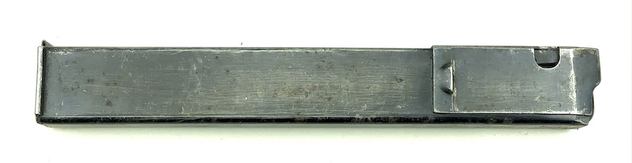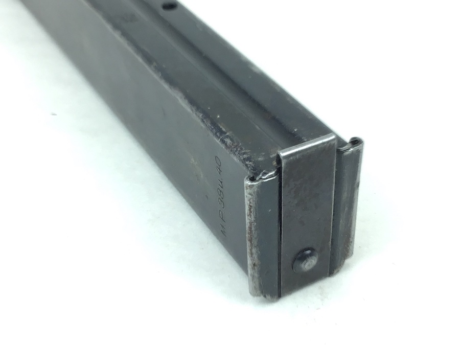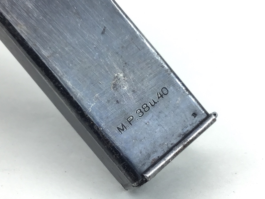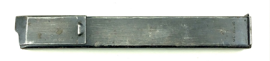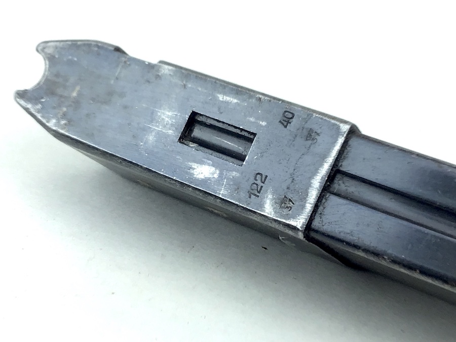 2/25/20 – This is an original, 1940 production WW2 MP.40 magazine. The magazine is the early, more scarce “slab side” style. One side is M.P. 38u.40 stamped. The spine is waffen proofed with Eagle 37 stamps and “122” maker stamped with a ’40 date. The spring is strong and fully functional. The bluing is mostly intact, but there is use wear on the sides.
