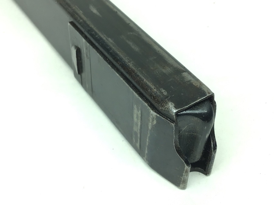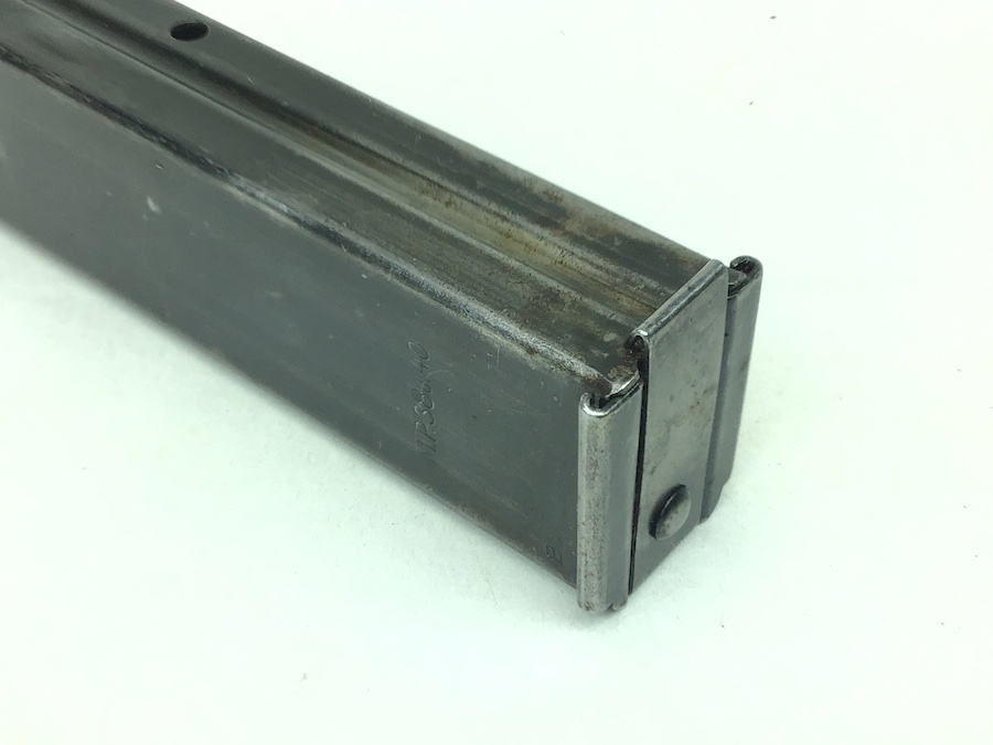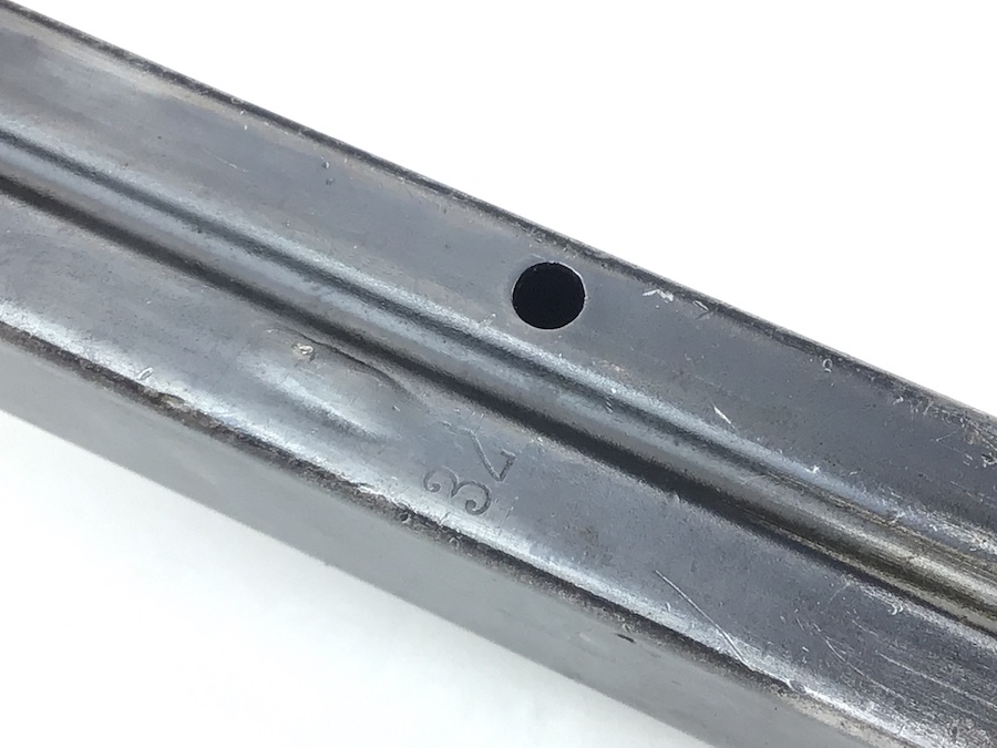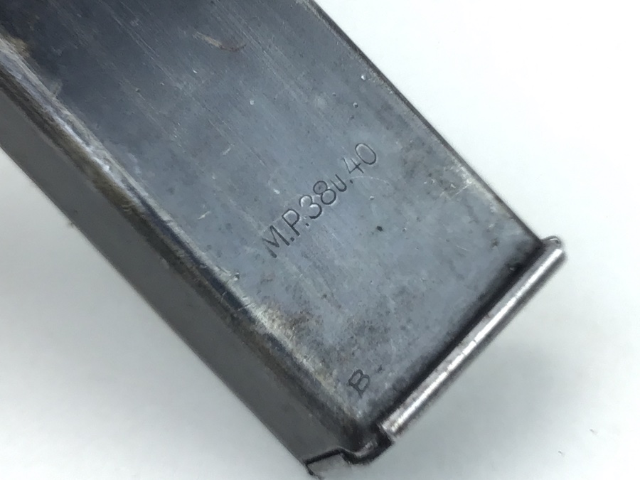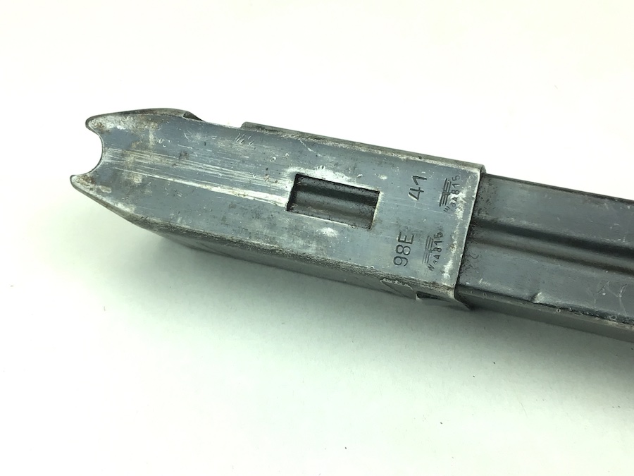 3/19/20 – This is an original, 1941 production WW2 MP.40 magazine. The magazine is the early, more scarce “slab side” style. One side is M.P. 38u.40 stamped. The spine is waffen proofed with WaA815 stamps and “98E” maker stamped with a ’41 date. The spring is strong and fully functional. The bluing is mostly intact, but there is use wear on the sides. There is one very small dimple on the right side. This is very minor and doesn’t affect functionality.