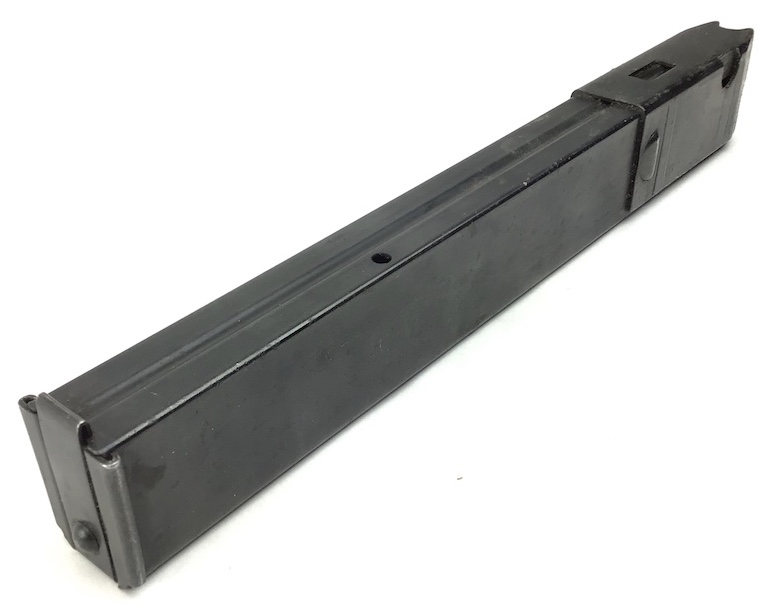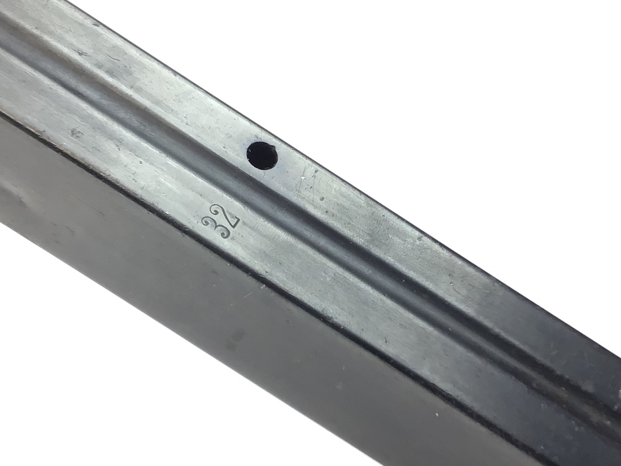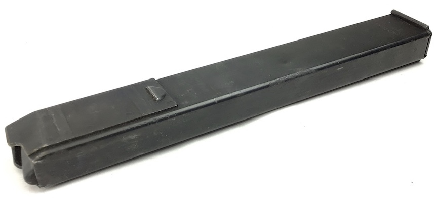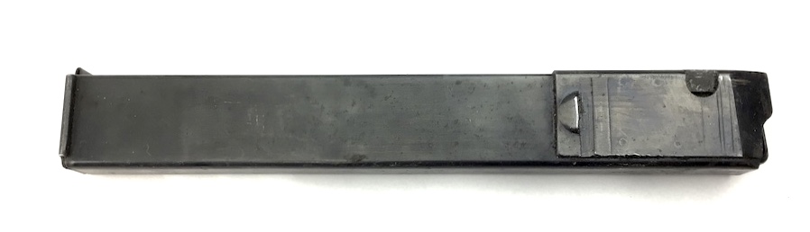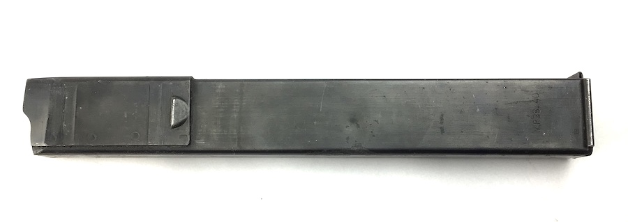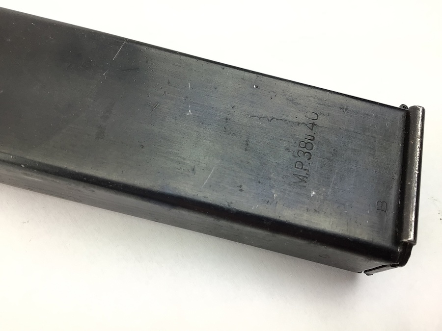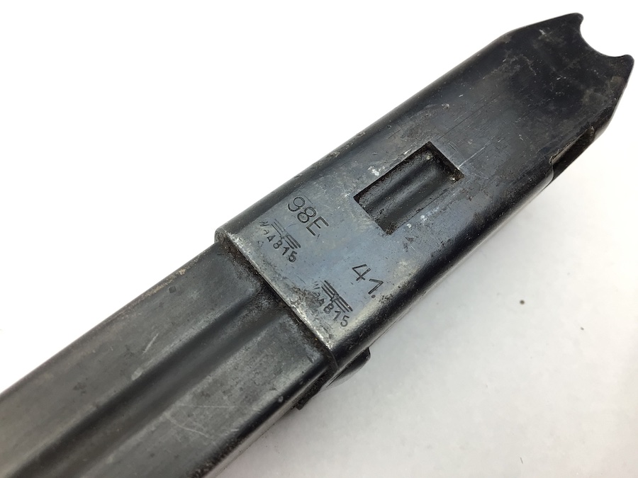 1/25/21 – This is an original, 1941 production WW2 MP.40 magazine. The magazine is the early, more scarce “slab side” style. One side is M.P. 38u.40 stamped. The spine is waffen proofed with WaA815 stamps and “98E” maker stamped with a ’41 date. The spring is strong and fully functional. The bluing is mostly intact, but there is use wear on the sides. There is one very small dimple on the right side. This is very minor and doesn’t affect functionality.