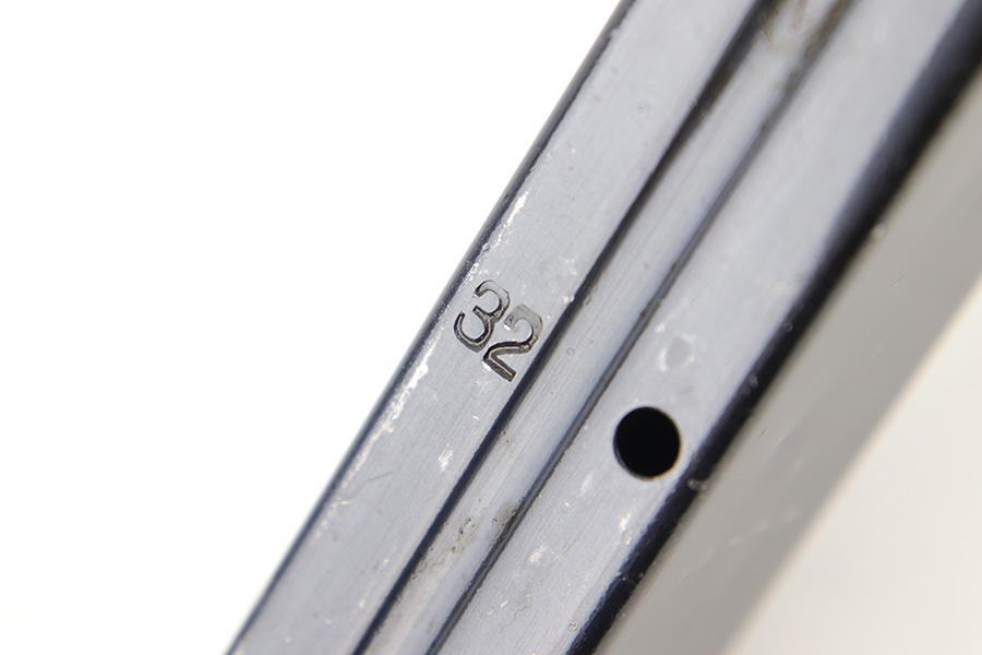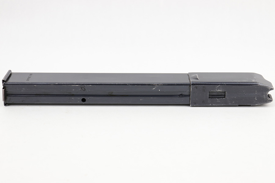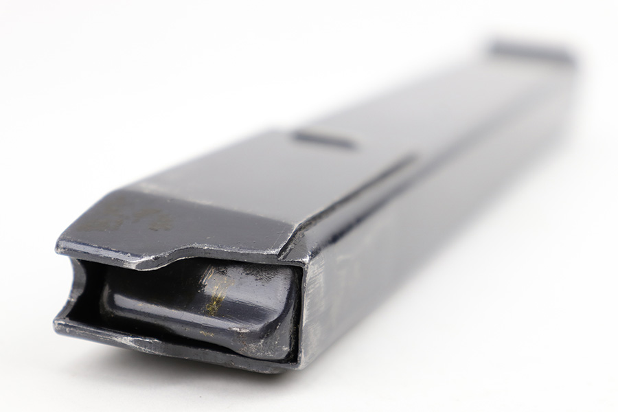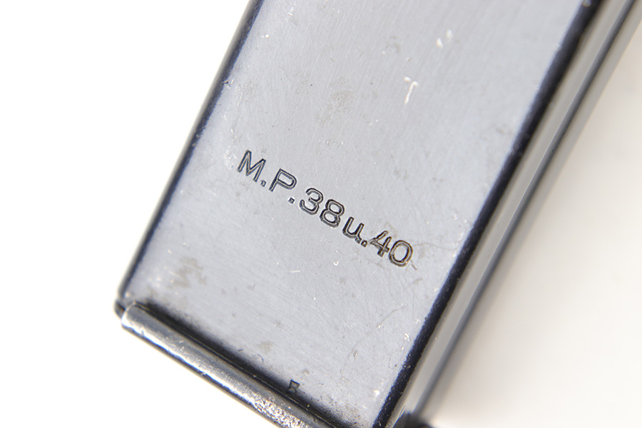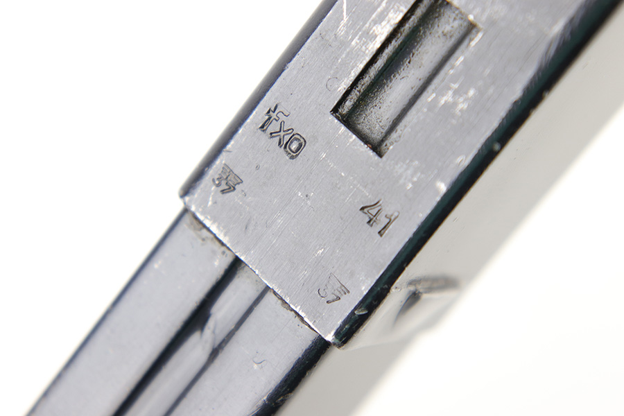 6/28/23 – This is an original 1941 production MP.40 submachine gun magazine with a “slab-side” tube. This is an earlier, more desirable style of tube without ribs in the sides. Excellent overall condition with clean, original bluing throughout. Fully functional with a strong spring. The spine of the magazine is “fxo” maker stamped by Haenel, and stamped with two eagle/37 military proof stamps. There’s also a “41” date stamp, as shown.