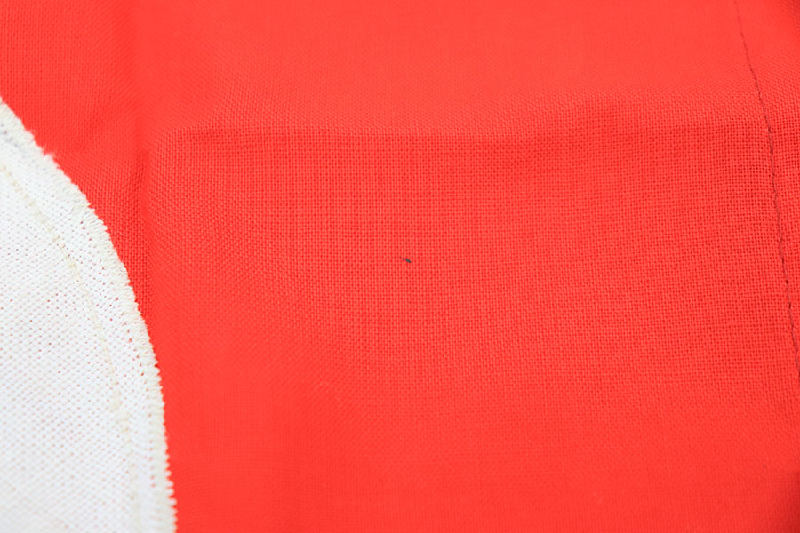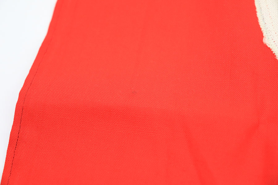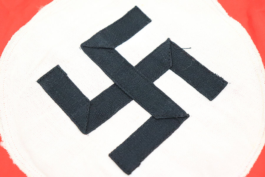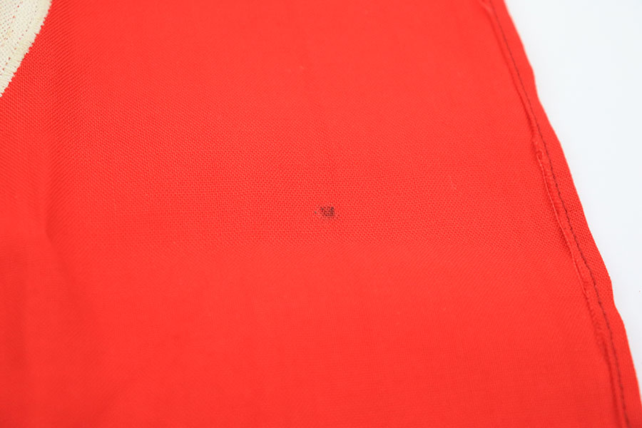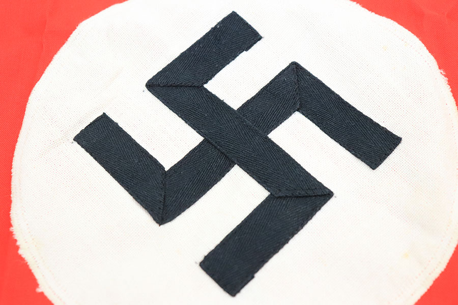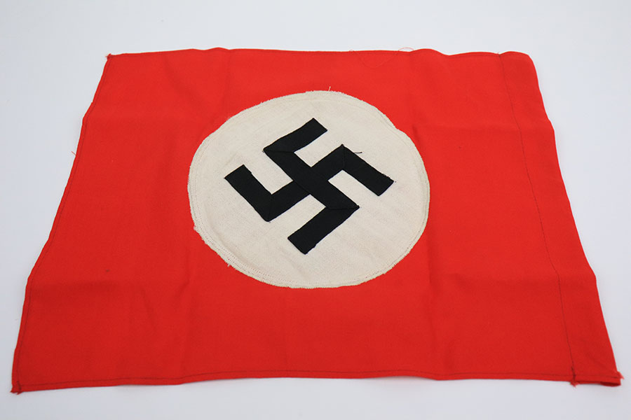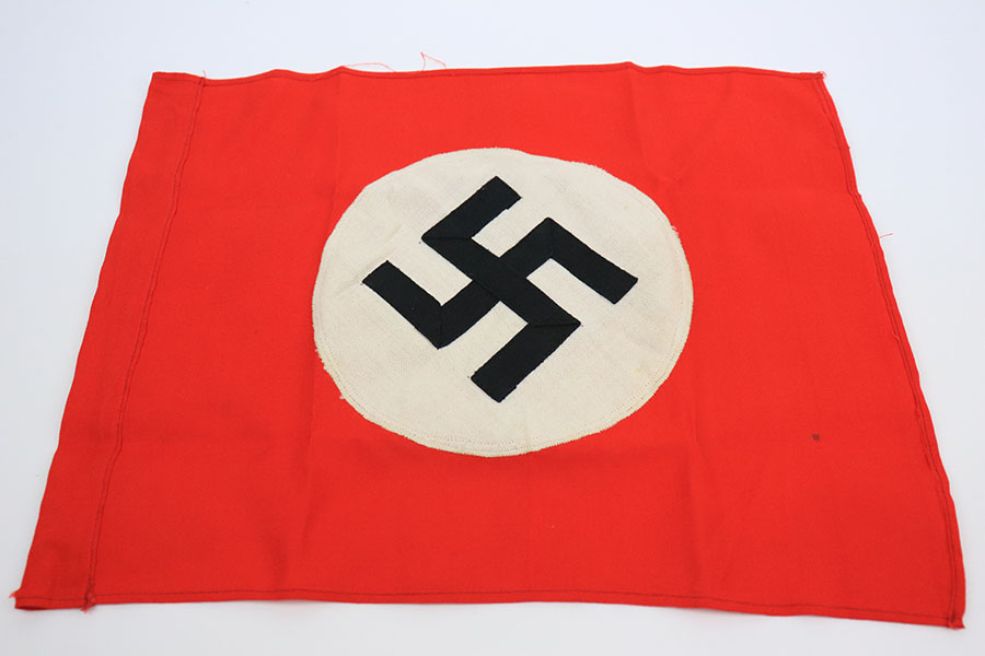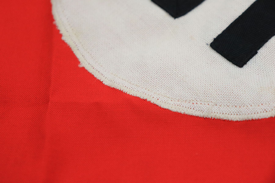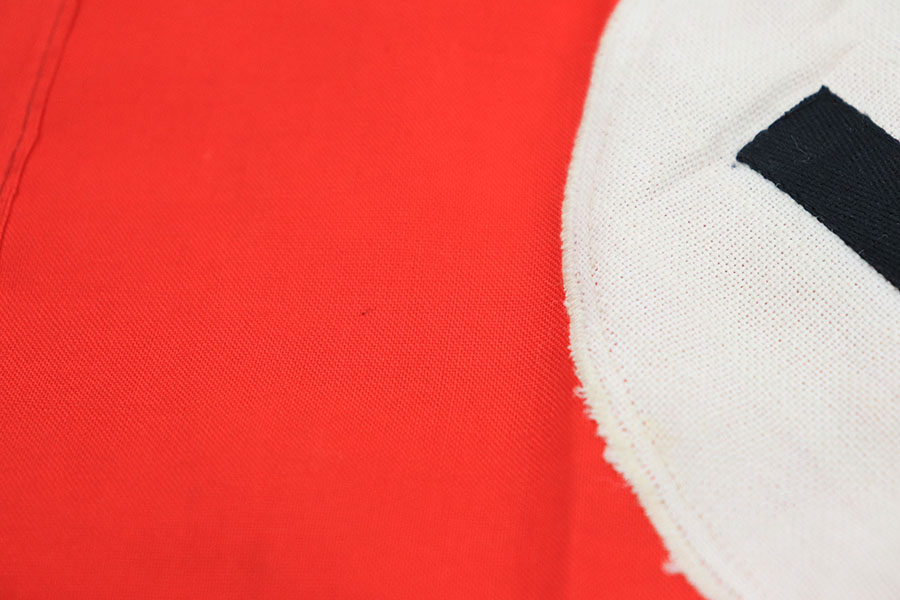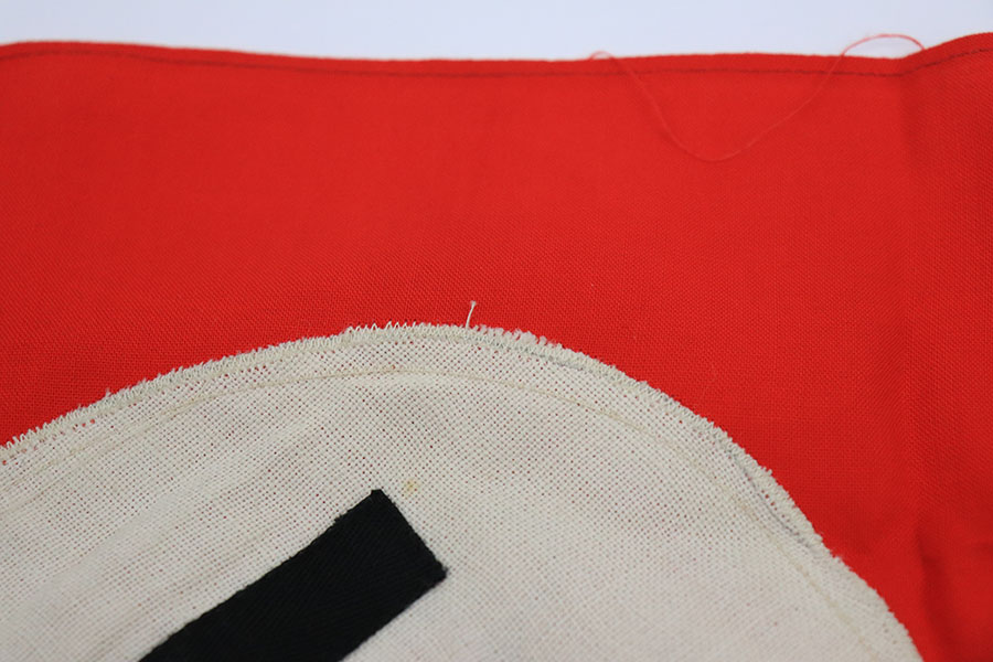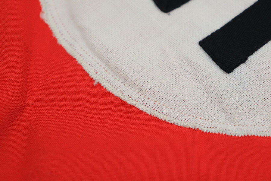10/6/22 – This is a small, approximately 14 x 11 inch Nazi flag. The flag has a sewn-on central circle and sewn-on swastika in the center of each side. The stitching is all intact and in great condition. There is some very mild fraying in a few spots, but generally this flag is excellent. None of the threads glow under a black light. Makes for a nice (small) display.