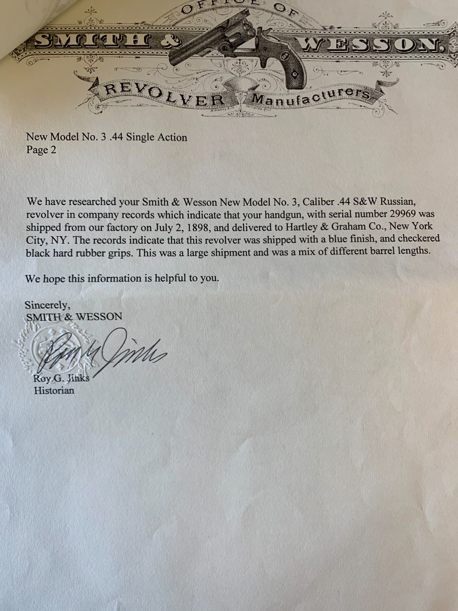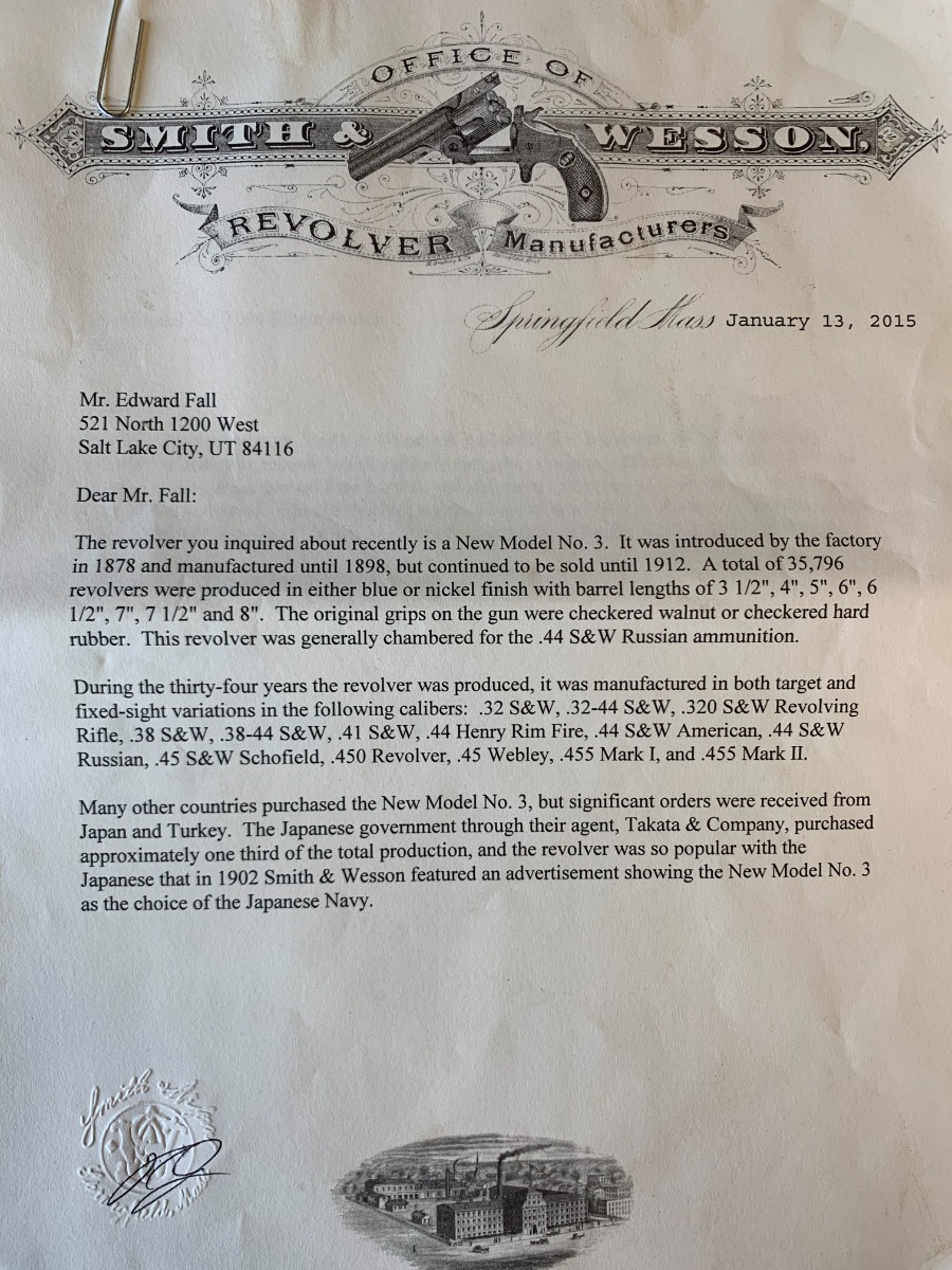 SOLD – Smith and Wesson .44 Russian New Model 3 Revolver – Factory Letter