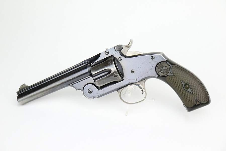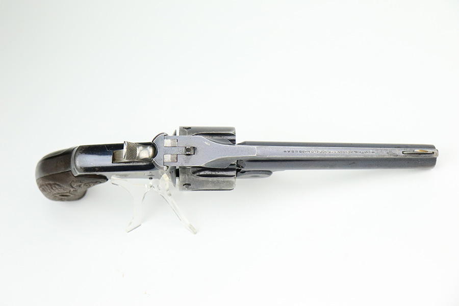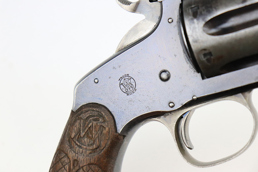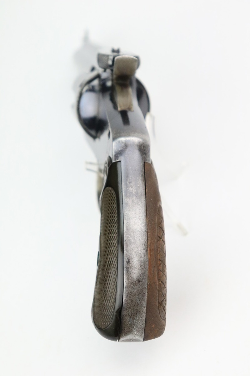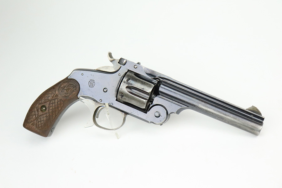 7/14/22 – This is a nice example of a Smith and Wesson New Model 3 revolver, chambered in .44 Russian. According to the included S&W factory letter, this particular example was delivered to the Hartley & Graham Co in New York City on July 2nd of 1898. The gun is all matching and has retained roughly 60% of its original high polish finish. There is spotty wear throughout, but the finish loss is most obvious along the barrel, on the underside of the trigger guard, on the cylinder, and on the grip straps. Very nice bore with great rifling. The grip panels are mismatched, with a wooden right panel and a hard rubber left panel.