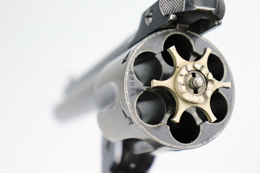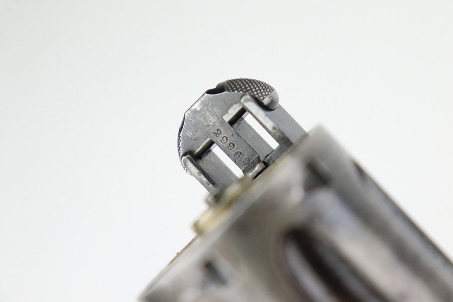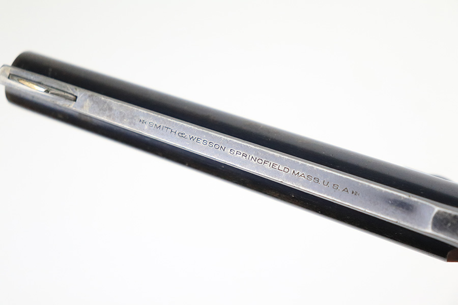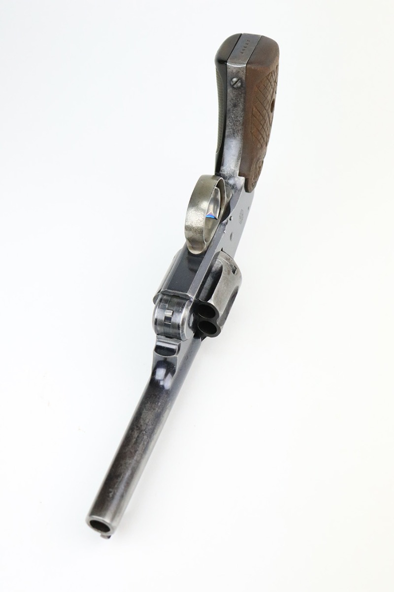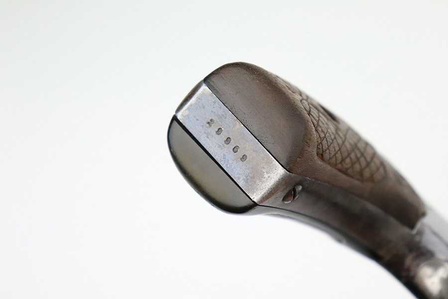 7/14/22 – This is a nice example of a Smith and Wesson New Model 3 revolver, chambered in .44 Russian. According to the included S&W factory letter, this particular example was delivered to the Hartley & Graham Co in New York City on July 2nd of 1898. The gun is all matching and has retained roughly 60% of its original high polish finish. There is spotty wear throughout, but the finish loss is most obvious along the barrel, on the underside of the trigger guard, on the cylinder, and on the grip straps. Very nice bore with great rifling. The grip panels are mismatched, with a wooden right panel and a hard rubber left panel.