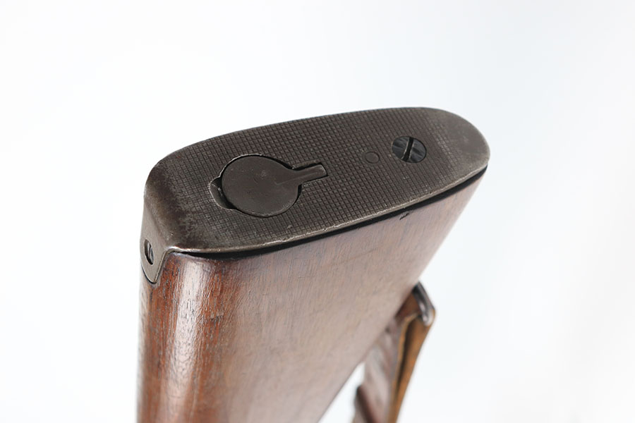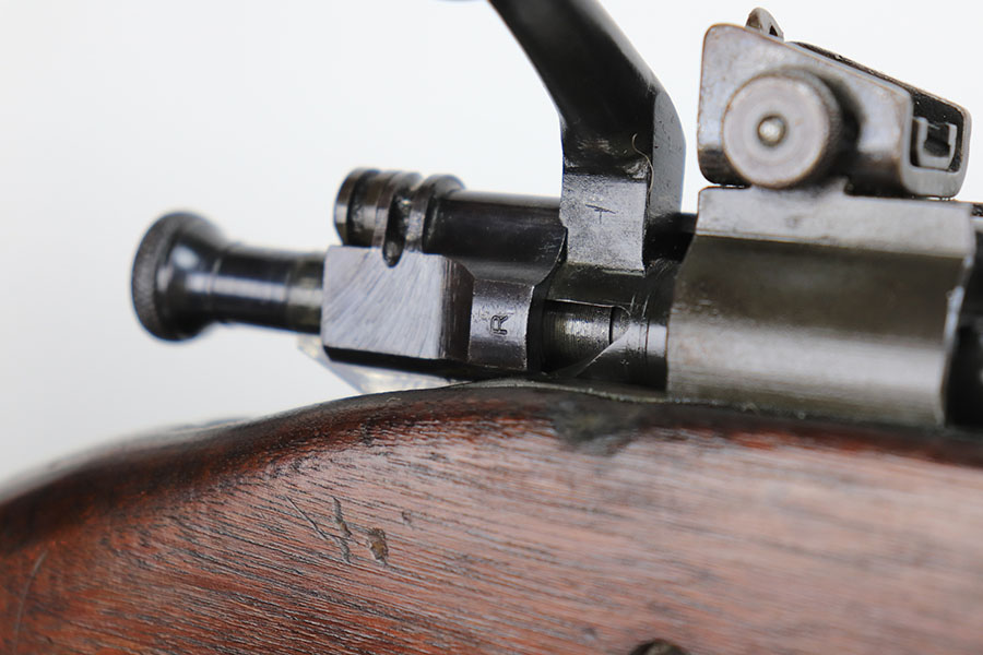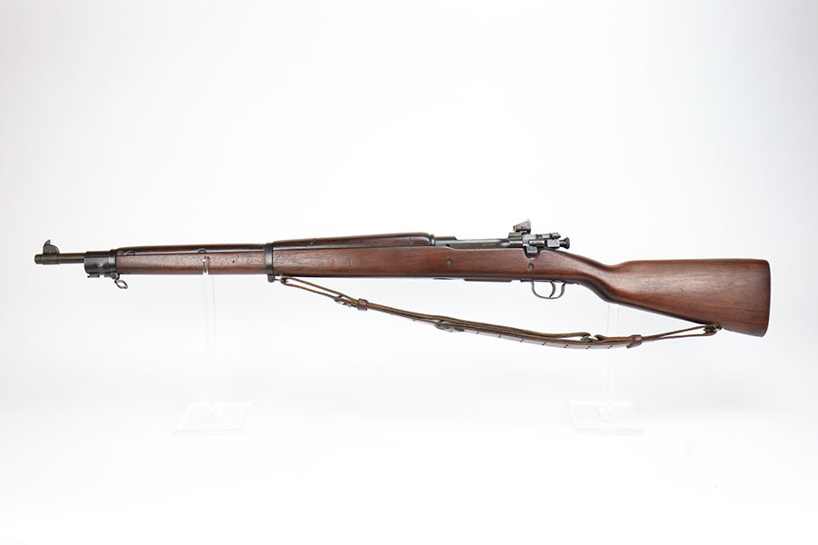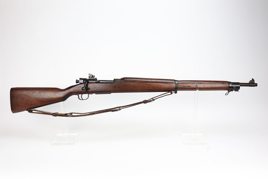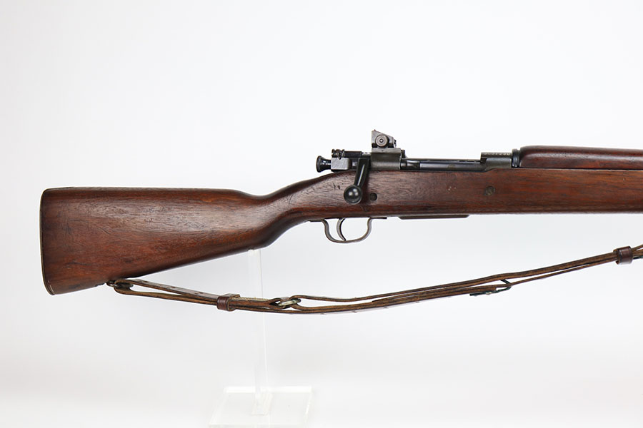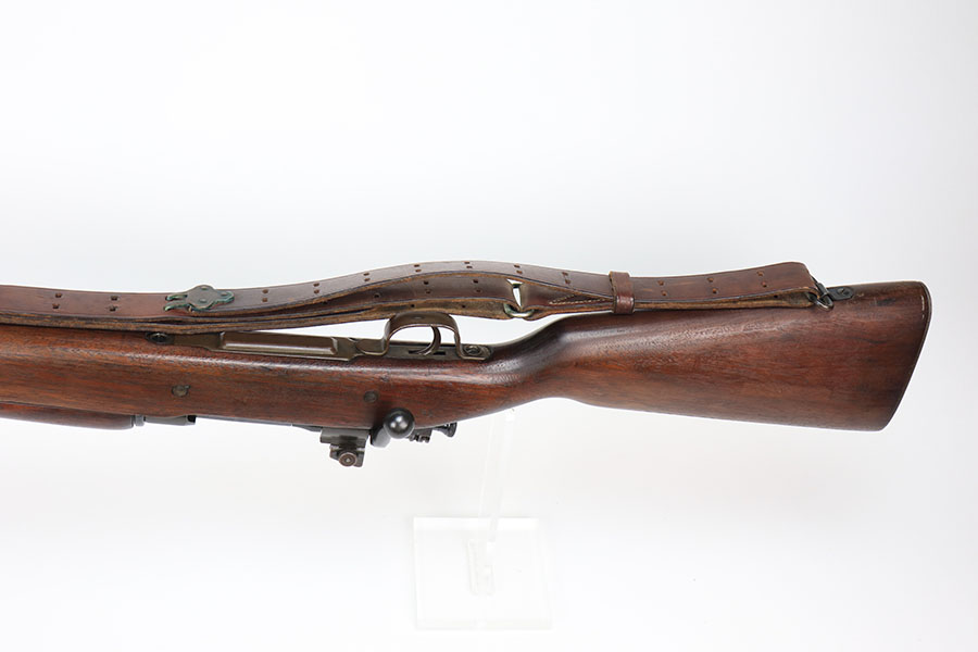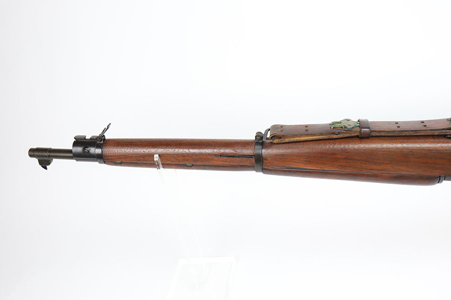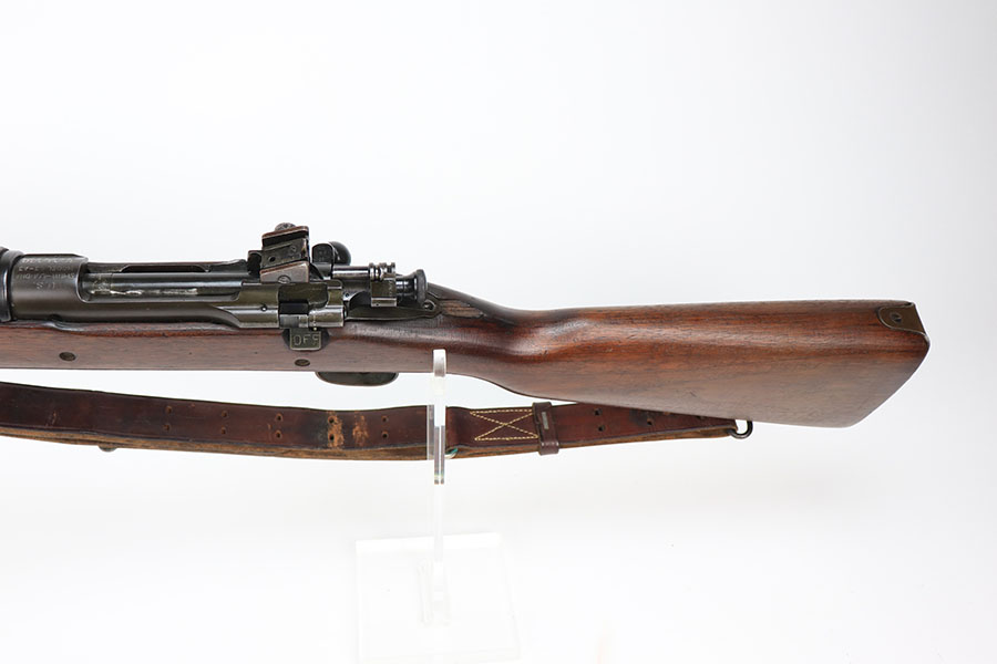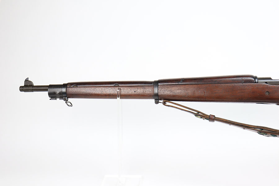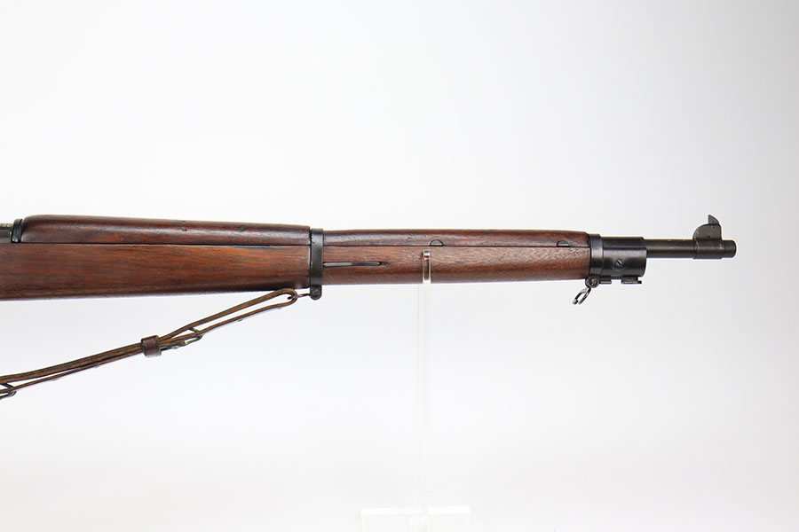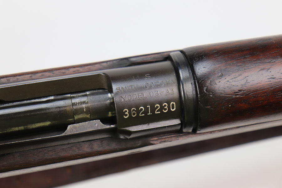 1/19/21 – This is a 1944 production Smith-Corona 03-A3 rifle from the end of WW2. The rifle has a 1944 Remington barrel, which is correct for a Smith-Corona. The stock appears to be a field replacement (based on the shape / style) and there are no inspector proofs or stamps on the wood. The metal parts have some browned patina, mostly on the floorplate and trigger guard. the barrel, receiver, and barrel bands are in great overall condition with some mild wear. the bore has light signs of use with minor wear in the grooves, but good shape overall rating at 8.5/10. Comes with a Bucheimer leather sling.