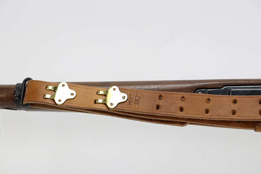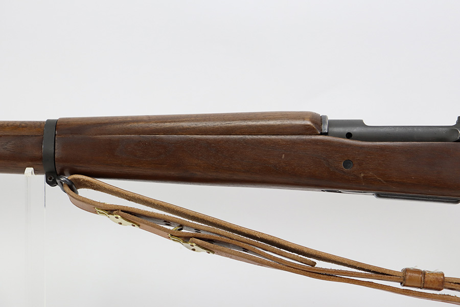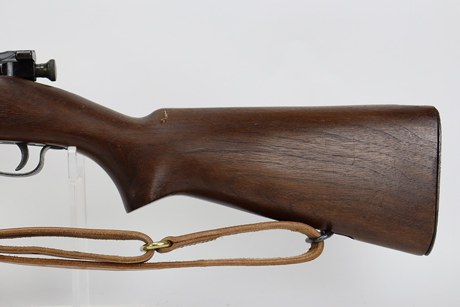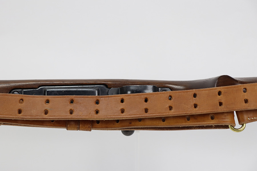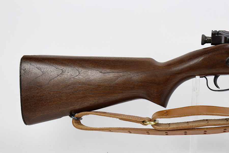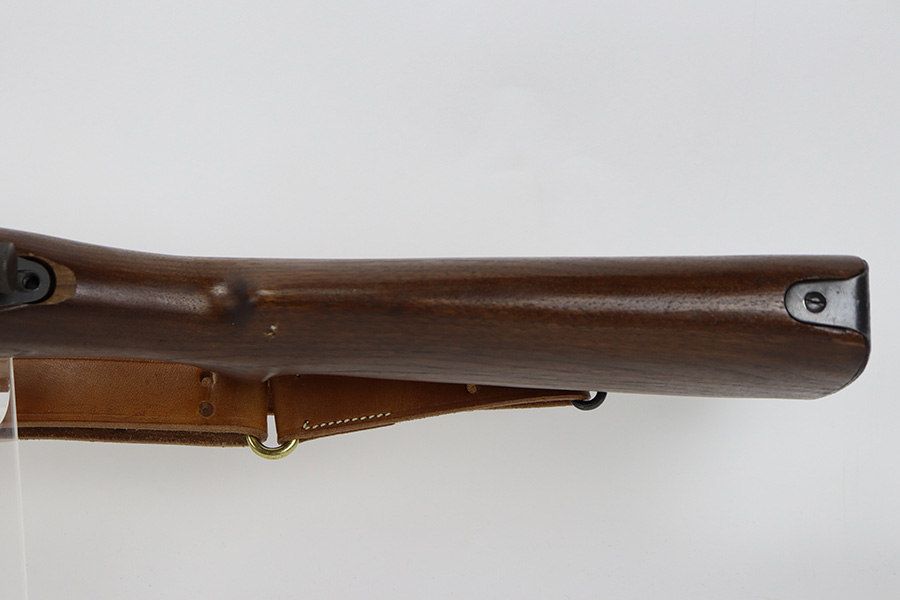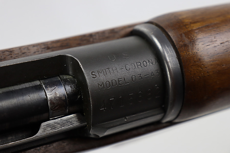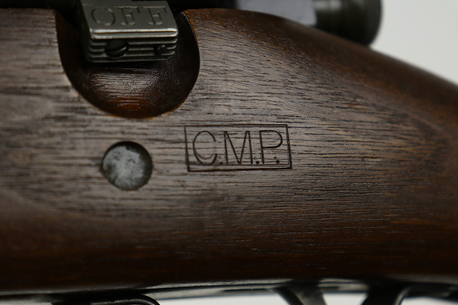 7/21/23 – This is a WW2 original 1903-A3 by Smith Corona that was arsenal refurbished after WW2. The refurbish included replacing the stock and refinishing the metal, leaving the rifle in the condition we find it today. The rifle still has the original 1943 dated Smith Corona barrel however, and the bore is in near-mint condition with only traces of patina around the edges of the grooves. The metal rates at around 90% overall condition due to some light finish loss on the bolt, rear sight, muzzle area, barrel bands, and magazine floorplate / trigger guard. This is light finish loss, and there are no areas of dark discoloration, rust, or pitting. The stock is in excellent condition with only a few small dents and dings. The left side of the stock is “CMP” arsenal stamped as shown. Comes with a reproduction 1917 dated Hoyt leather sling.