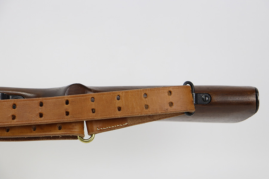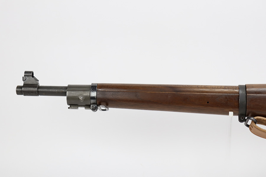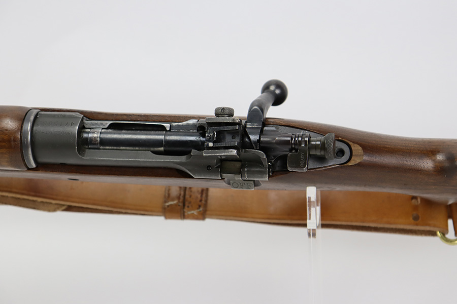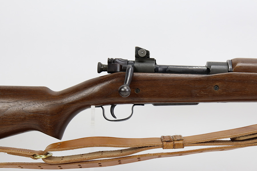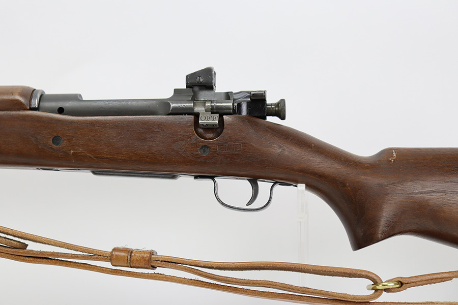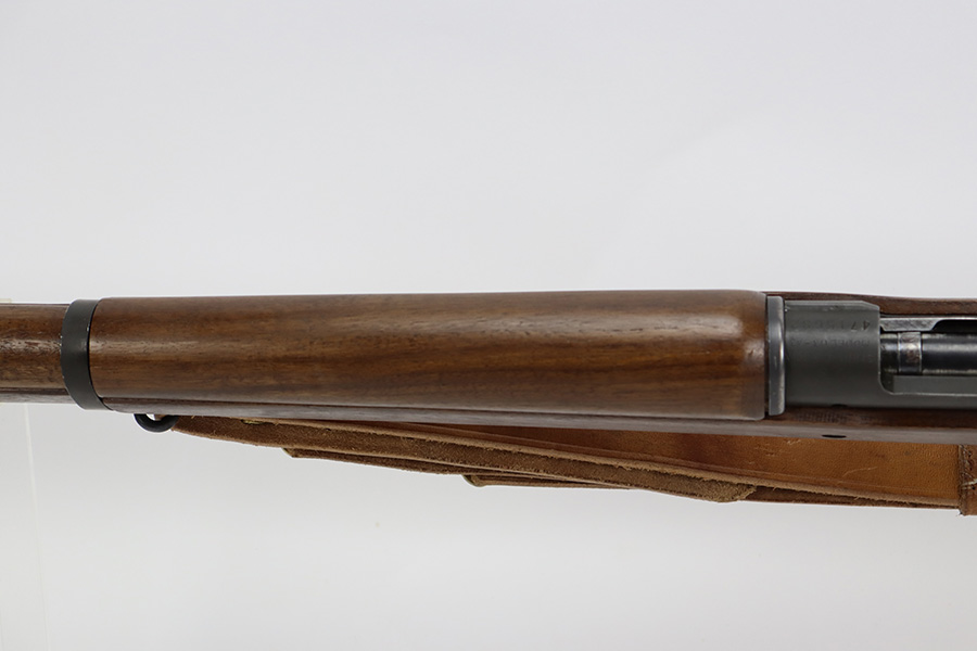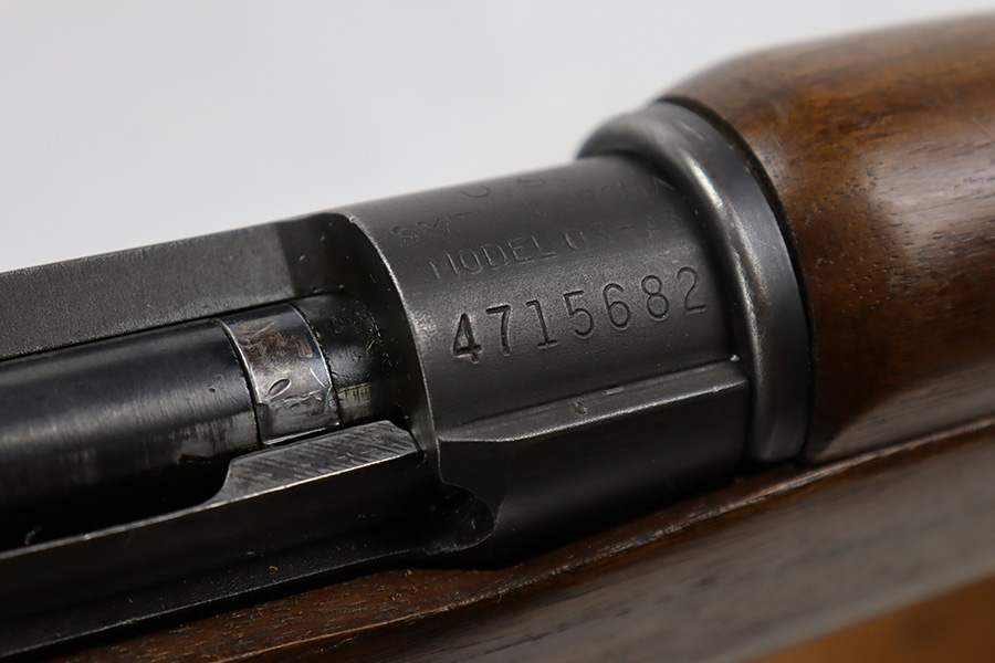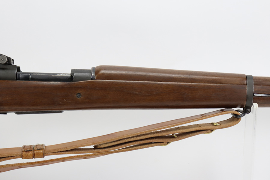 7/21/23 – This is a WW2 original 1903-A3 by Smith Corona that was arsenal refurbished after WW2. The refurbish included replacing the stock and refinishing the metal, leaving the rifle in the condition we find it today. The rifle still has the original 1943 dated Smith Corona barrel however, and the bore is in near-mint condition with only traces of patina around the edges of the grooves. The metal rates at around 90% overall condition due to some light finish loss on the bolt, rear sight, muzzle area, barrel bands, and magazine floorplate / trigger guard. This is light finish loss, and there are no areas of dark discoloration, rust, or pitting. The stock is in excellent condition with only a few small dents and dings. The left side of the stock is “CMP” arsenal stamped as shown. Comes with a reproduction 1917 dated Hoyt leather sling.