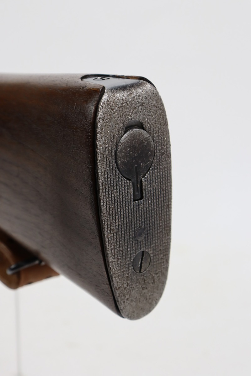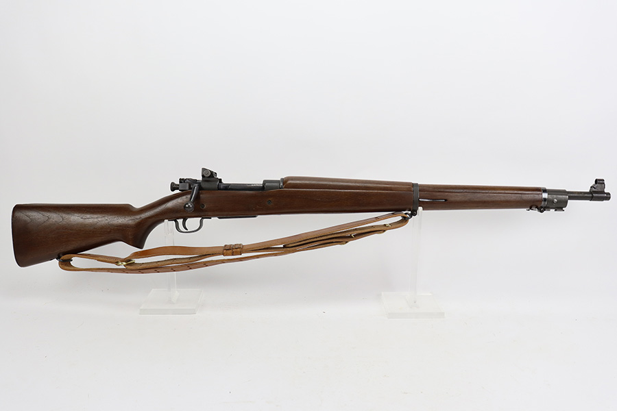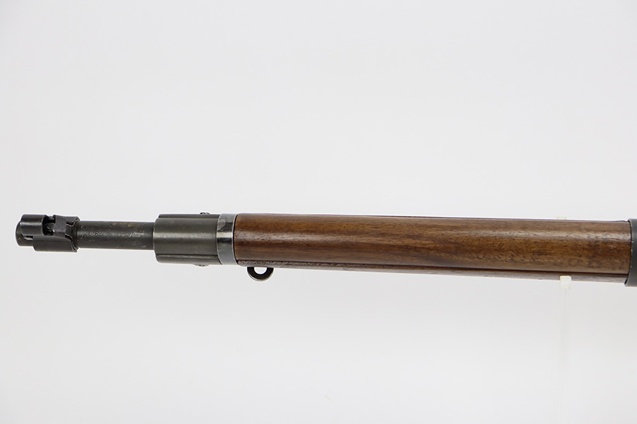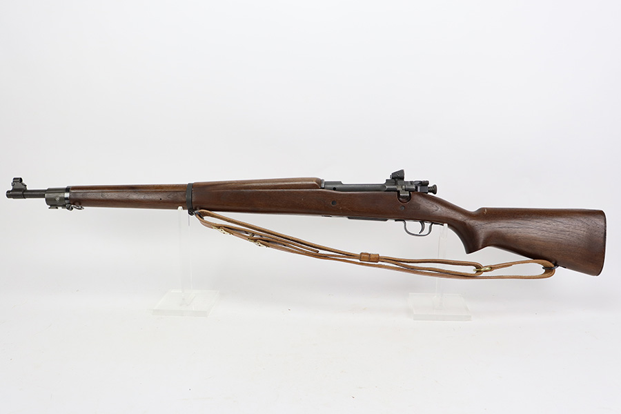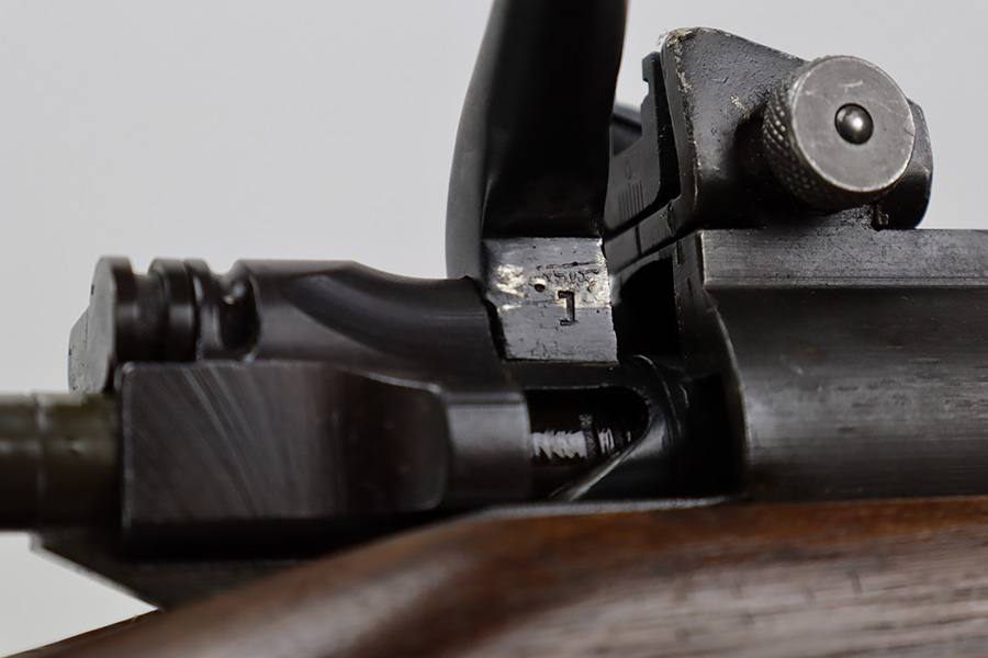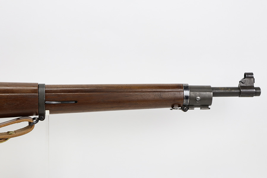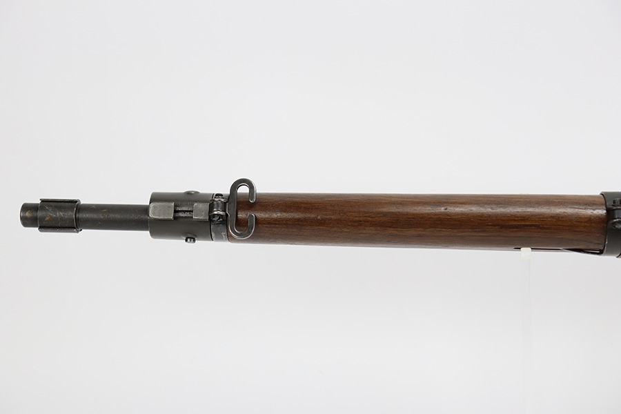 7/21/23 – This is a WW2 original 1903-A3 by Smith Corona that was arsenal refurbished after WW2. The refurbish included replacing the stock and refinishing the metal, leaving the rifle in the condition we find it today. The rifle still has the original 1943 dated Smith Corona barrel however, and the bore is in near-mint condition with only traces of patina around the edges of the grooves. The metal rates at around 90% overall condition due to some light finish loss on the bolt, rear sight, muzzle area, barrel bands, and magazine floorplate / trigger guard. This is light finish loss, and there are no areas of dark discoloration, rust, or pitting. The stock is in excellent condition with only a few small dents and dings. The left side of the stock is “CMP” arsenal stamped as shown. Comes with a reproduction 1917 dated Hoyt leather sling.