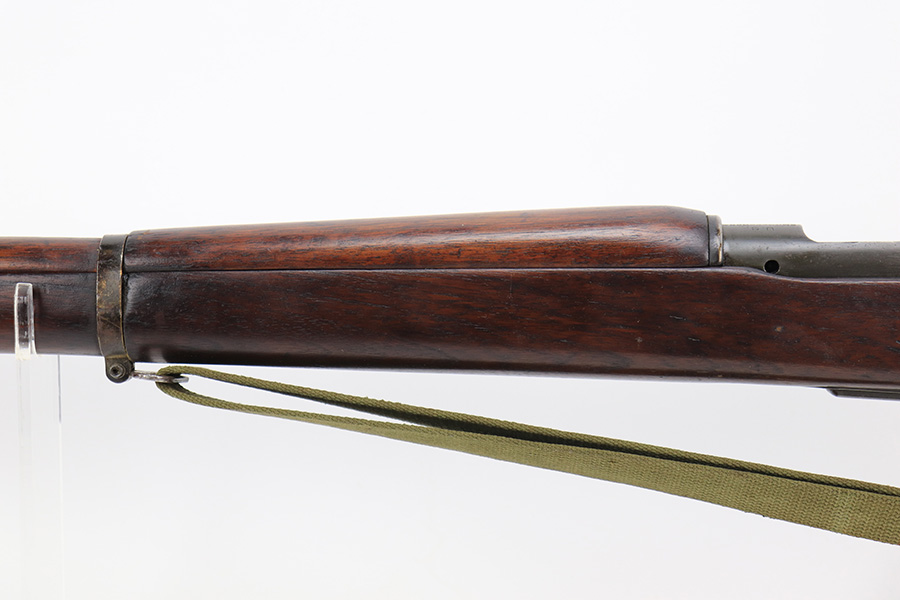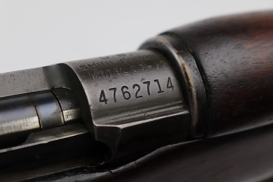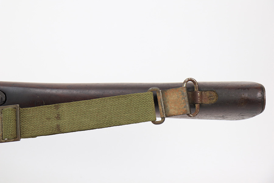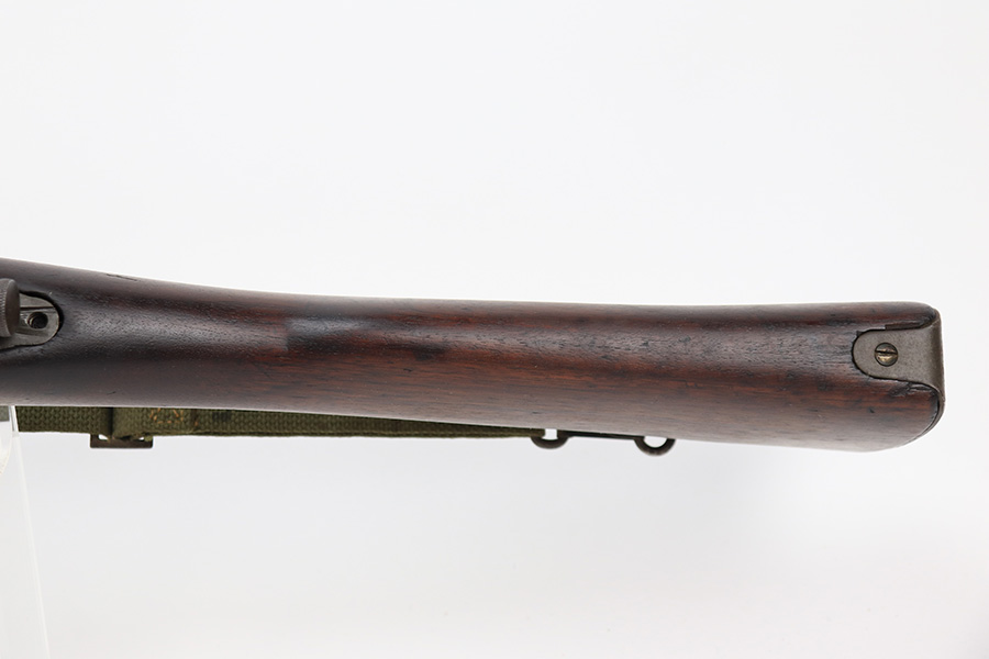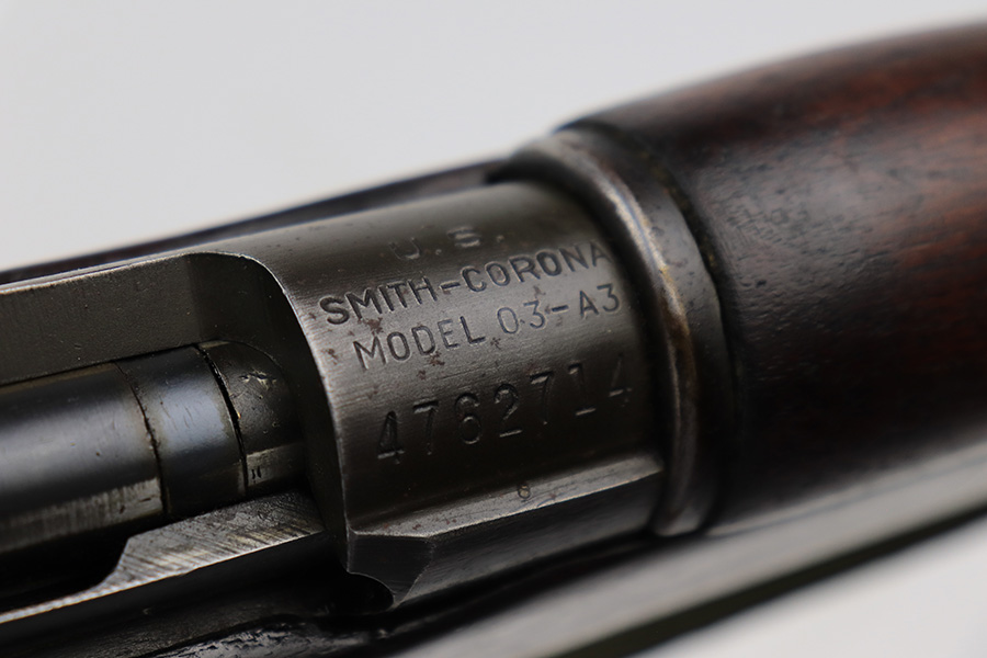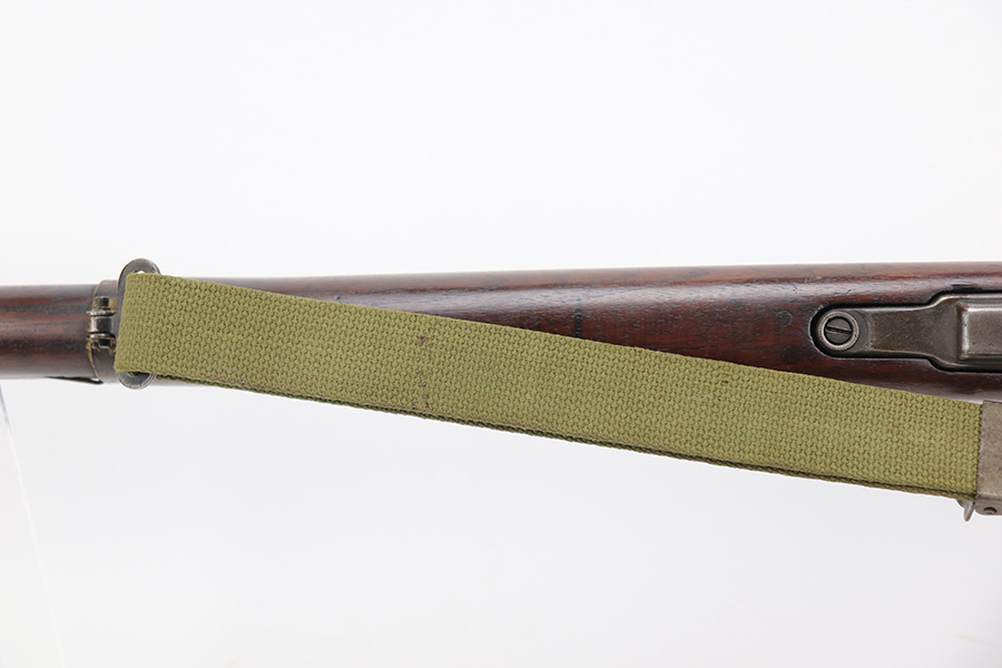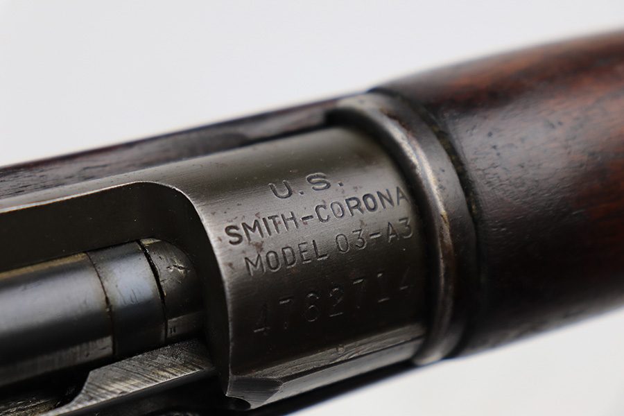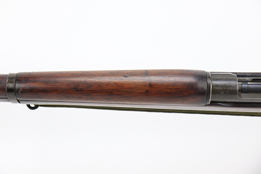 5/10/23 – This is a very nice example of a Smith-Corona Model 03-A3 rifle issued to the US military in 1943-44. The barrel is “SC” marked and dated August of 1943. Very faint “FJA” military inspection stamp on the left side of the stock. The gun comes with a green canvas sling and a front sight hood. This is an arsenal-refurbished example. The metal parts have retained roughly 90% of their finish. There is general high edge wear, some spotty discoloration on the barrel bands, and areas of thinning on the floor plate / trigger group and on the bolt handle. Some light spotty oxidation and some small dots of surface rust on the bolt handle and around the rear sight. The wood furniture is excellent but has been sanded. Very nice bore with good rifling.