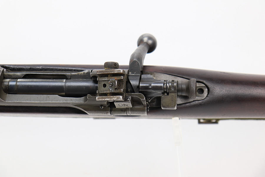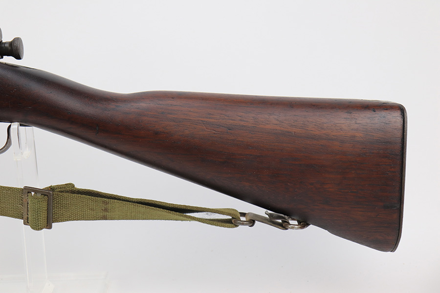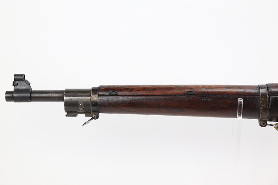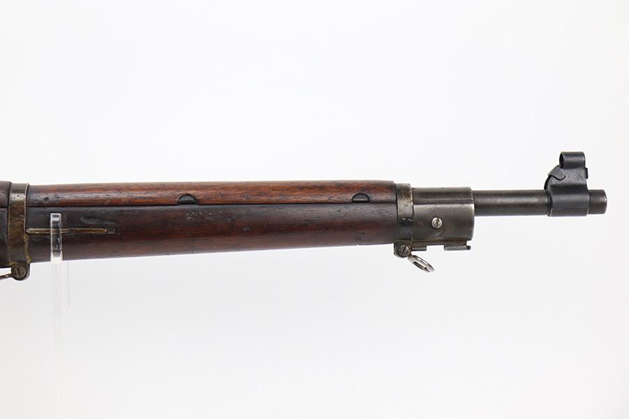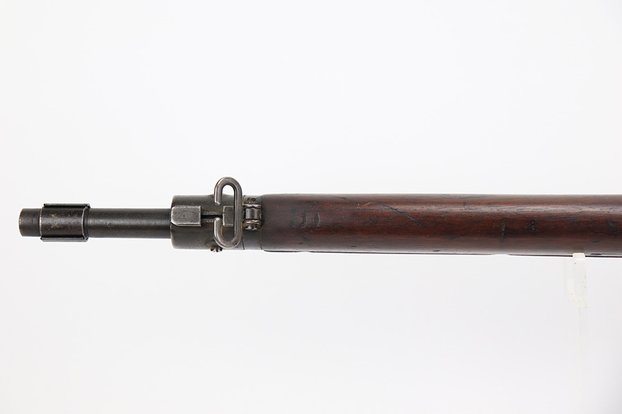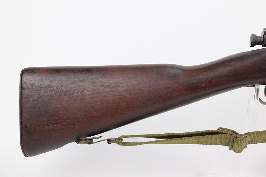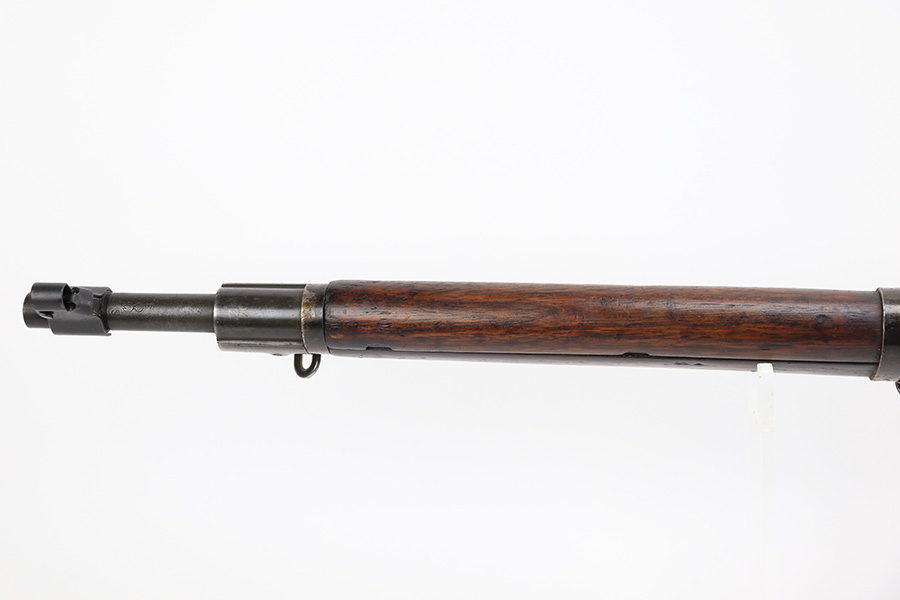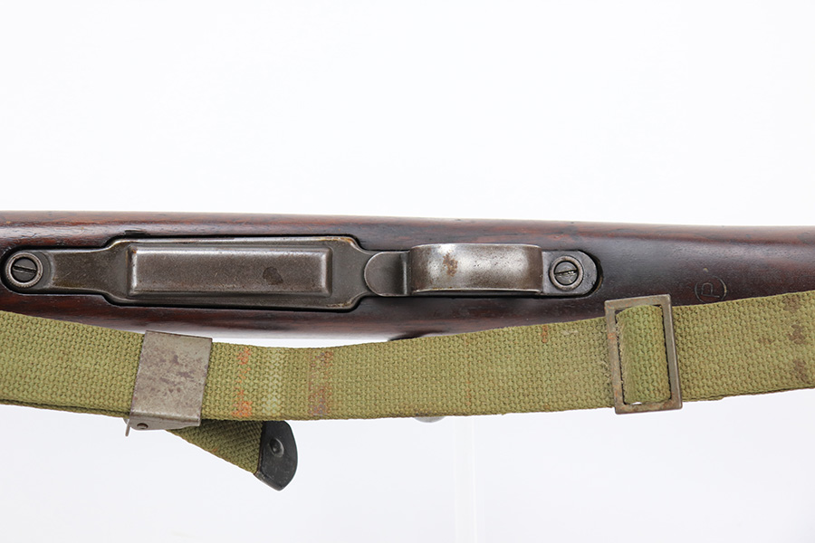 5/10/23 – This is a very nice example of a Smith-Corona Model 03-A3 rifle issued to the US military in 1943-44. The barrel is “SC” marked and dated August of 1943. Very faint “FJA” military inspection stamp on the left side of the stock. The gun comes with a green canvas sling and a front sight hood. This is an arsenal-refurbished example. The metal parts have retained roughly 90% of their finish. There is general high edge wear, some spotty discoloration on the barrel bands, and areas of thinning on the floor plate / trigger group and on the bolt handle. Some light spotty oxidation and some small dots of surface rust on the bolt handle and around the rear sight. The wood furniture is excellent but has been sanded. Very nice bore with good rifling.