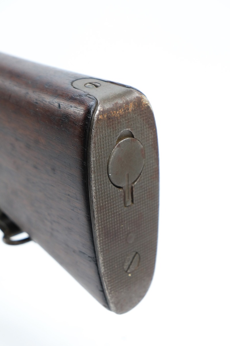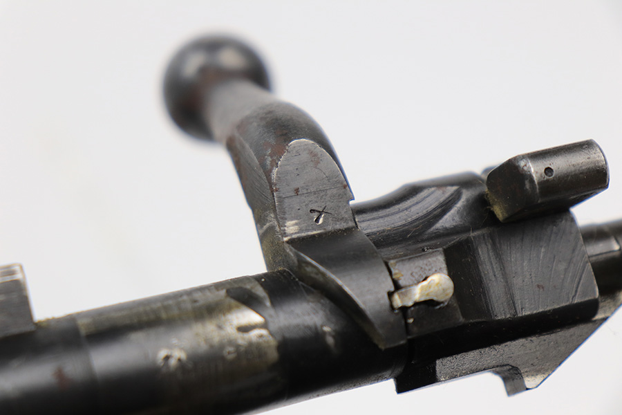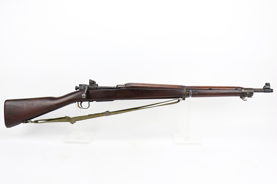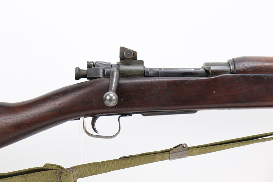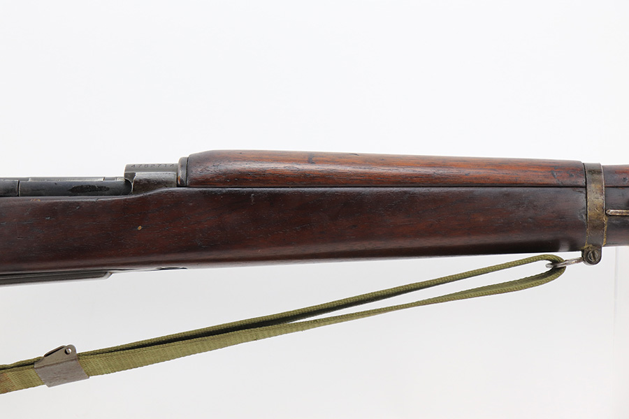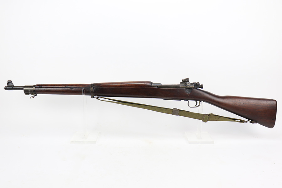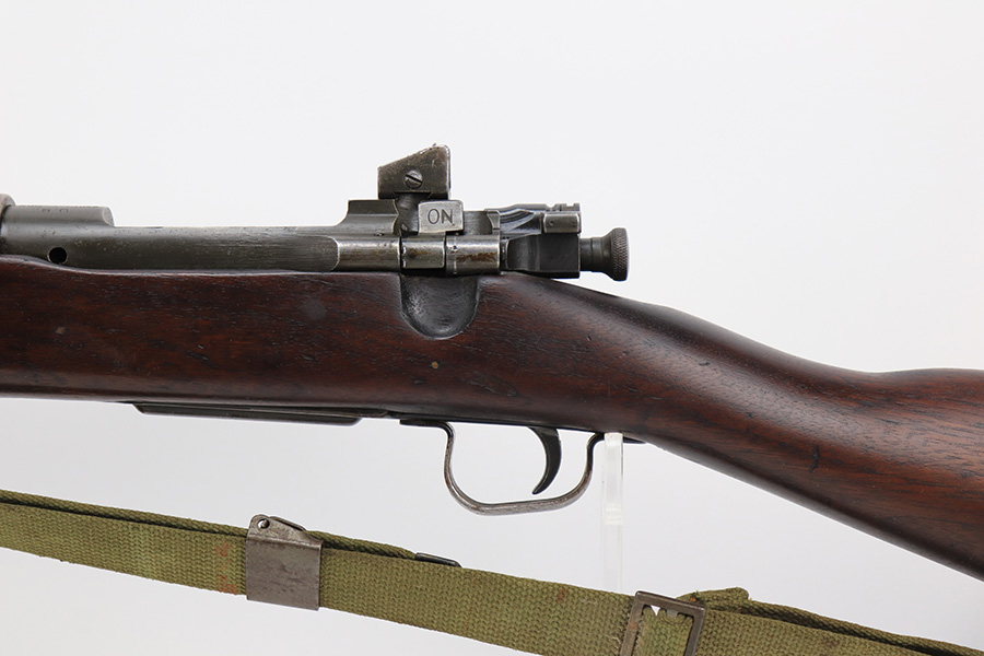 5/10/23 – This is a very nice example of a Smith-Corona Model 03-A3 rifle issued to the US military in 1943-44. The barrel is “SC” marked and dated August of 1943. Very faint “FJA” military inspection stamp on the left side of the stock. The gun comes with a green canvas sling and a front sight hood. This is an arsenal-refurbished example. The metal parts have retained roughly 90% of their finish. There is general high edge wear, some spotty discoloration on the barrel bands, and areas of thinning on the floor plate / trigger group and on the bolt handle. Some light spotty oxidation and some small dots of surface rust on the bolt handle and around the rear sight. The wood furniture is excellent but has been sanded. Very nice bore with good rifling.