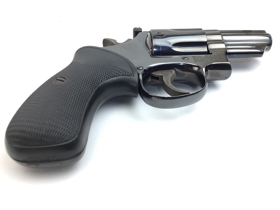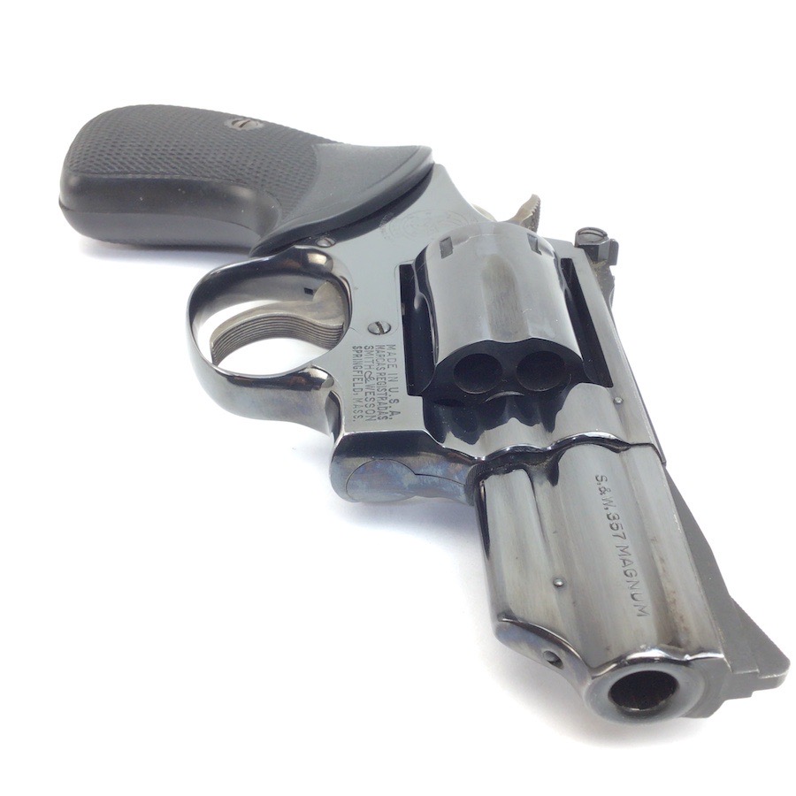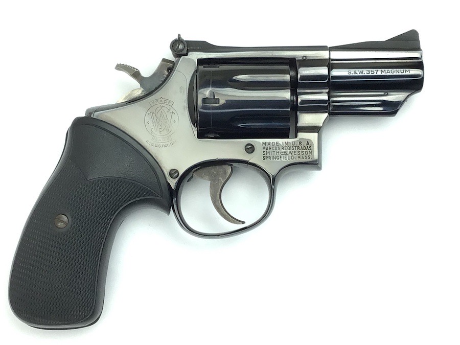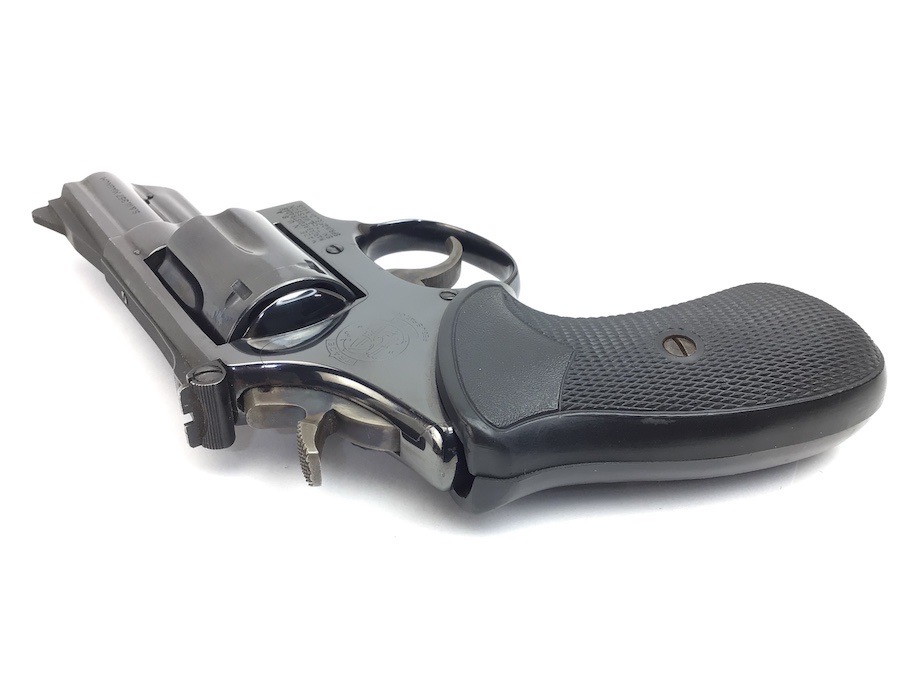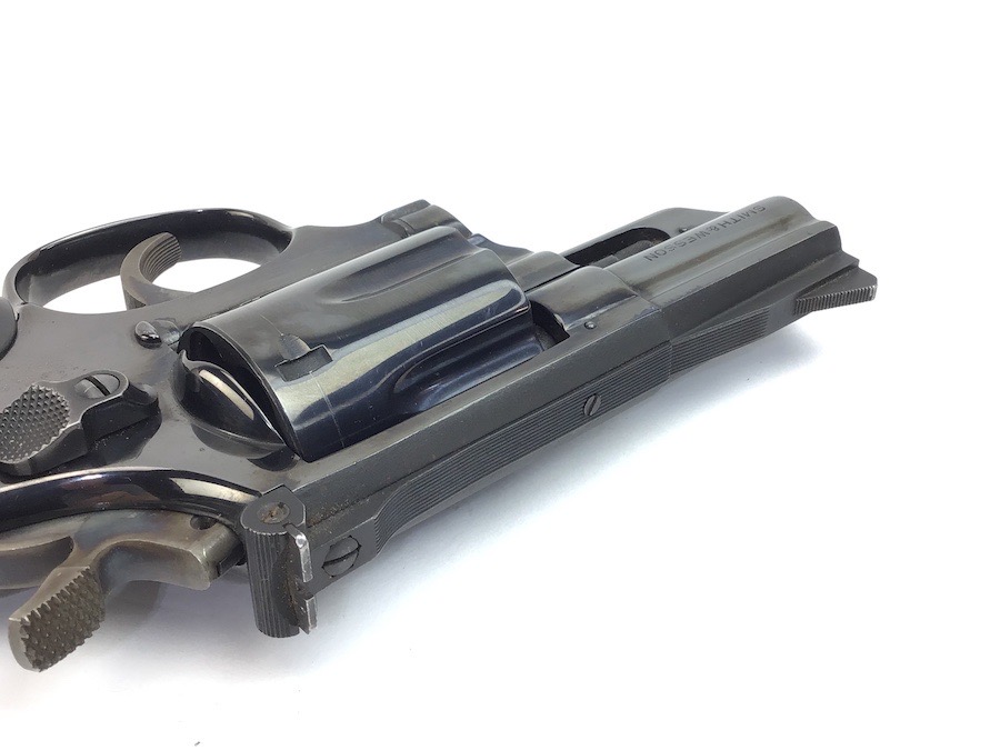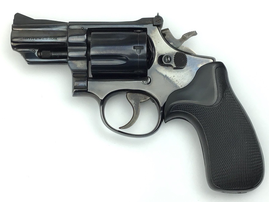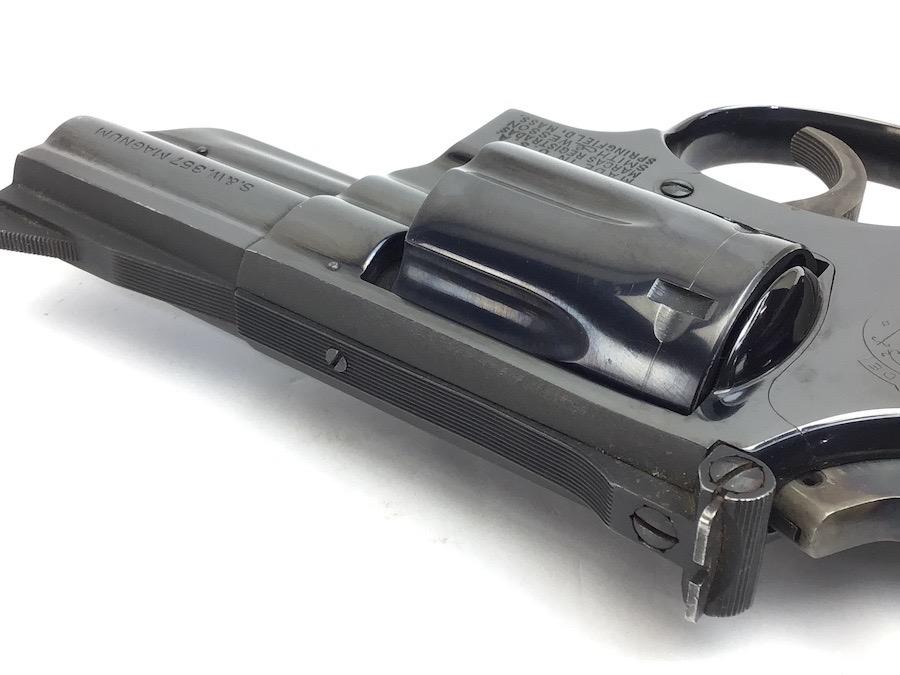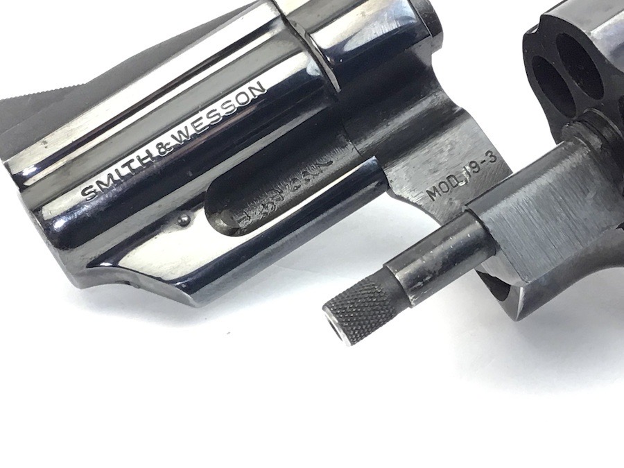 8/11/23 – This is an excellent Smith & Wesson Model 19-3 revolver from 1970. Minor roll mark on the cylinder and tiny blossom of surface pitting near the cylinder release. Excellent t bore and Pachmayr grips. Excellent case hardening on the hammer and trigger. All matching and original. 2.5″ barrel. C&R eligible. Smooth mechanics. Completely functional. Includes a suede leather carry holster.
