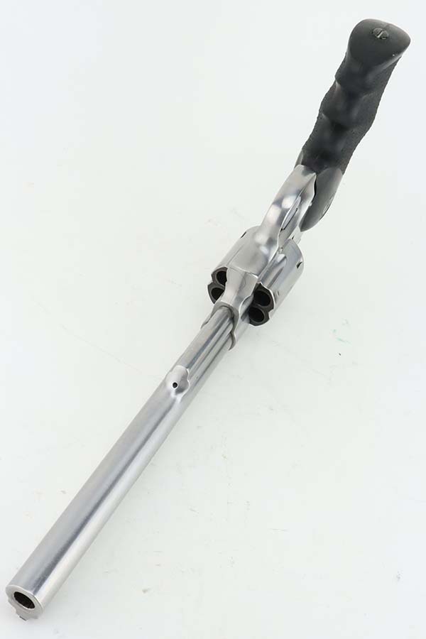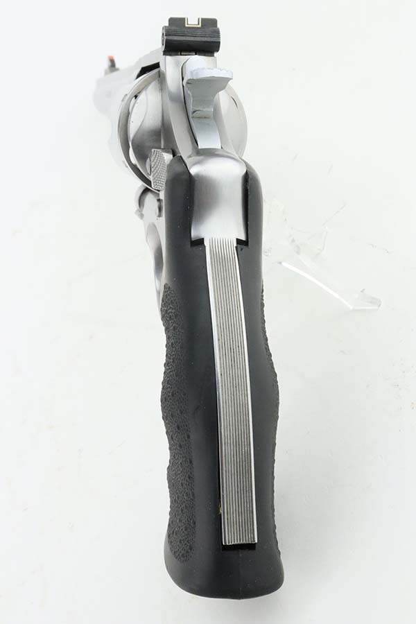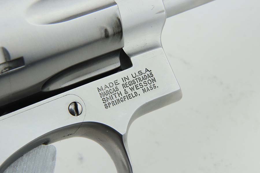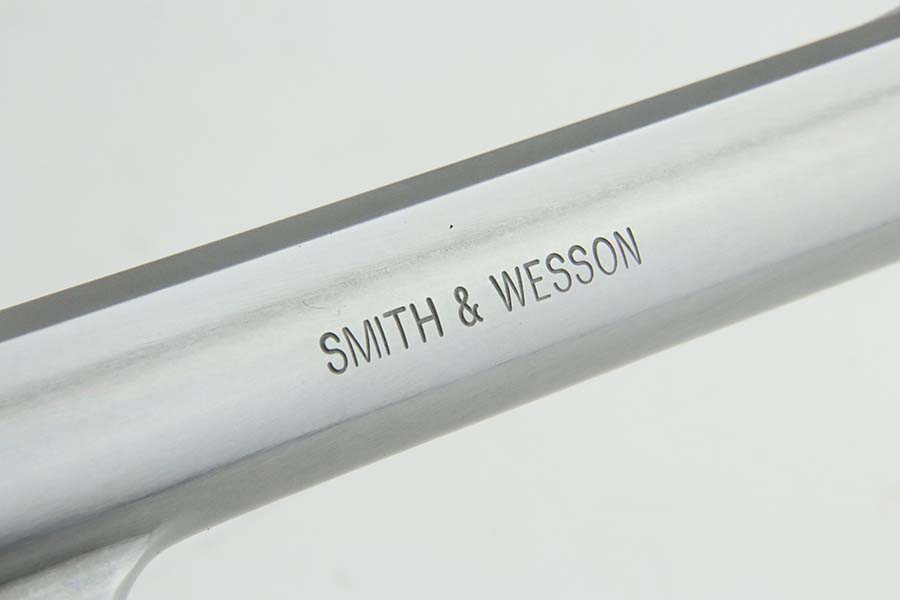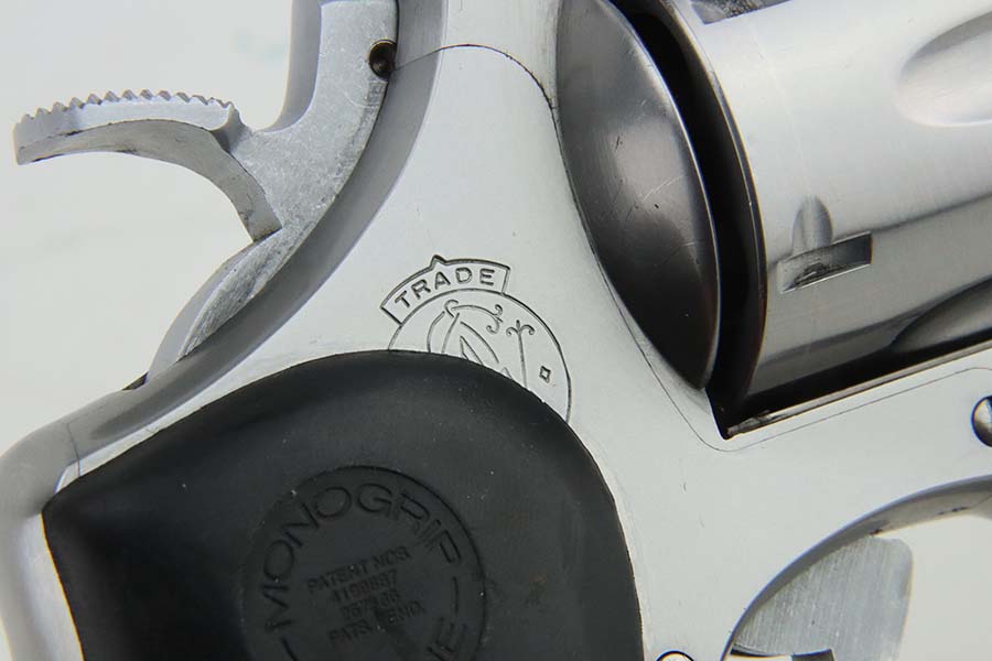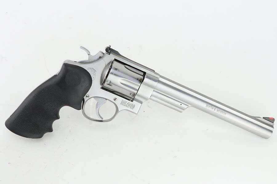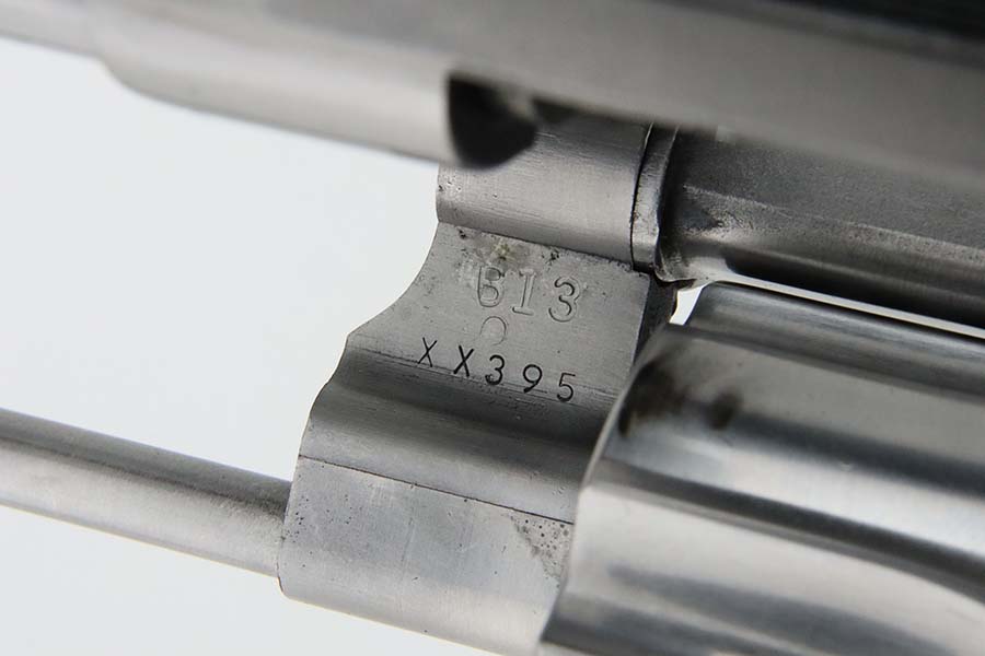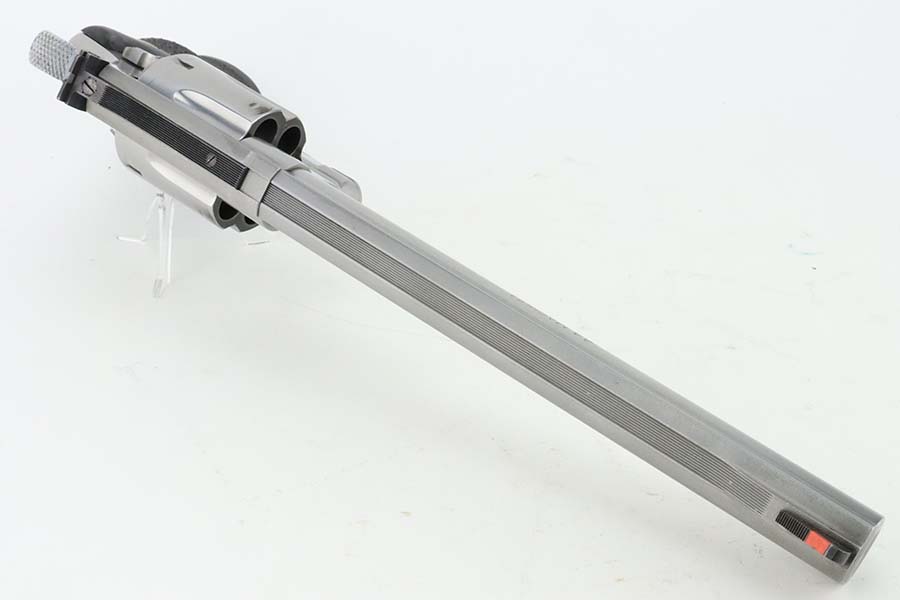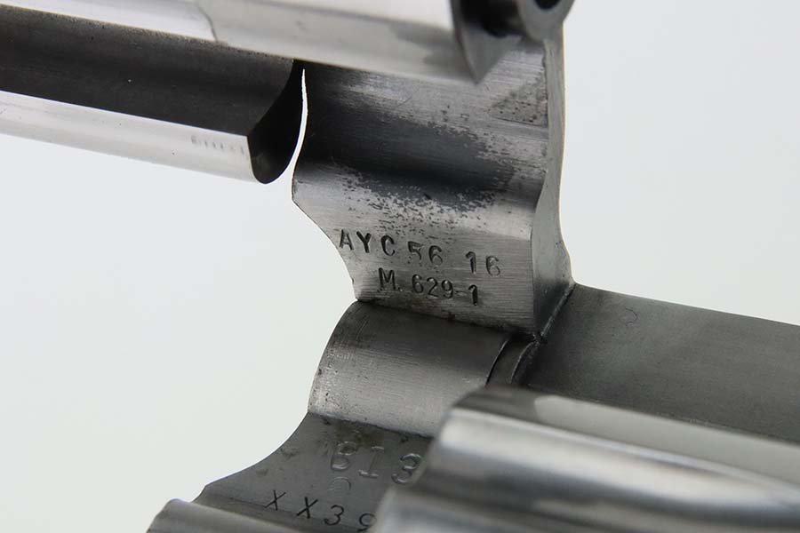 3/21/24 – This is an excellent Smith & Wesson Model 629-1 revolver. Chambered in .44 Magnum with an 8 3/8 inch barrel. It has a really nice polish stainless finish – micro-scratches in the finish, a roll mark on the cylinder, and some dark heat staining spots on the cylinder. Fitted with a black rubber Hogue Mongrip. Stone-mint bore. Smooth action.
