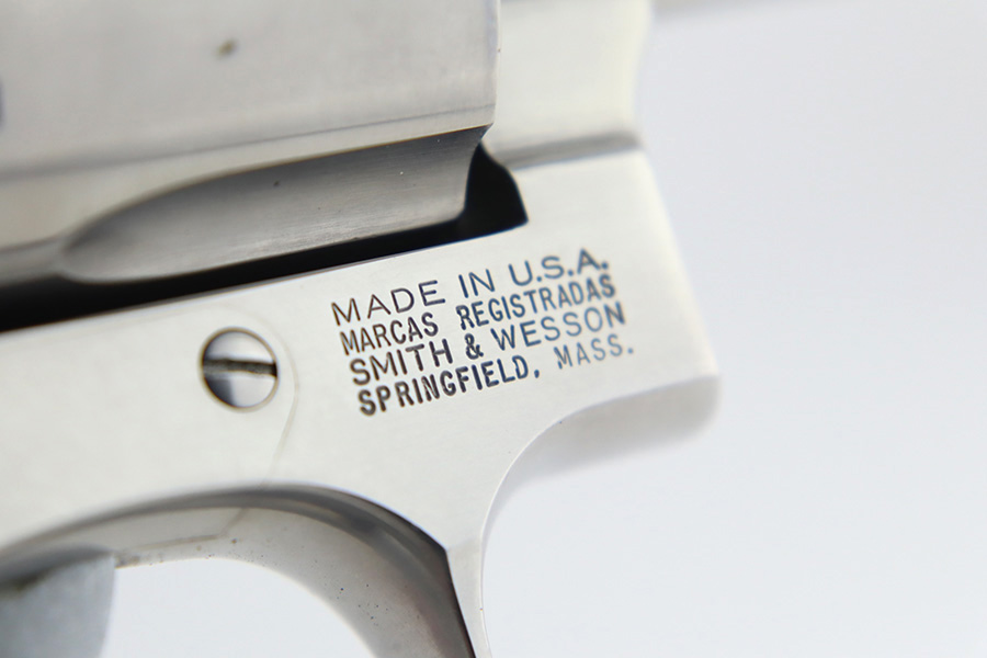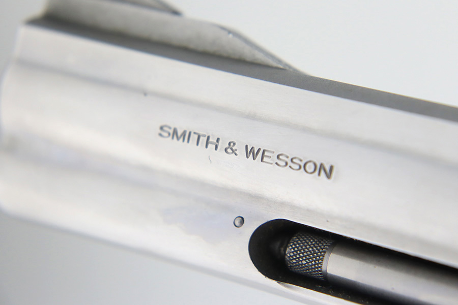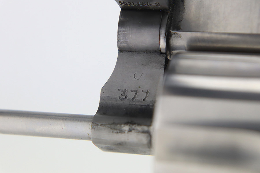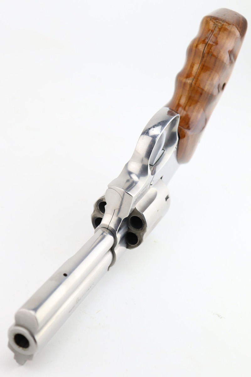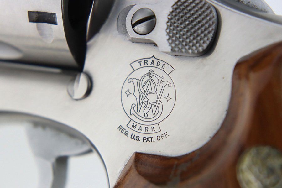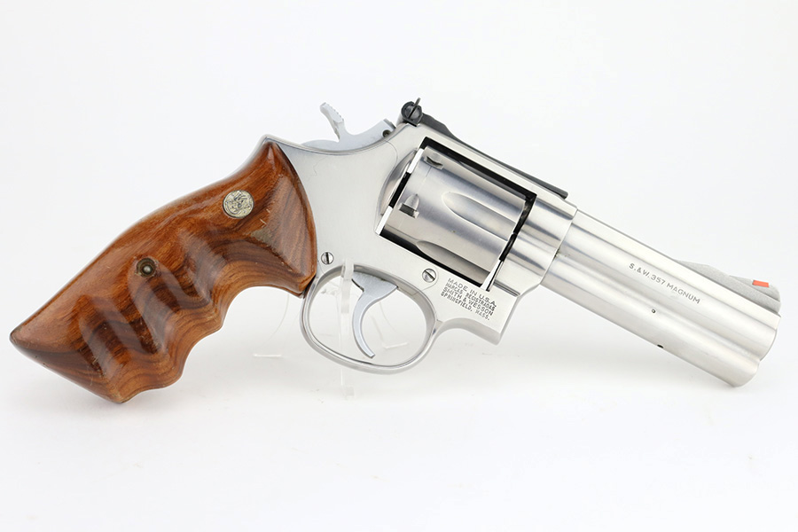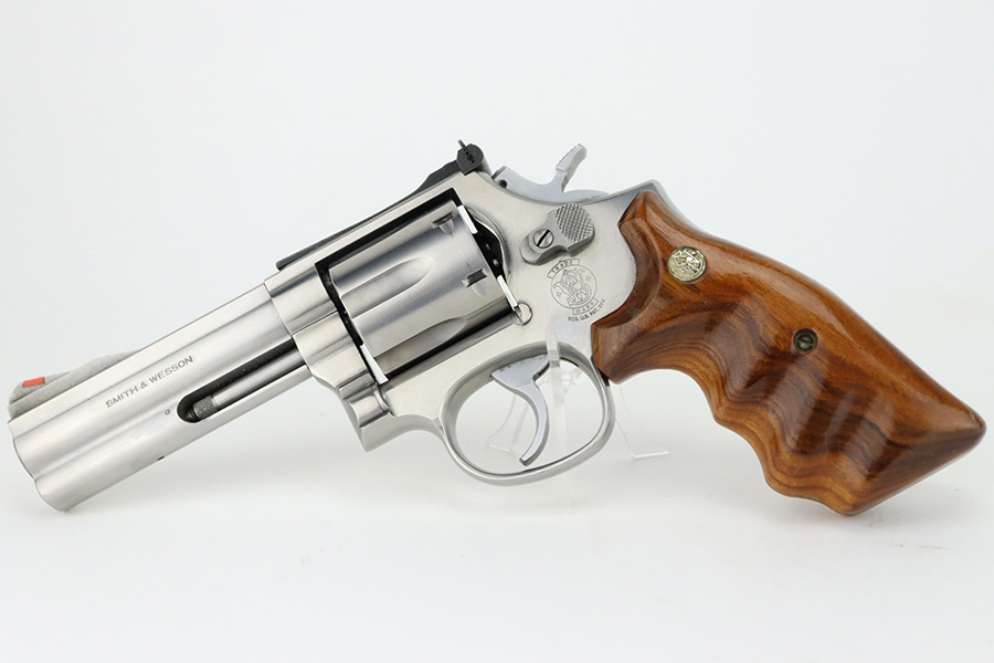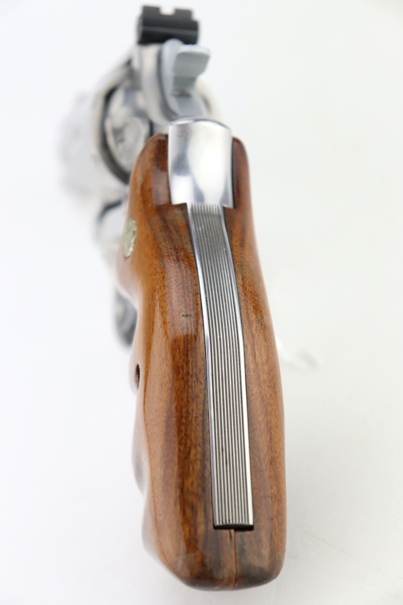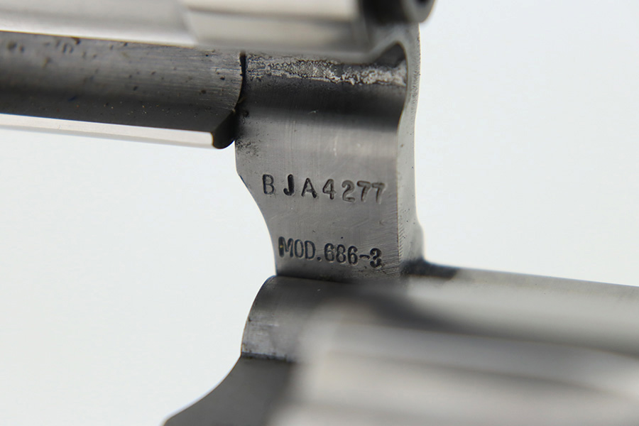 3/5/24 – This is a Smith & Wesson Model 686-3 revolver, chambered in .357 Magnum. It has a nice polished stainless finish and is in excellent condition overall. There are just tiny micro-scratches in the finish throughout and a roll mark on the cylinder. Fitted with nice wood grips. Mint bore. Smooth action.