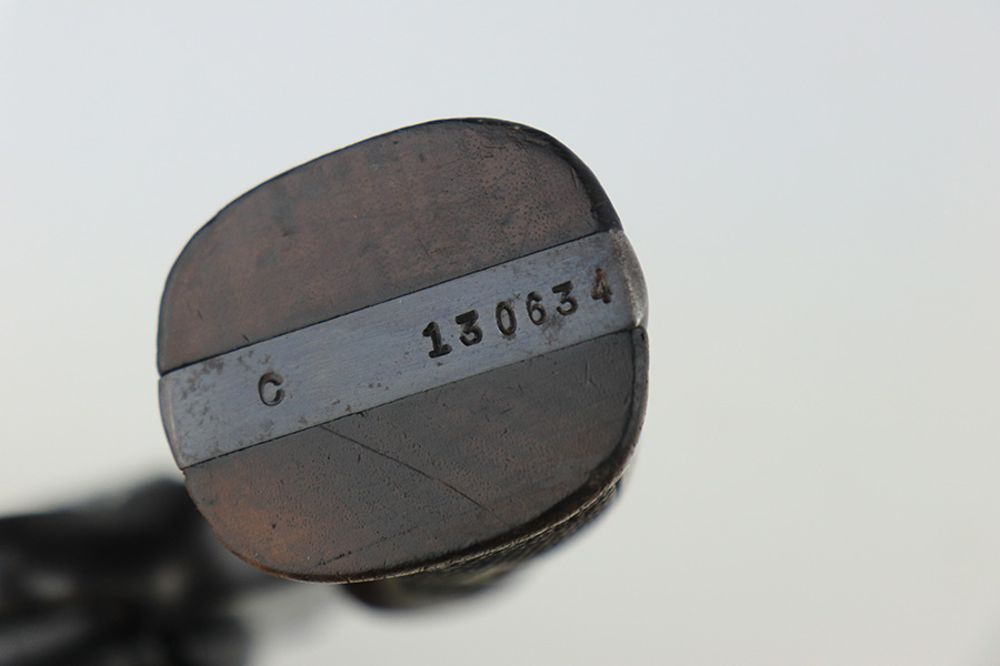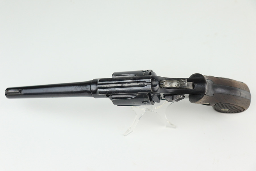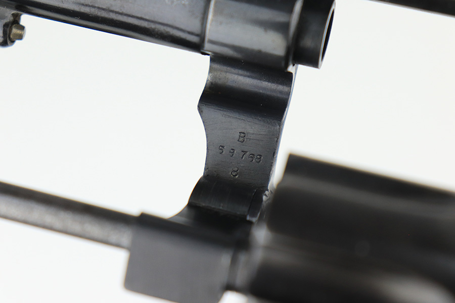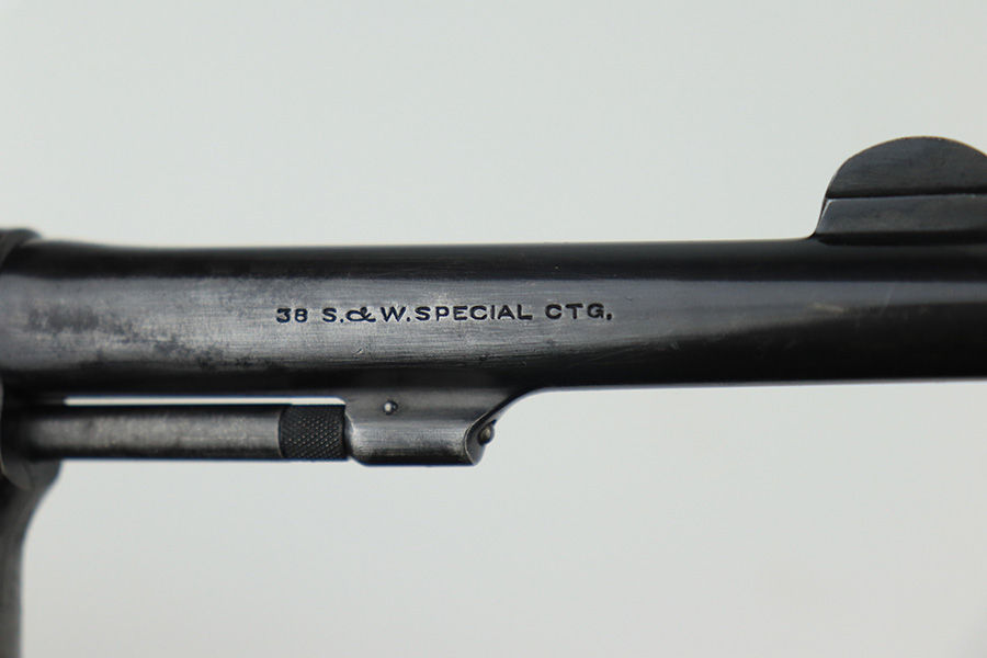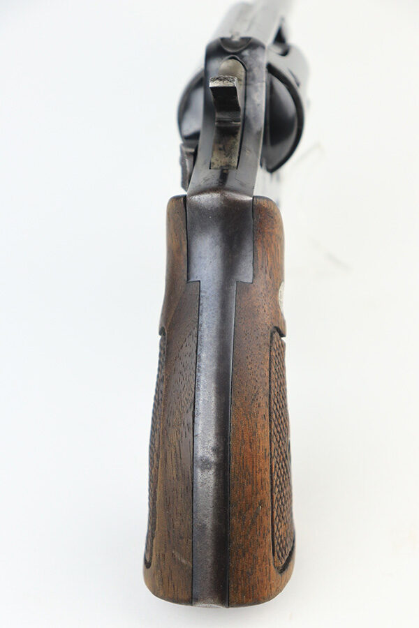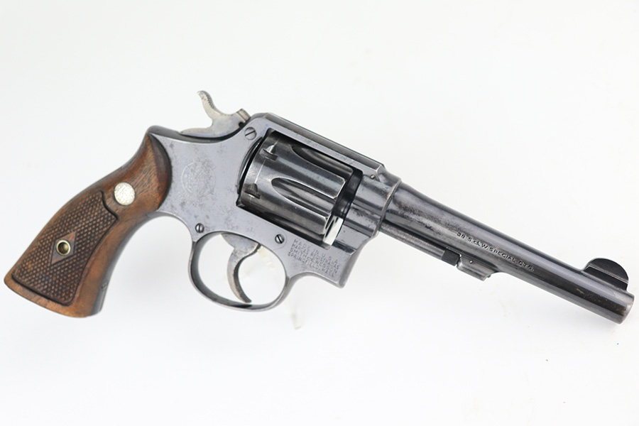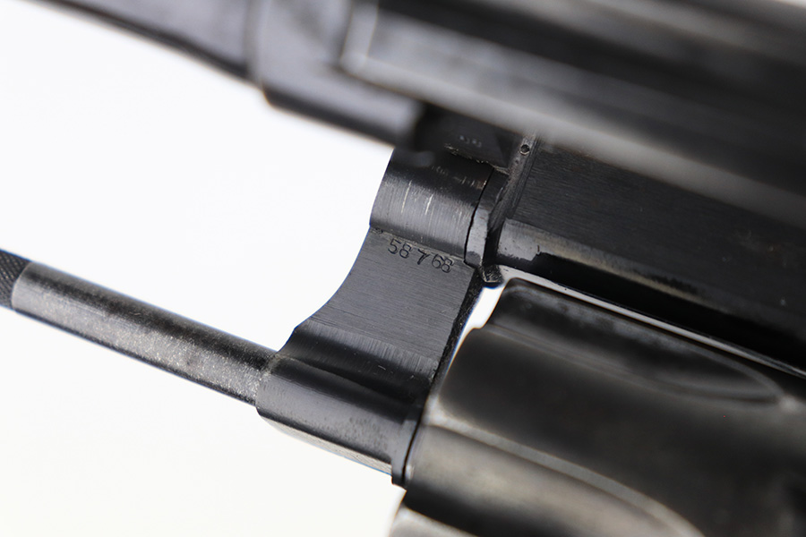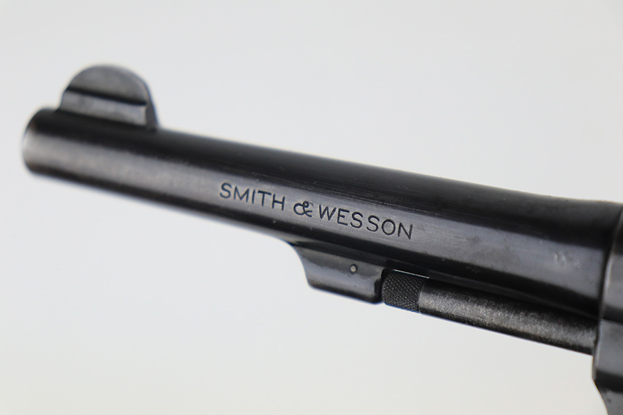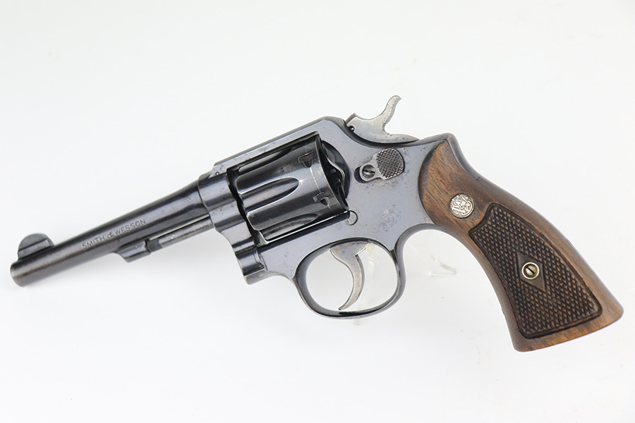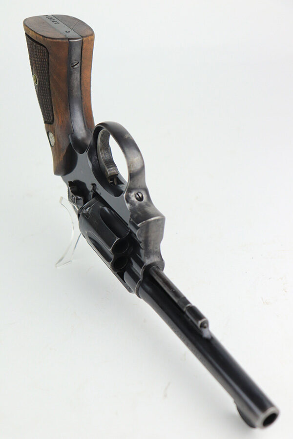12/9/21 – This is a nice example of a C-Series K-Frame Smith & Wesson revolver, manufactured between 1948-52. The gun is all correct and has retained roughly 85% of its original high polish finish. On the cylinder, there is minor wear concentrated around the high edges and a light roll mark. There is an area of splotchy discoloration on the underside of the frame and trigger guard. An area of wear on the right side of the barrel. Minor thinning and brown patina on the grip straps. There is spotty oxidation here and there, most noticeable on both sides of the frame. A few very light scratches on the left side of the frame. The cylinder is tight and the action is smooth. Comes with excellent checkered wood grips. The bore is near-mint.