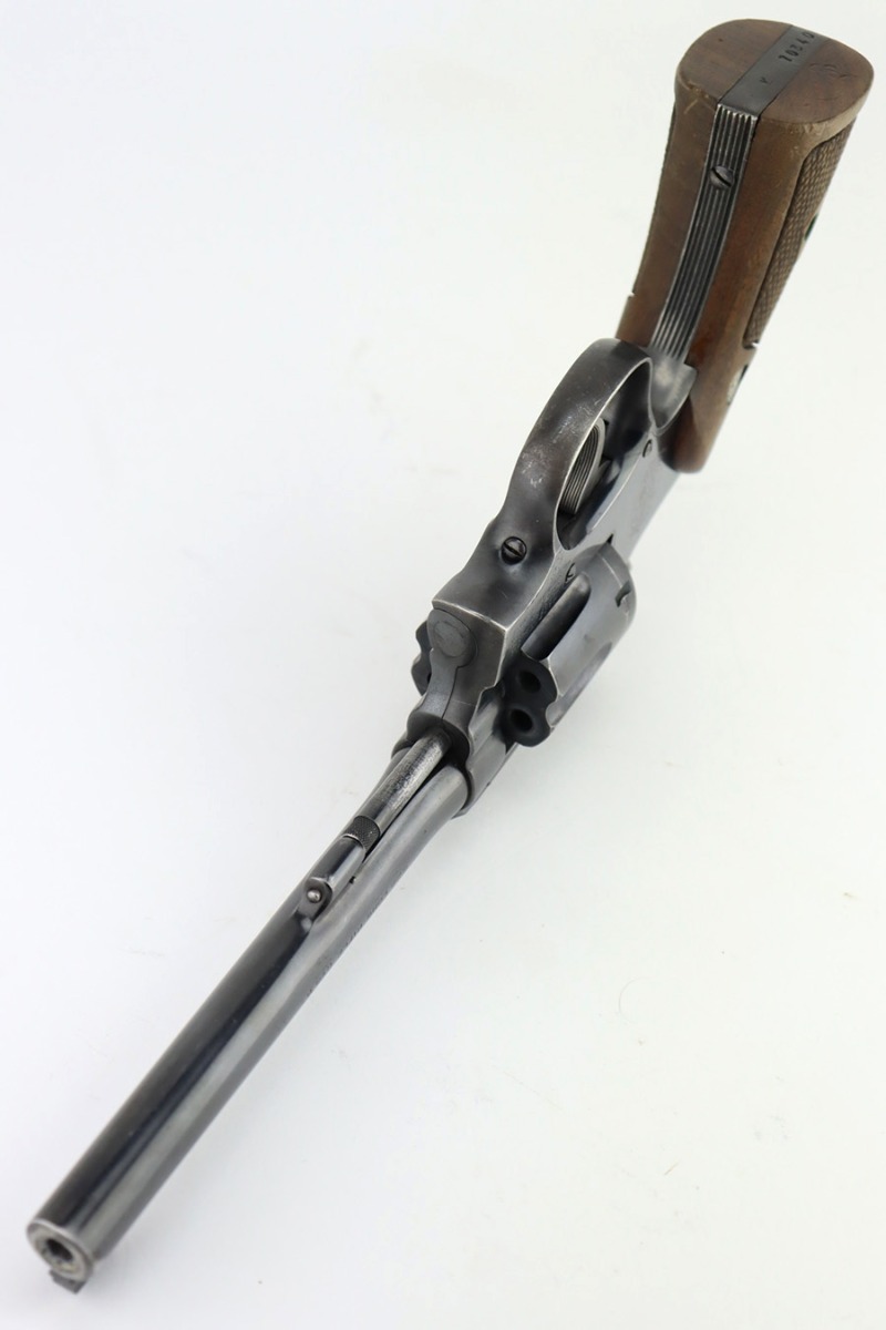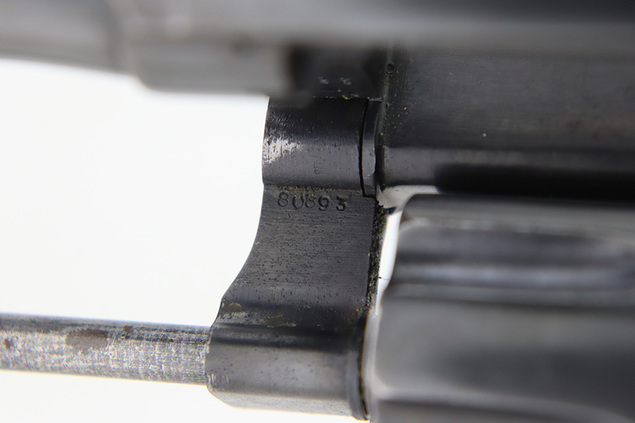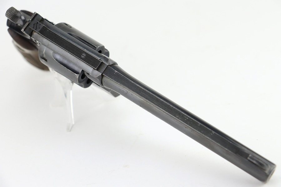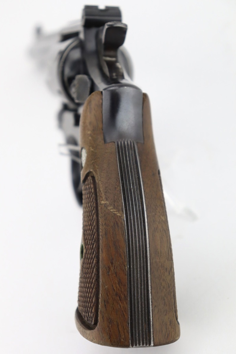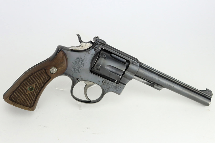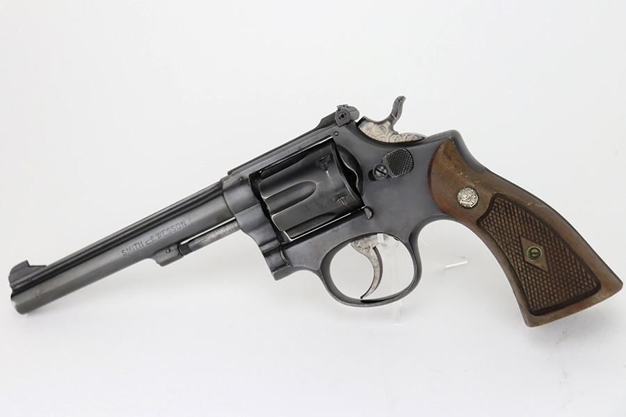 1/5/24 – This is a Smith & Wesson K-22 Revolver from 1948. Chambered in .22 LR with a 6″ barrel. The finish rates about 90% with general high edge wear, thinning on the grip straps, and a light roll mark on the cylinder. There are what look like circular milling marks on the side surfaces of the hammer and trigger – no finish. Fitted with proper wood grips. The bore has good rifling, but there is very light pin-pricking throughout. Smooth action.