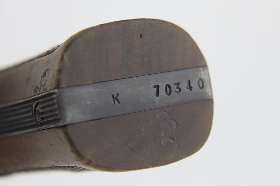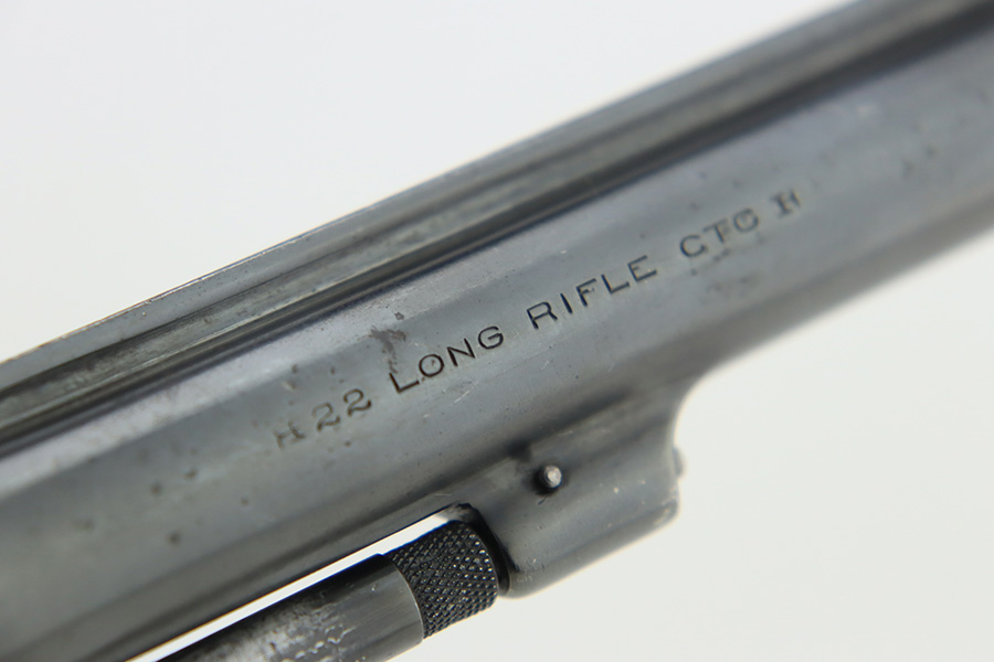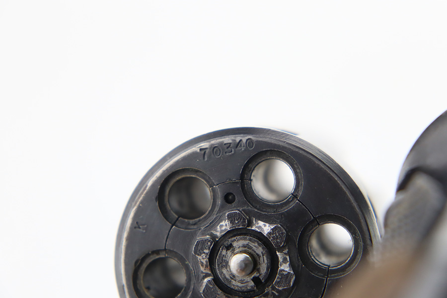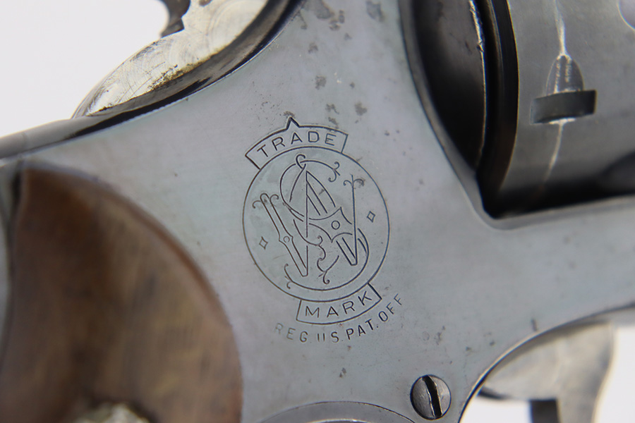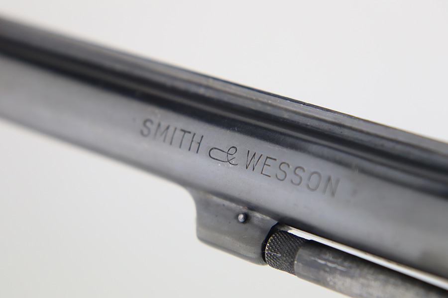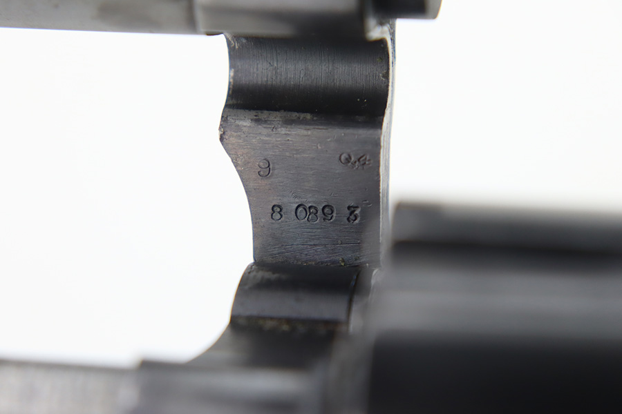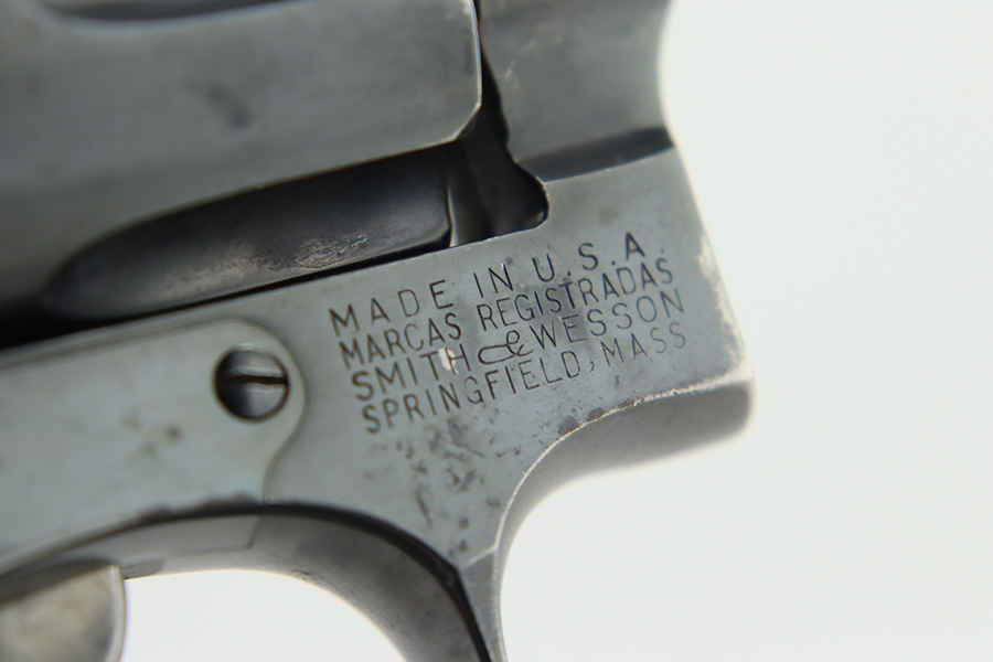 1/5/24 – This is a Smith & Wesson K-22 Revolver from 1948. Chambered in .22 LR with a 6″ barrel. The finish rates about 90% with general high edge wear, thinning on the grip straps, and a light roll mark on the cylinder. There are what look like circular milling marks on the side surfaces of the hammer and trigger – no finish. Fitted with proper wood grips. The bore has good rifling, but there is very light pin-pricking throughout. Smooth action.