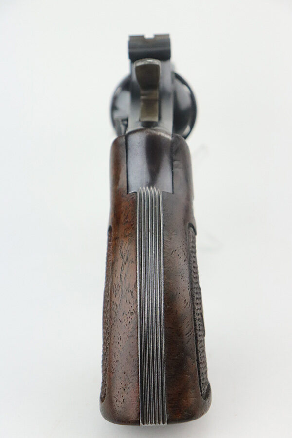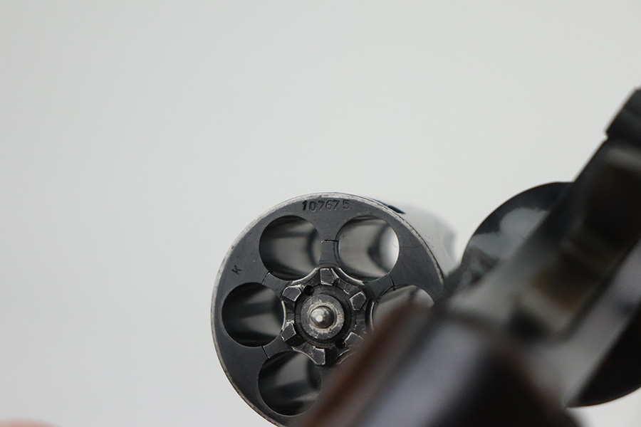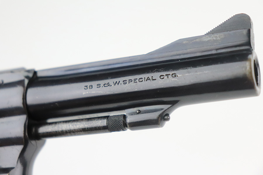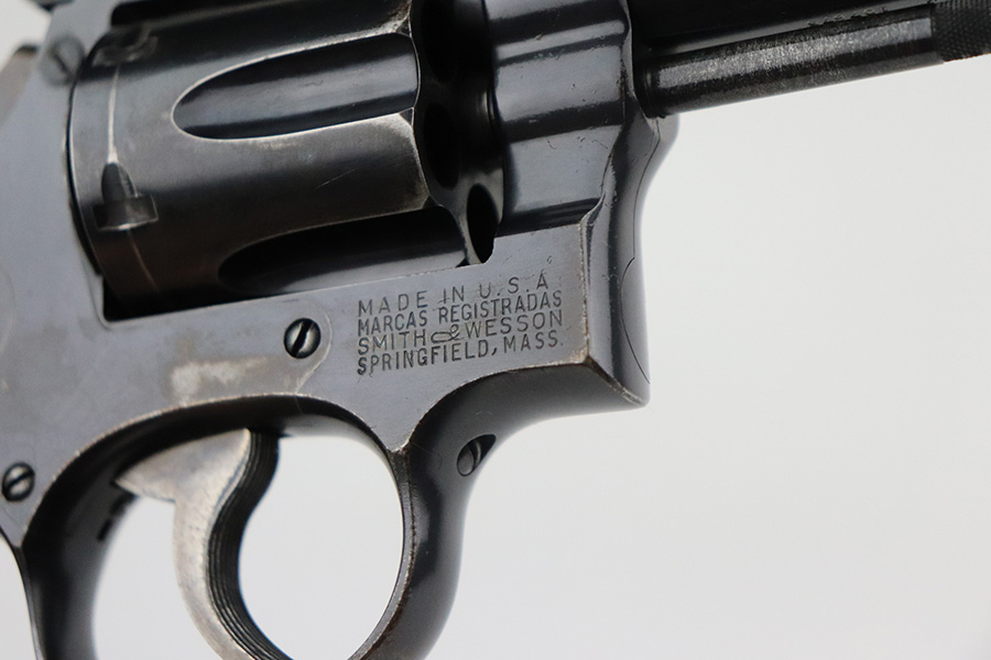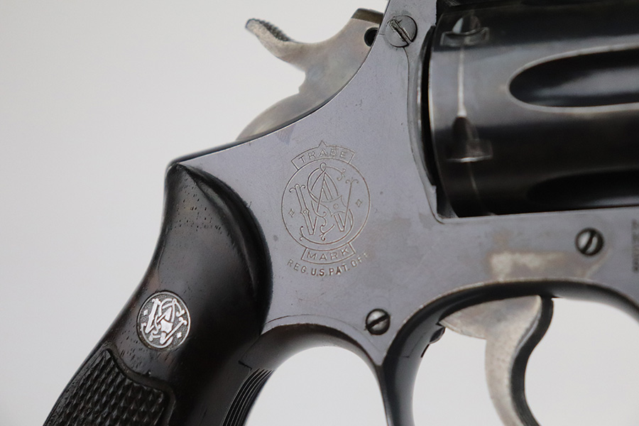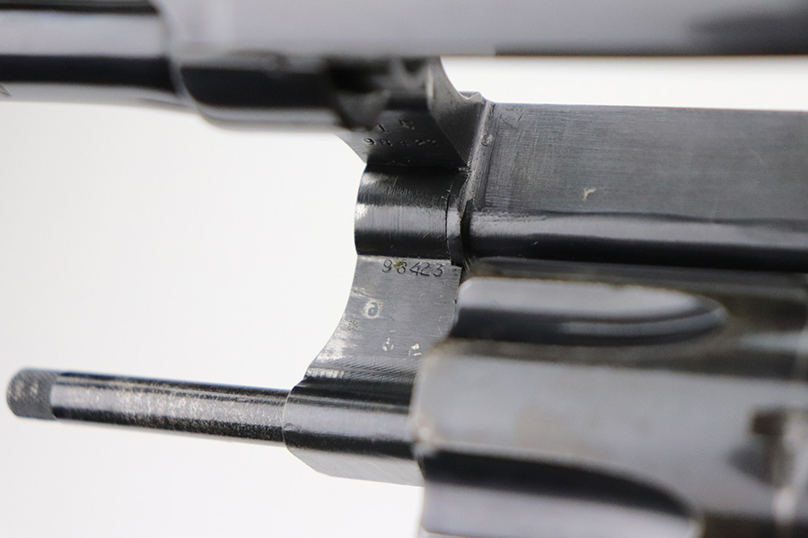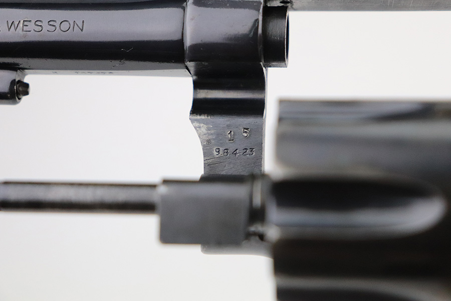 7/14/21 – This is a very nice example of a Smith & Wesson K-38 Masterpiece Model 15 revolver, chambered in .38 S&W Special. It is all matching and has retained about 93% of its original bluing. There is wear around the high edges of the cylinder, a light roll mark on the cylinder, minor wear around the muzzle, scratchy wear on the right side of the barrel, and spotty wear and minor patina on the right side of the frame. The cylinder is tight and the action is smooth. The left grip is properly numbered and matching. The bore is mint.