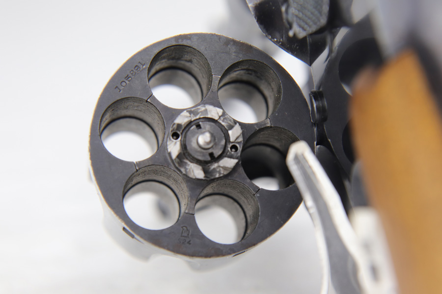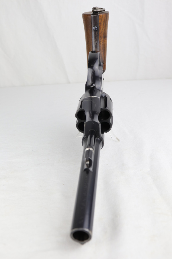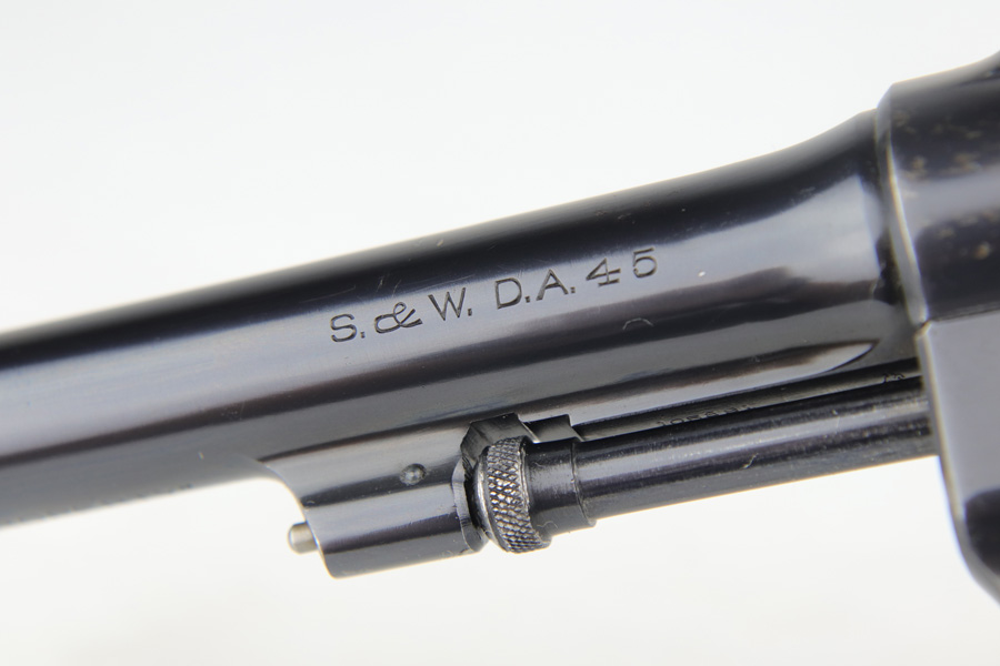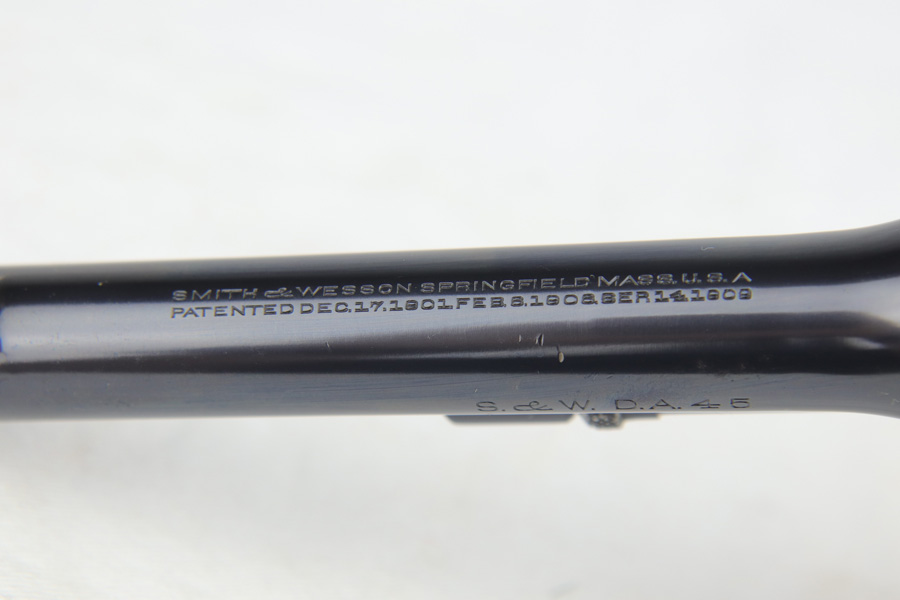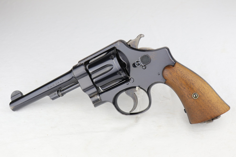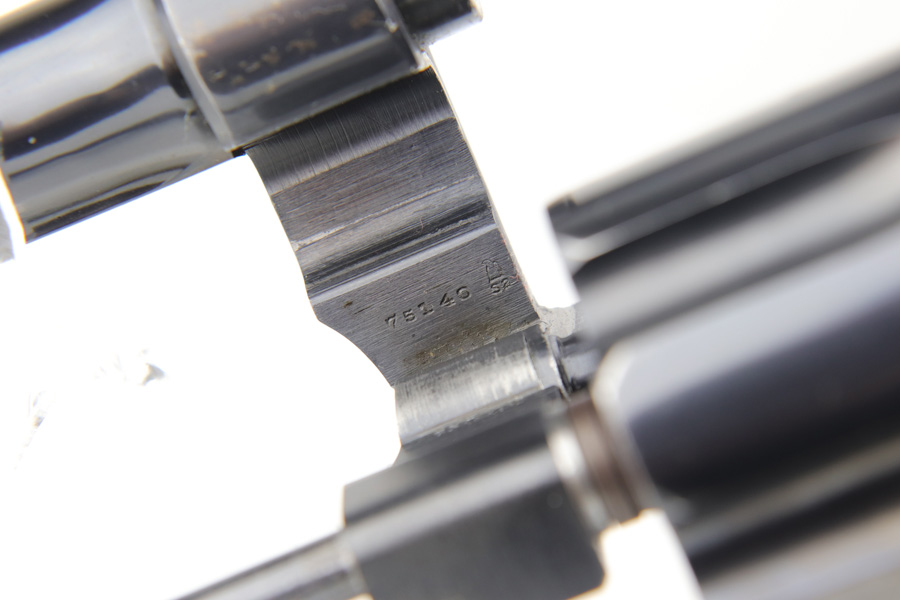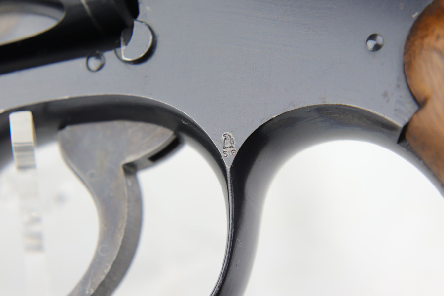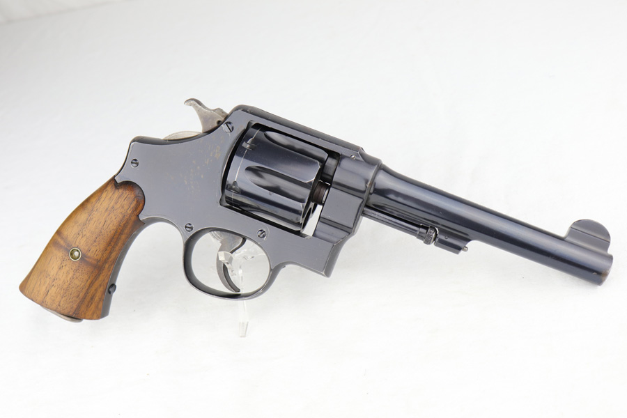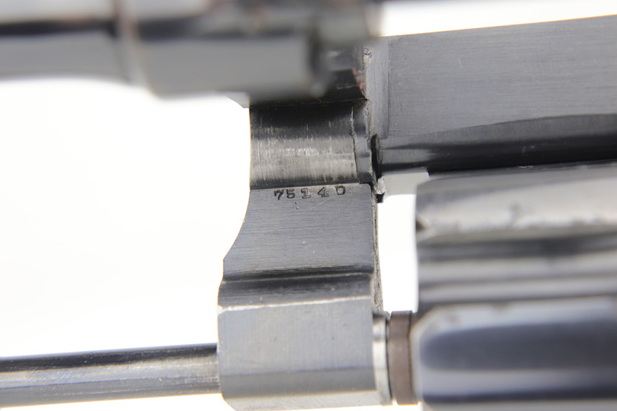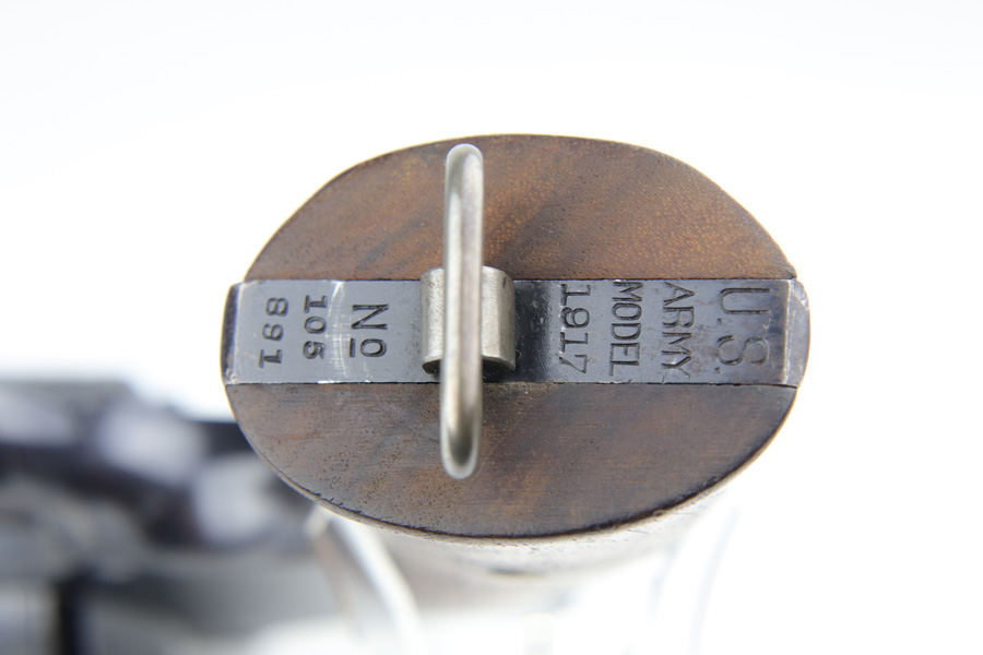 1/7/19 – This is a nice example of a US Army Smith & Wesson M1917. The revolver is all original and correct with 85-90% high-polish bluing. The grip frame is fairly thin, and there are a few areas of finish loss on either side of the gun. The trigger and hammer still show nice, original case hardening. The grips are original and one panel is numbered to the gun. Very nice bore and action/timing seem flawless.