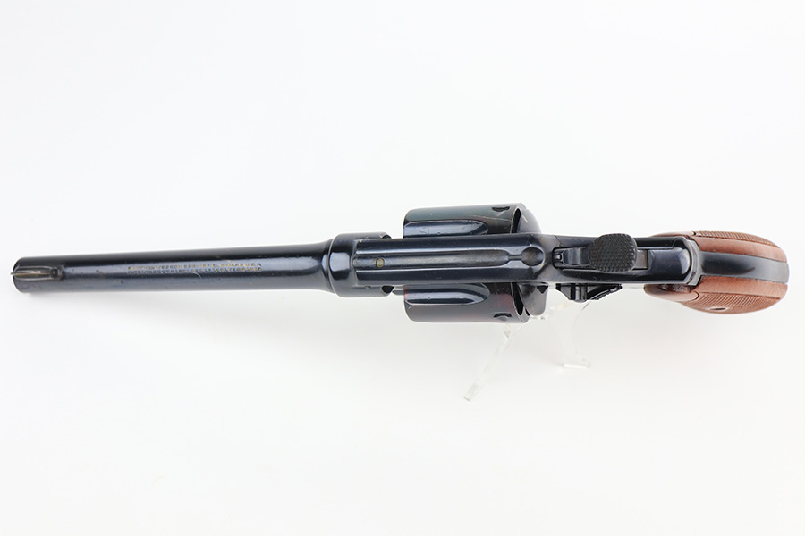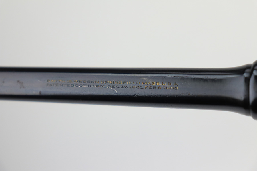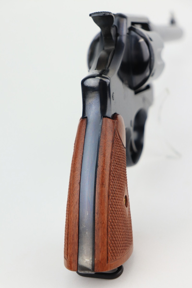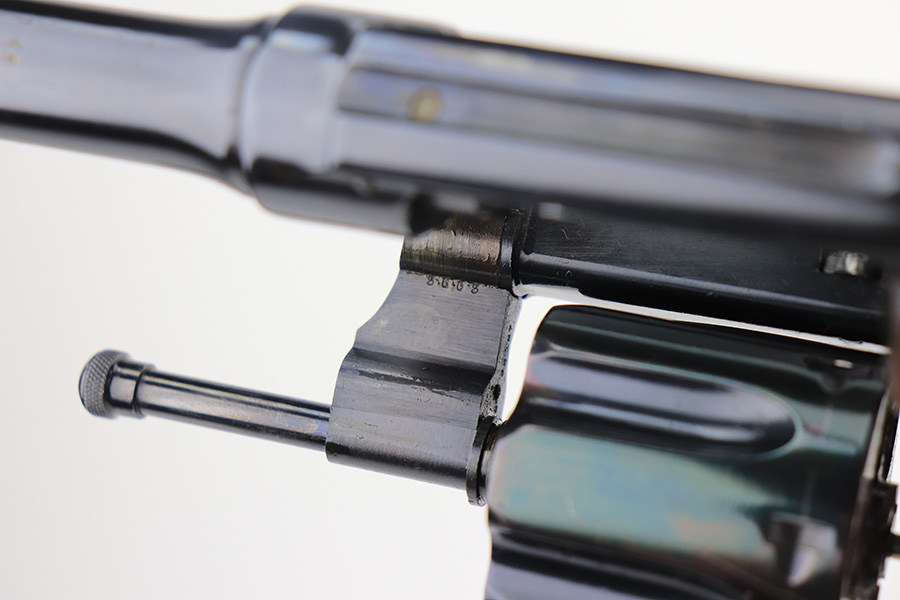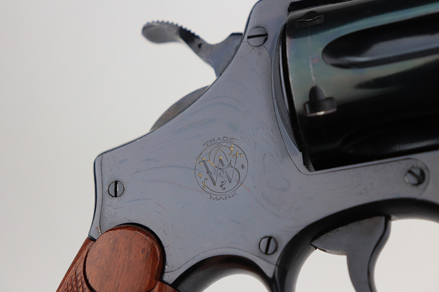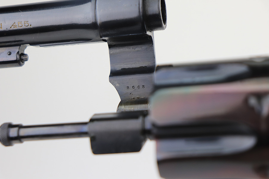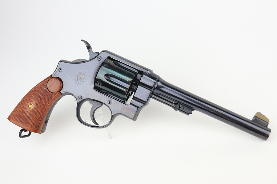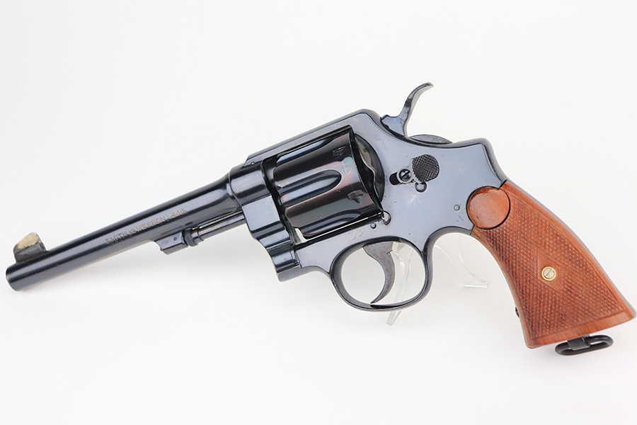 2/11/22 – This is an early Smith & Wesson Mk II Hand Ejector revolver from the 1910s. This is the second iteration of the Triple Lock revolver, considered by some to be the finest revolver ever made. The Mk II doesn’t have the shroud for the ejector or third locking lug. The British and Canadian militaries pressed for the removal of the third locking lug due to concerns that the precision mechanism would collect dirt and cause the gun to malfunction. Additionally, this change and the removal of the ejector shroud simplified manufacturing, allowing Smith & Wesson to drop the price of the gun by two dollars at the time. This revolver has matching numbers throughout but finish was re-blued at some point. Mechanics seem good, we didn’t find issue with timing or lock up. Excellent bore. Grips are in great shape but were replaced.