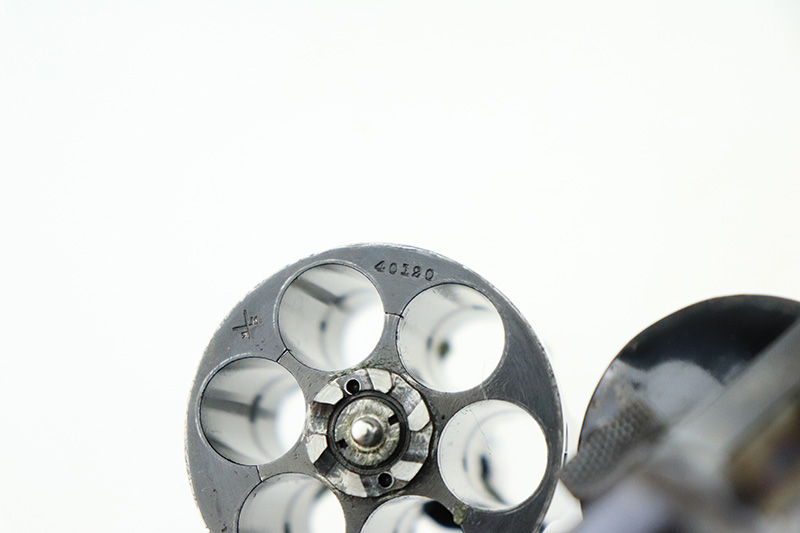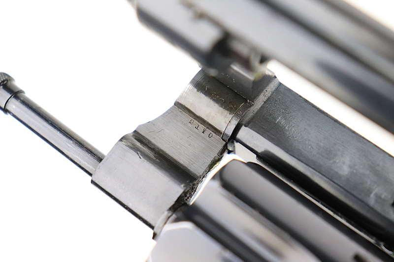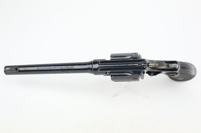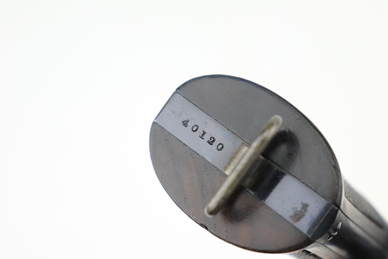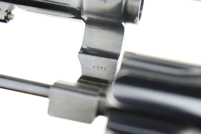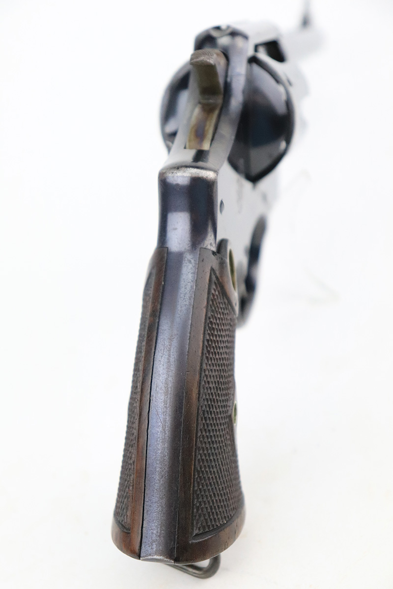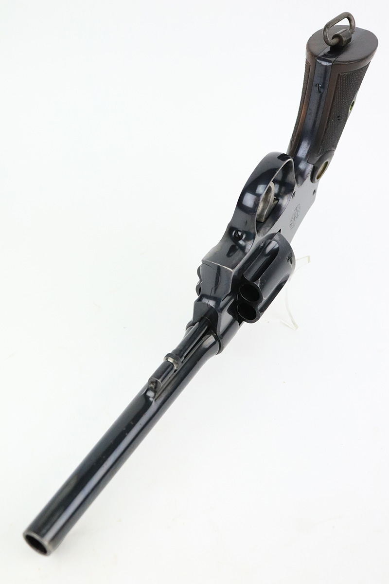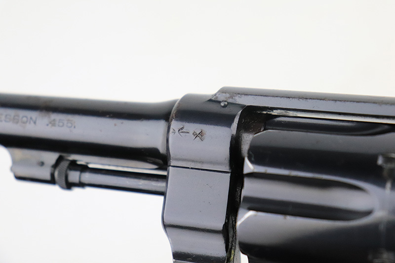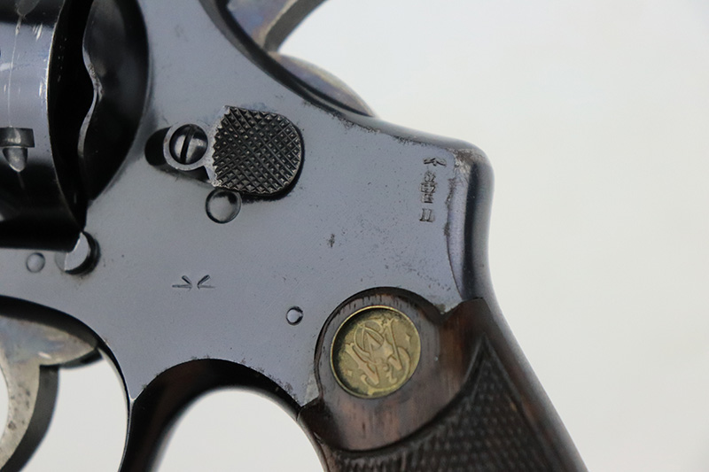 8/19/22 – This is an early Smith & Wesson Mk II Hand Ejector revolver from the 1910s. This is the second iteration of the Triple Lock revolver, considered by some to be the finest revolver ever made. This one is matching and has British proofs throughout. It has retained about 94% of its high polish finish. While there isn’t a ton of actual finish loss, there is spotty oxidation and minor pitting along the whole barrel. Light roll mark on the cylinder. Minor wear on the tang and pin-pricking on both grip straps. Comes with very nice wood grips – a few tiny holes on the right side. The right panel is numbered and matching. Minty bore. The cylinder is tight and the action is very smooth.