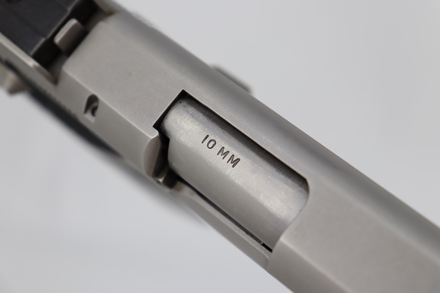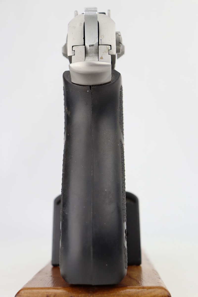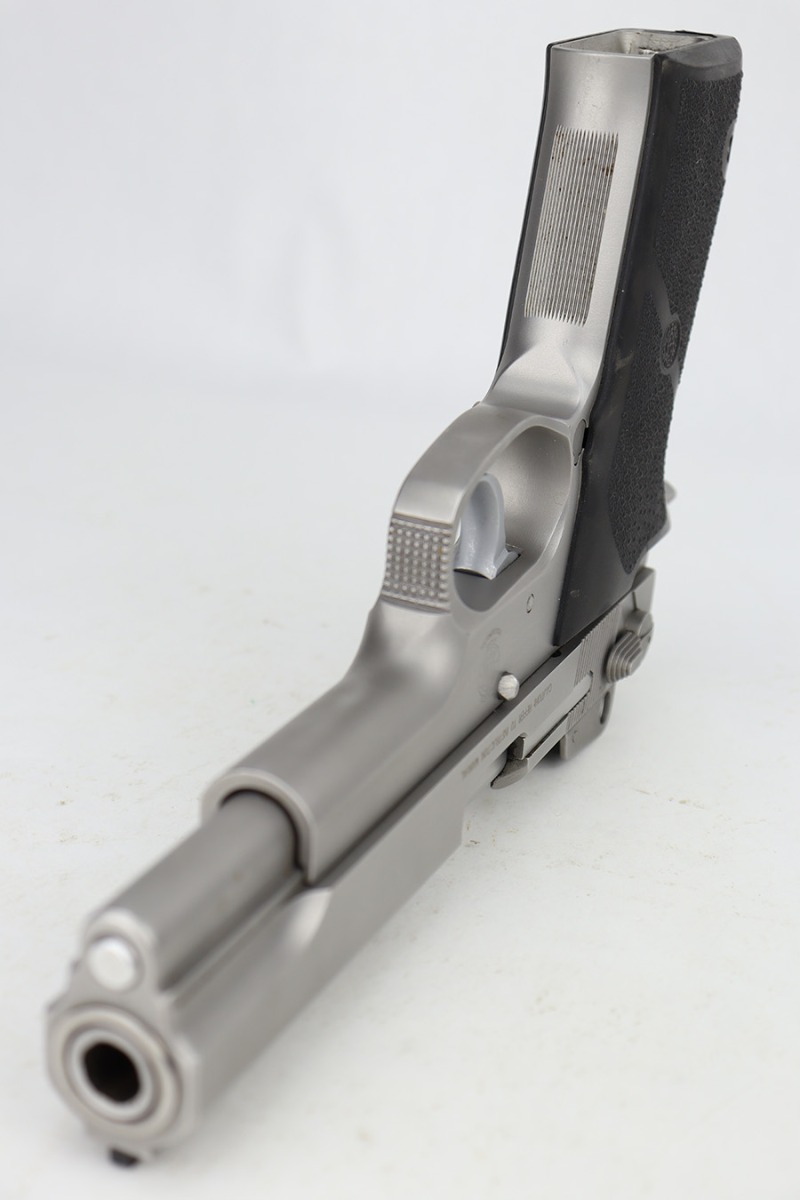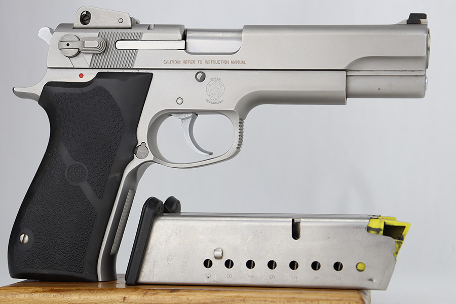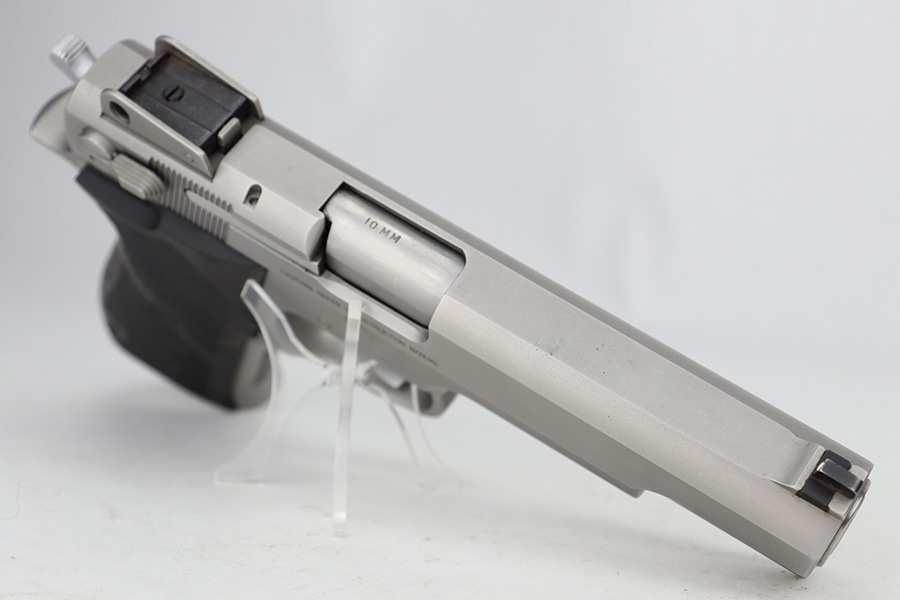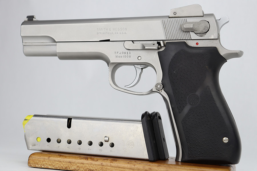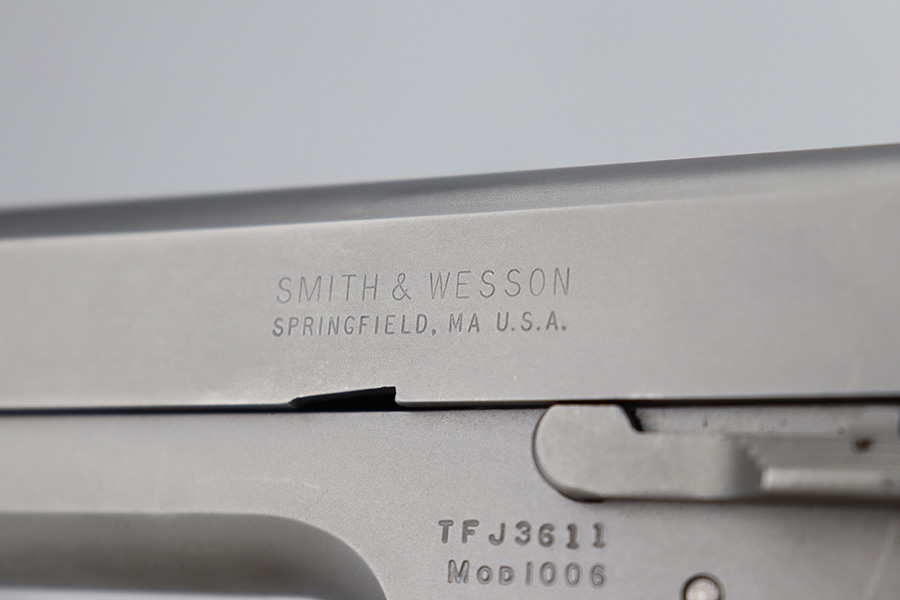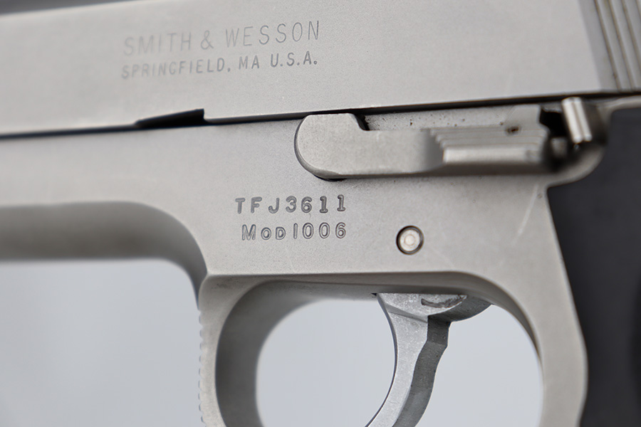 6/12/23 – This is an excellent example of a Smith & Wesson Model 1006, manufactured in 1990-95 and chambered in 10mm. Comes with three proper magazines. The gun itself has a really nice matte stainless finish and is in excellent condition. There are not many signs of wear except for some light surface scuffs here and there, most noticeable on the top of the slide. Fitted with very nice black rubber grips. Mint bore.