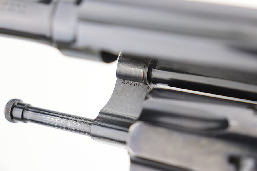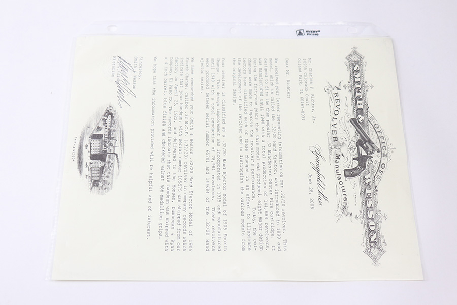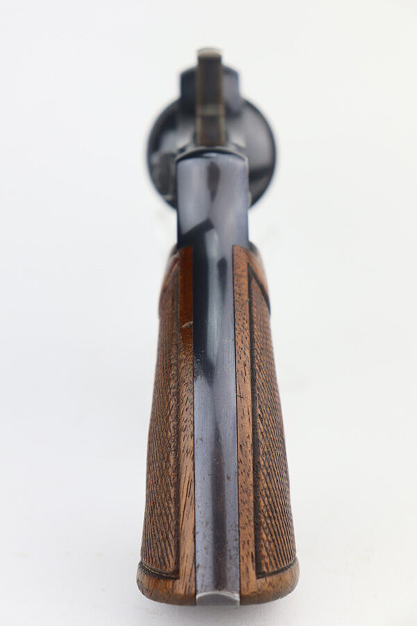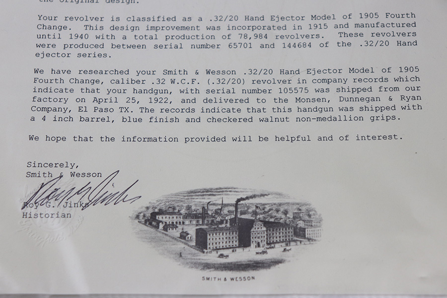 6/18/21 – This is a very nice Smith & Wesson .32/20 Hand Ejector Model of 1905 Fourth Change. All correct and original with maybe 94% of the blue remaining. Most of the wear is on the left and top side of the barrel. This particular example was made in 1922 and shipped to a private retailer in El Paso. Four inch barrel with a minty bore. Excellent grips, with right panel matching numbered to gun. Comes with S&W factory letter.