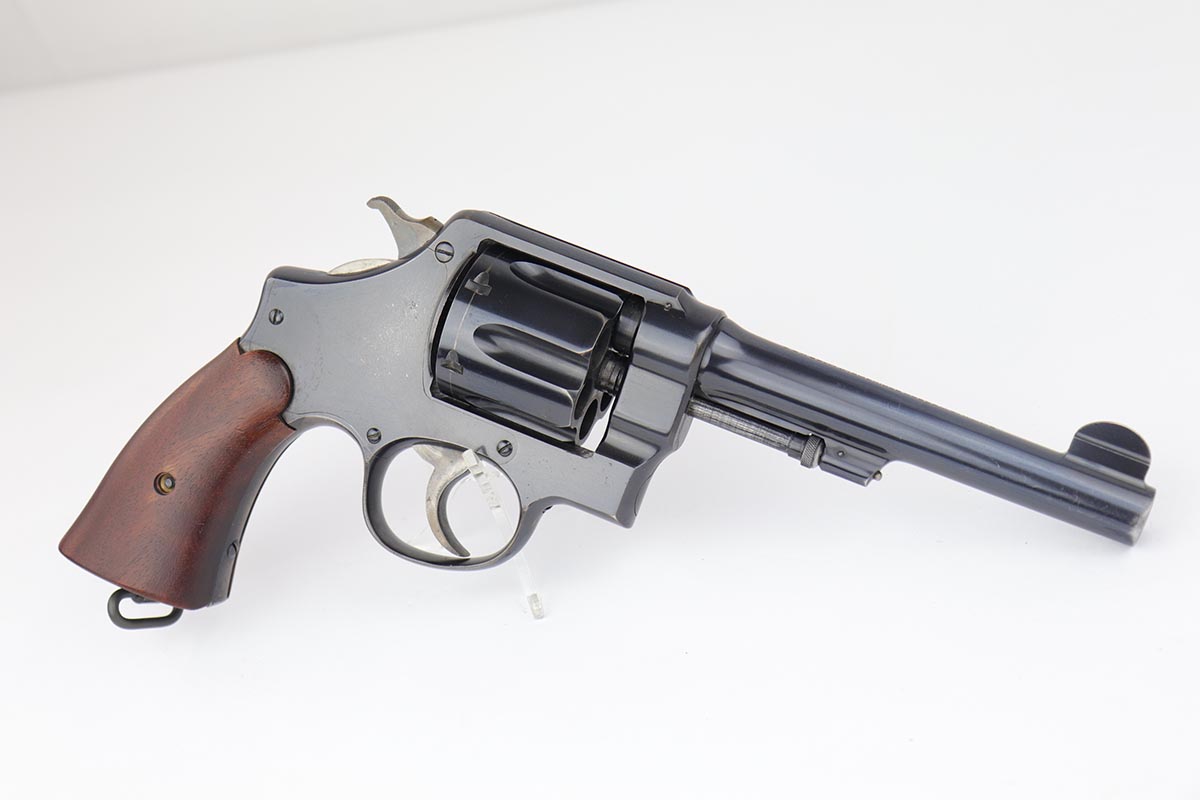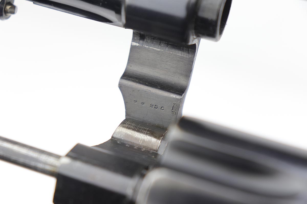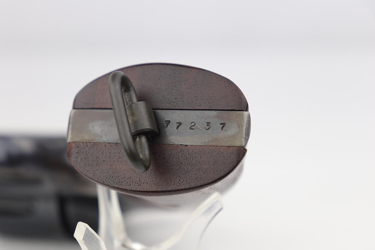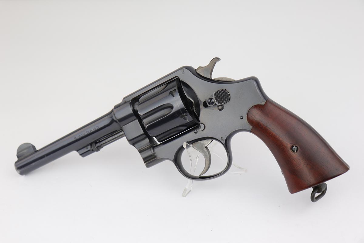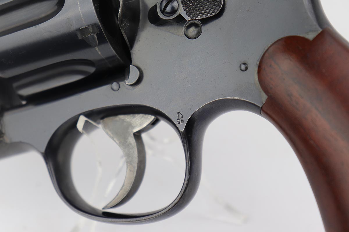 4/16/19 – This is a nice example of a US Army Smith & Wesson M1917 from the end of the Great War. The revolver is all original and correct with about 90% bluing. The profile view is excellent but the grip frame is thin throughout. The trigger and hammer still show nice, original case hardening. Barrel is marked UNITED STATES PROPERTY on the underside. Excellent bore. The grips are beautiful and appear original to the gun, as the right panel is hand numbered and matching to the revolver. Great timing/action.