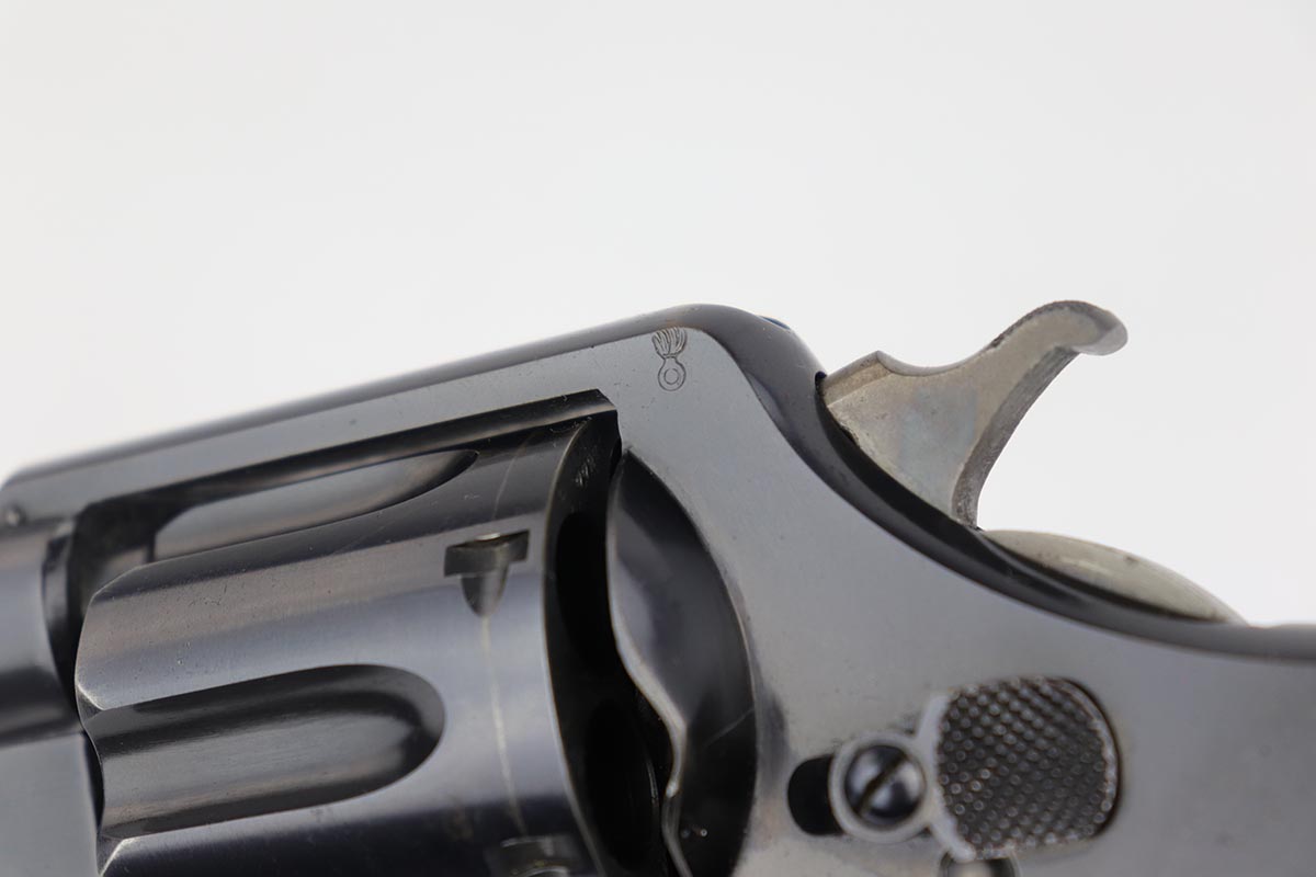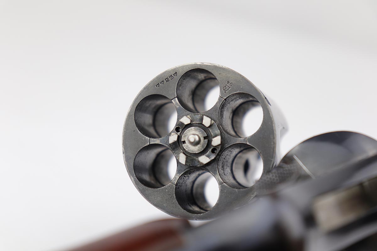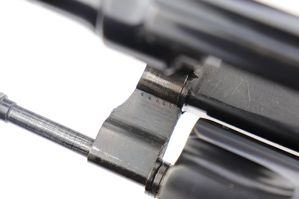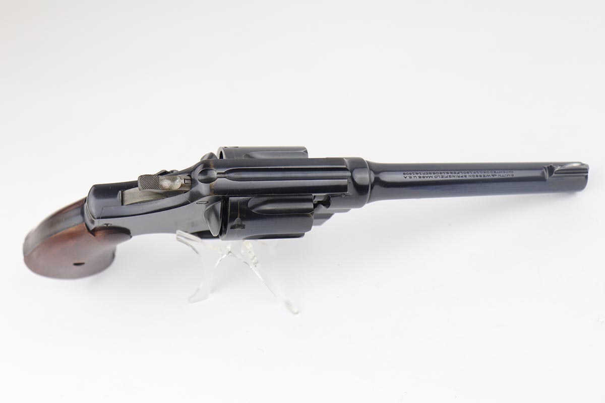 4/16/19 – This is a nice example of a US Army Smith & Wesson M1917 from the end of the Great War. The revolver is all original and correct with about 90% bluing. The profile view is excellent but the grip frame is thin throughout. The trigger and hammer still show nice, original case hardening. Barrel is marked UNITED STATES PROPERTY on the underside. Excellent bore. The grips are beautiful and appear original to the gun, as the right panel is hand numbered and matching to the revolver. Great timing/action.
