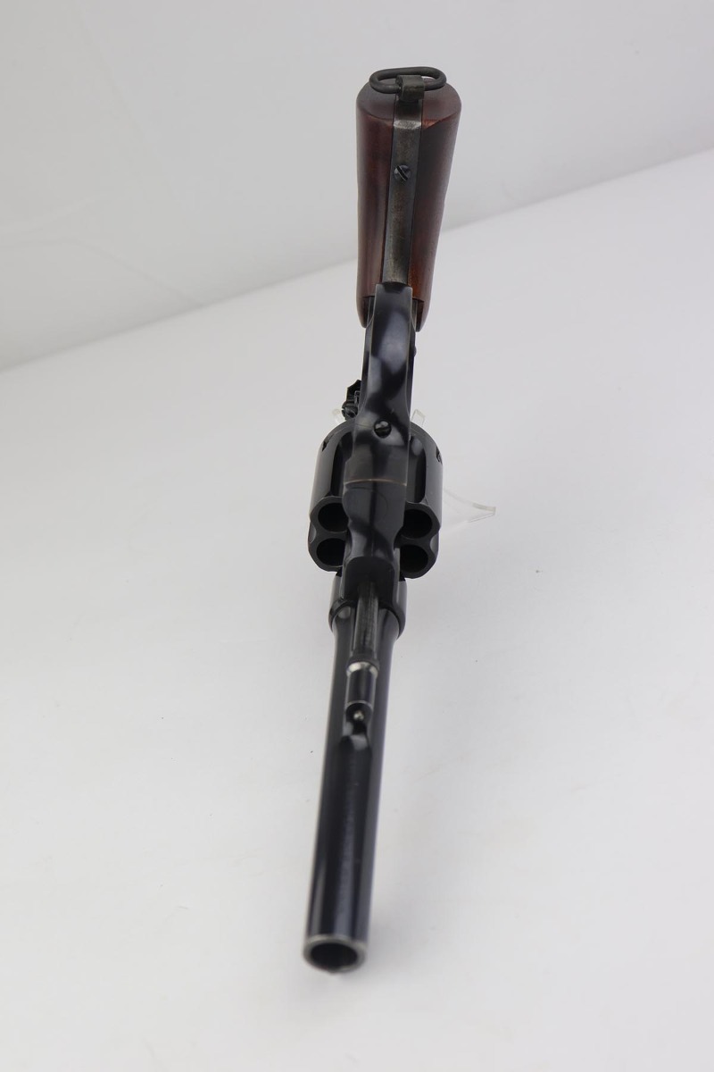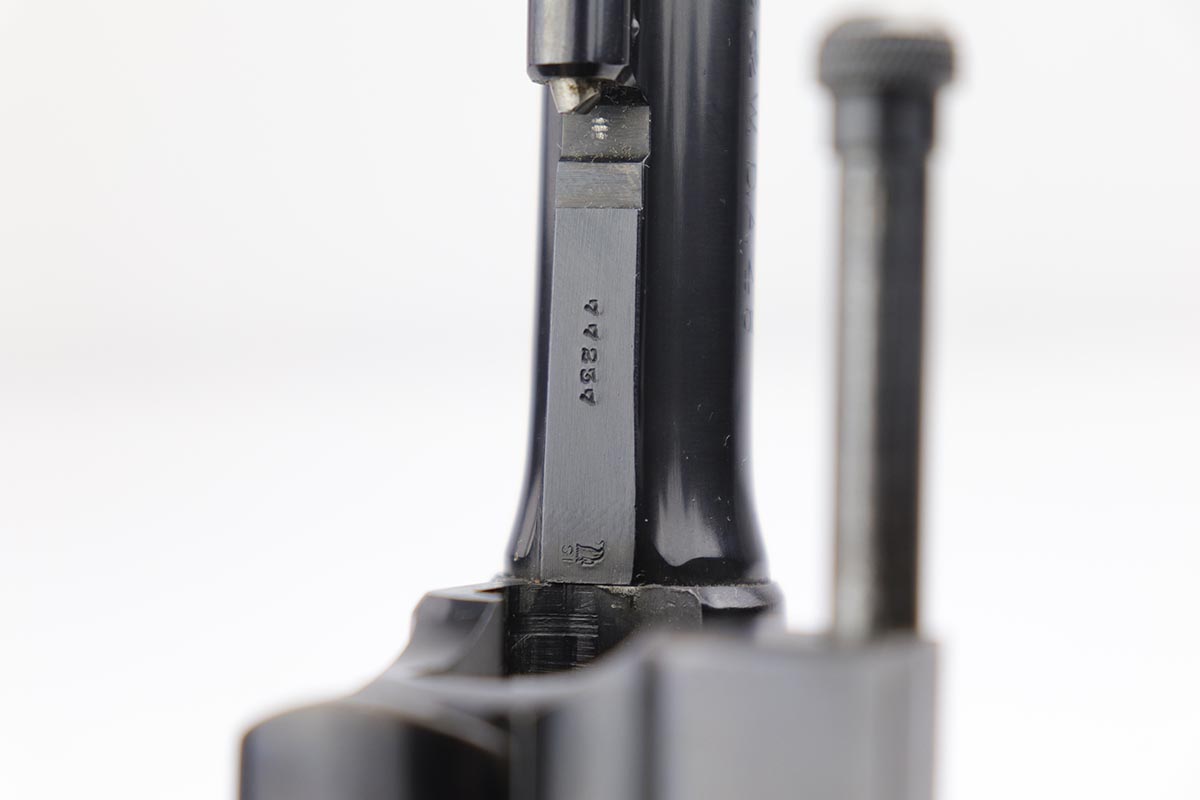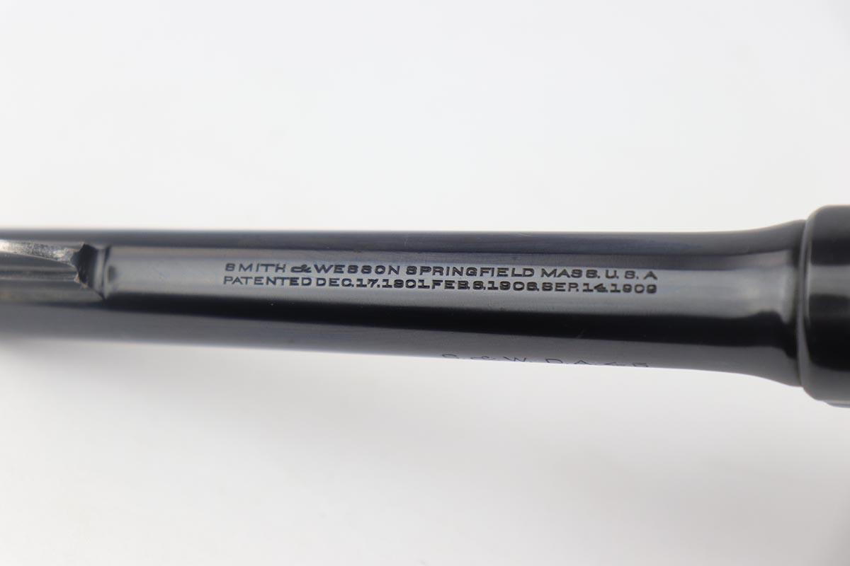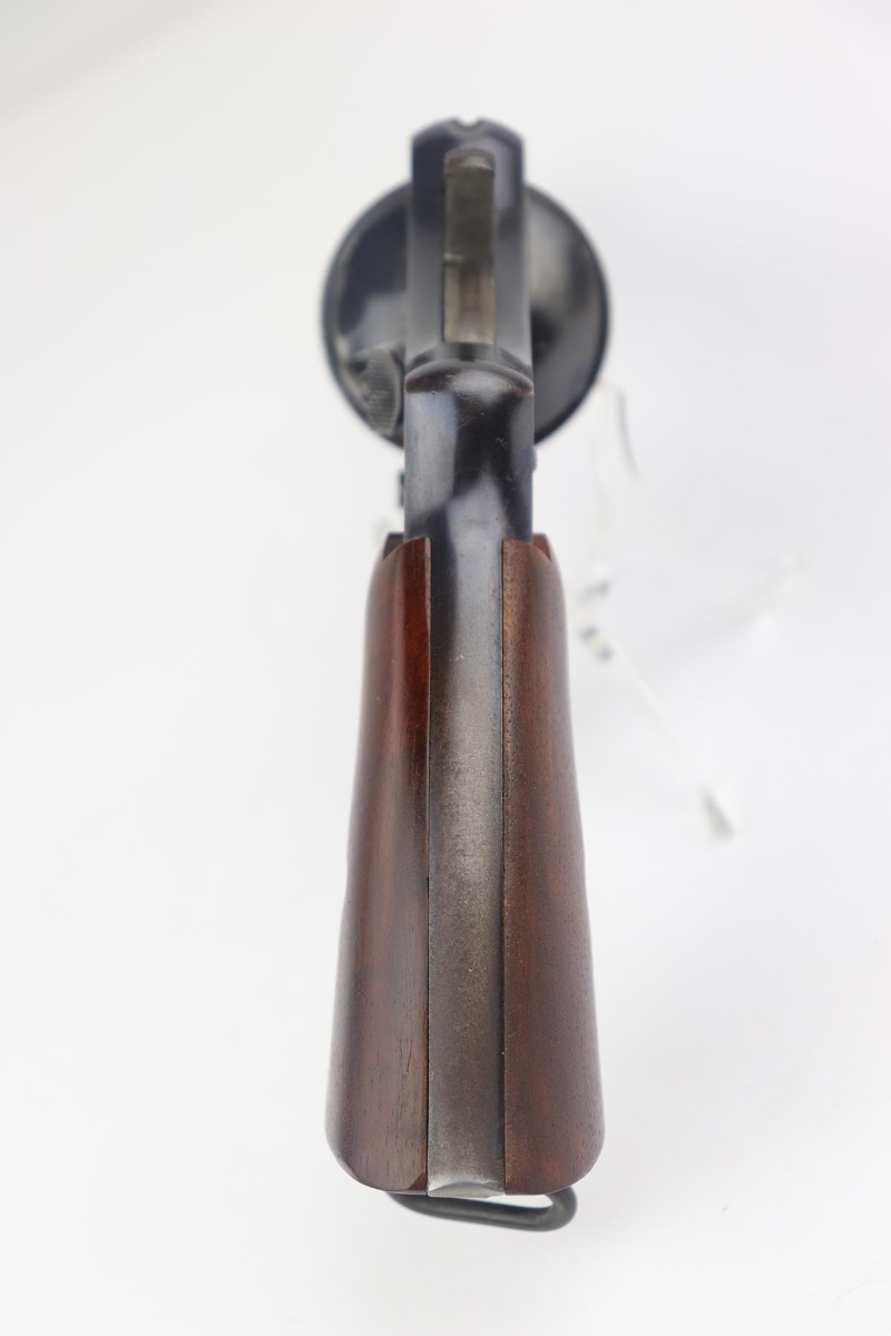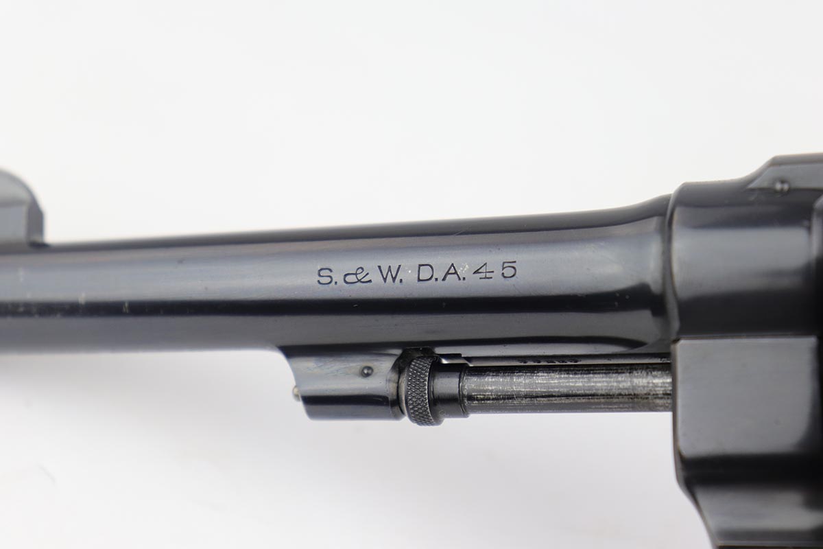 4/16/19 – This is a nice example of a US Army Smith & Wesson M1917 from the end of the Great War. The revolver is all original and correct with about 90% bluing. The profile view is excellent but the grip frame is thin throughout. The trigger and hammer still show nice, original case hardening. Barrel is marked UNITED STATES PROPERTY on the underside. Excellent bore. The grips are beautiful and appear original to the gun, as the right panel is hand numbered and matching to the revolver. Great timing/action.