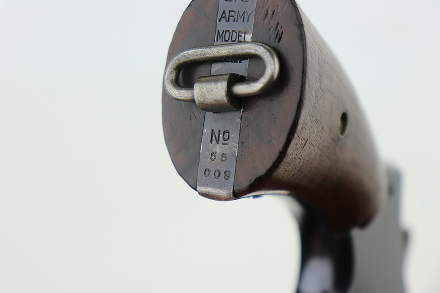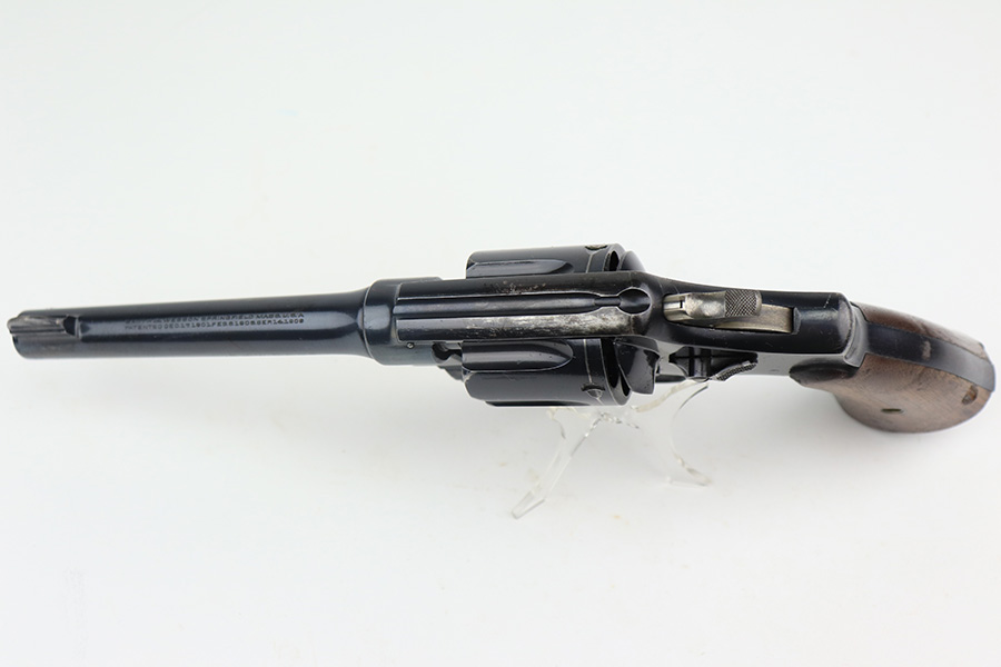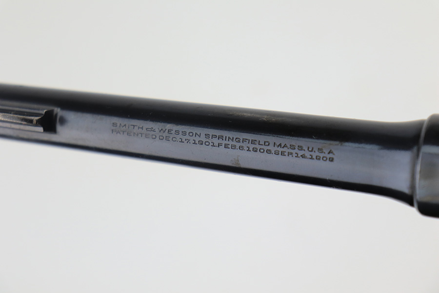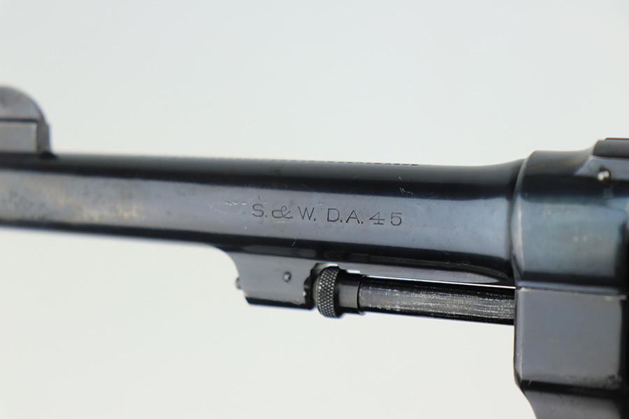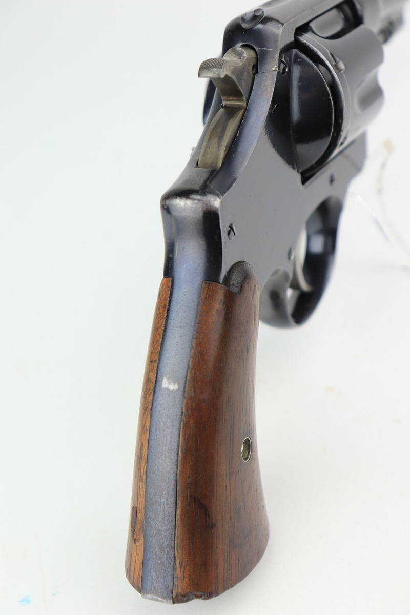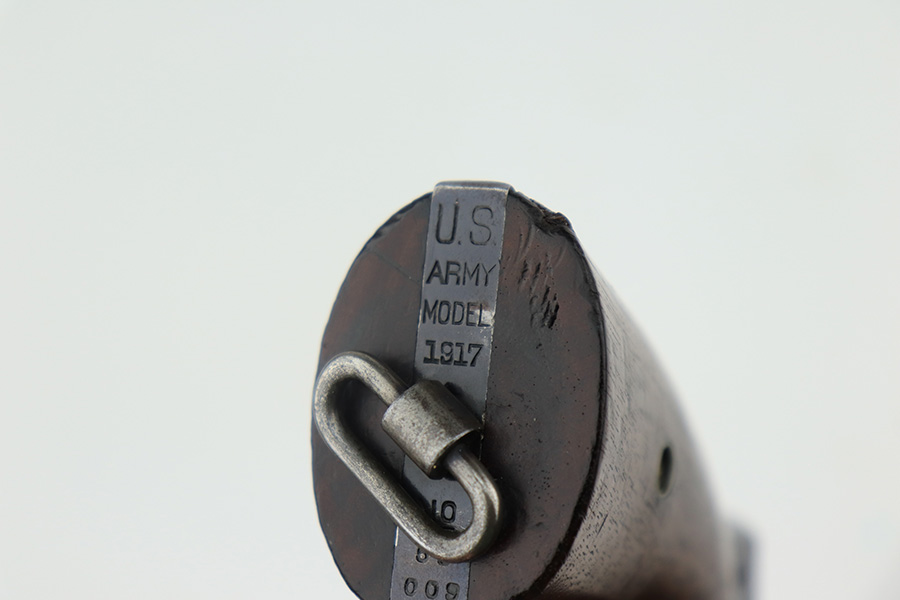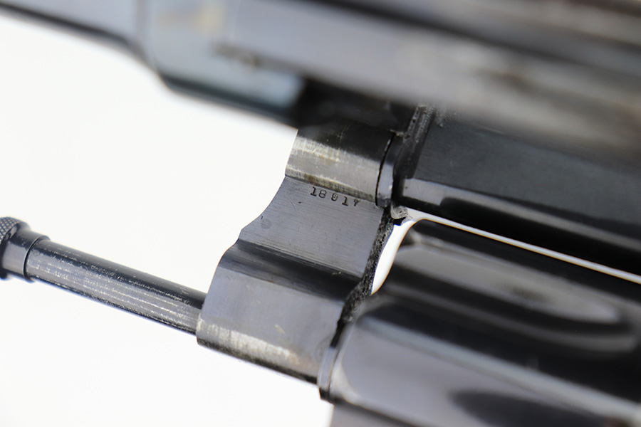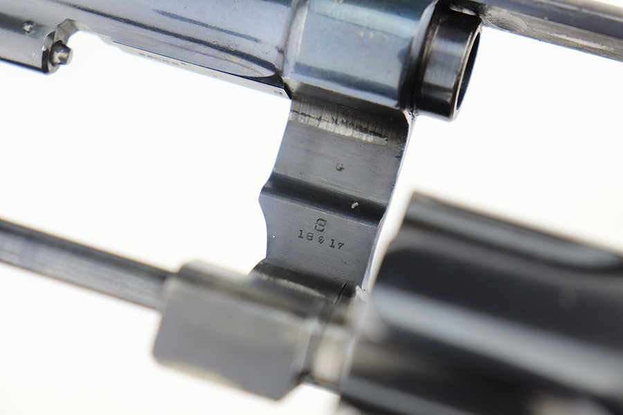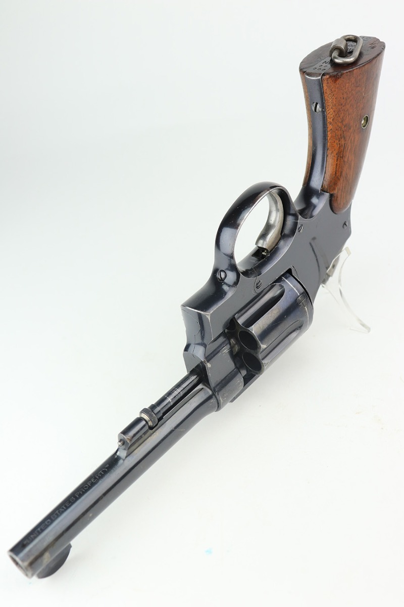 4/1/22 – This is a matching and original Army S&W Model 1917 revolver from the end of the Great War. The original blue rates at 90+% with most of the wear on either side of the barrel. There is also a small gouge mark on the right side of the barrel, and some pitting on the left. Rear grip strap also has a little bluing loss. Flaming bomb on frame with “UNITED STATES PROPERTY” marked barrel. Good mechanics. Each grip panel has a small chip. The bore has good rifling but there is a large, deep gouge in the barrel and we aren’t sure what could’ve caused it. Also not certain how it would impact the shootability of this revolver.