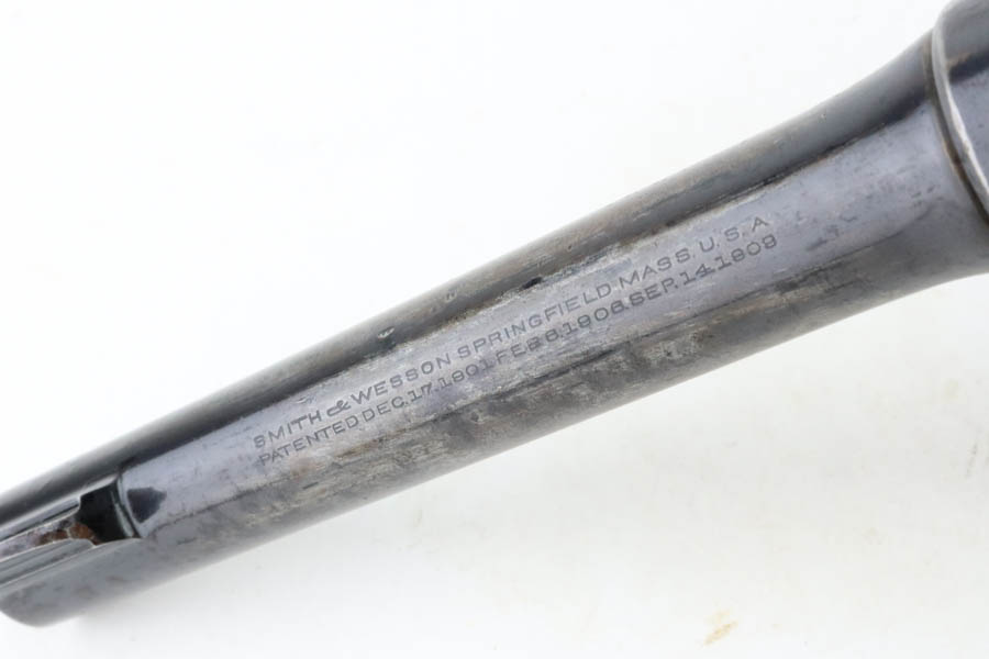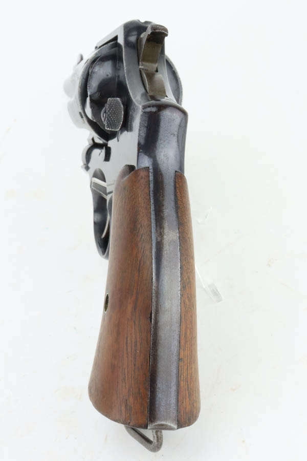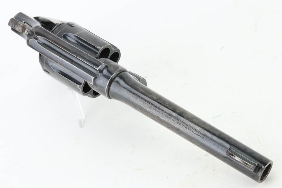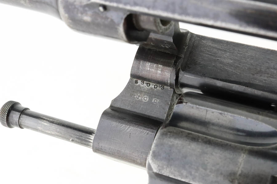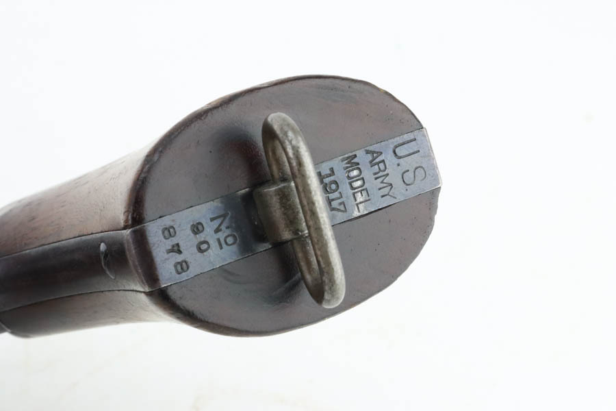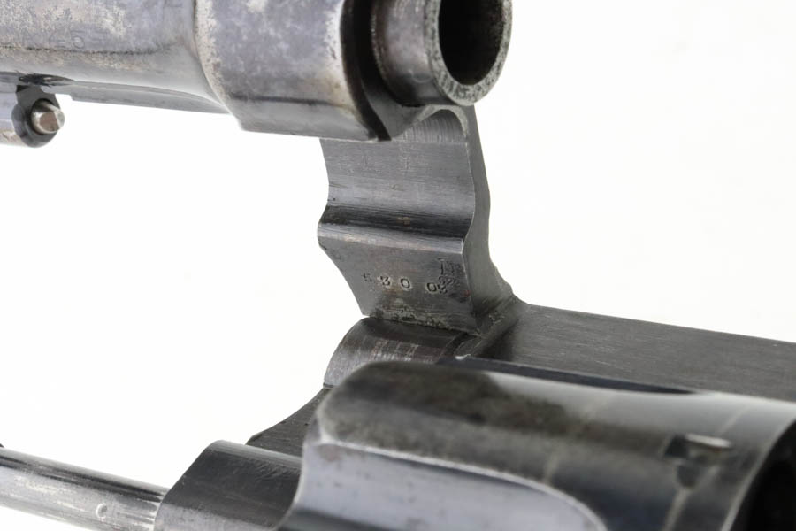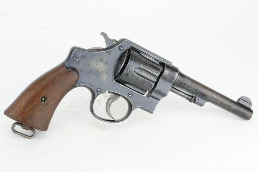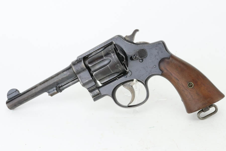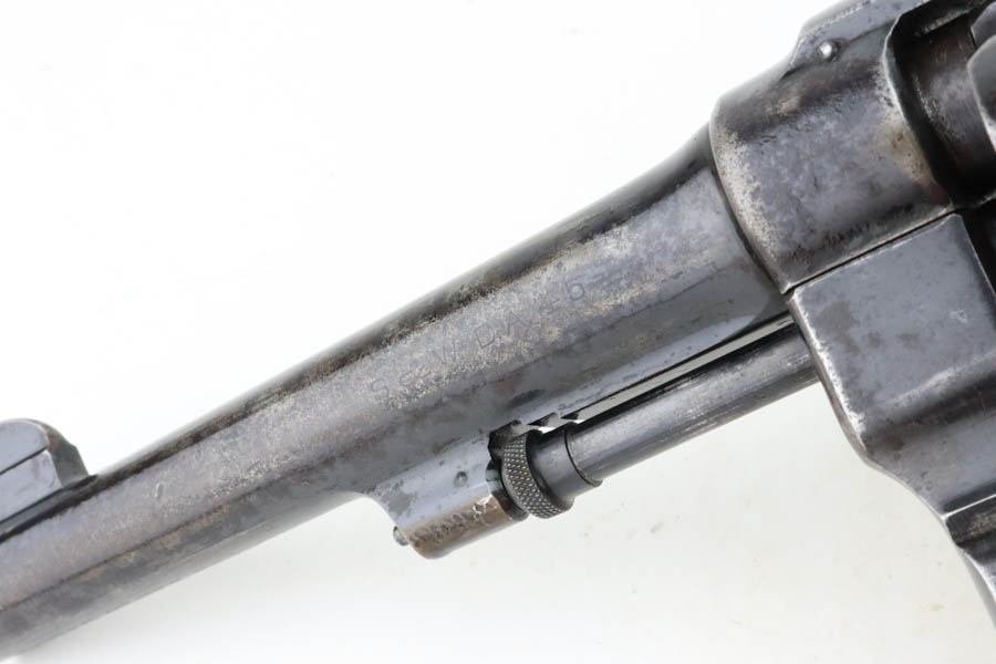 8/1/24 – This is a Smith & Wesson Model 1917 issued to the US military during WW1. It is all matching, “United States Property” marked, and has the proper flaming bomb and “Eagle Head” military acceptance proofs. It has retained roughly 80% of its finish with spotty wear and splotchy discoloration throughout. Some pin-pricking along the barrel. Fitted with wood grips – the grip are not numbered, but there some initials scratched on the inside. The bore has pretty good rifling, but there is minor pitting throughout.