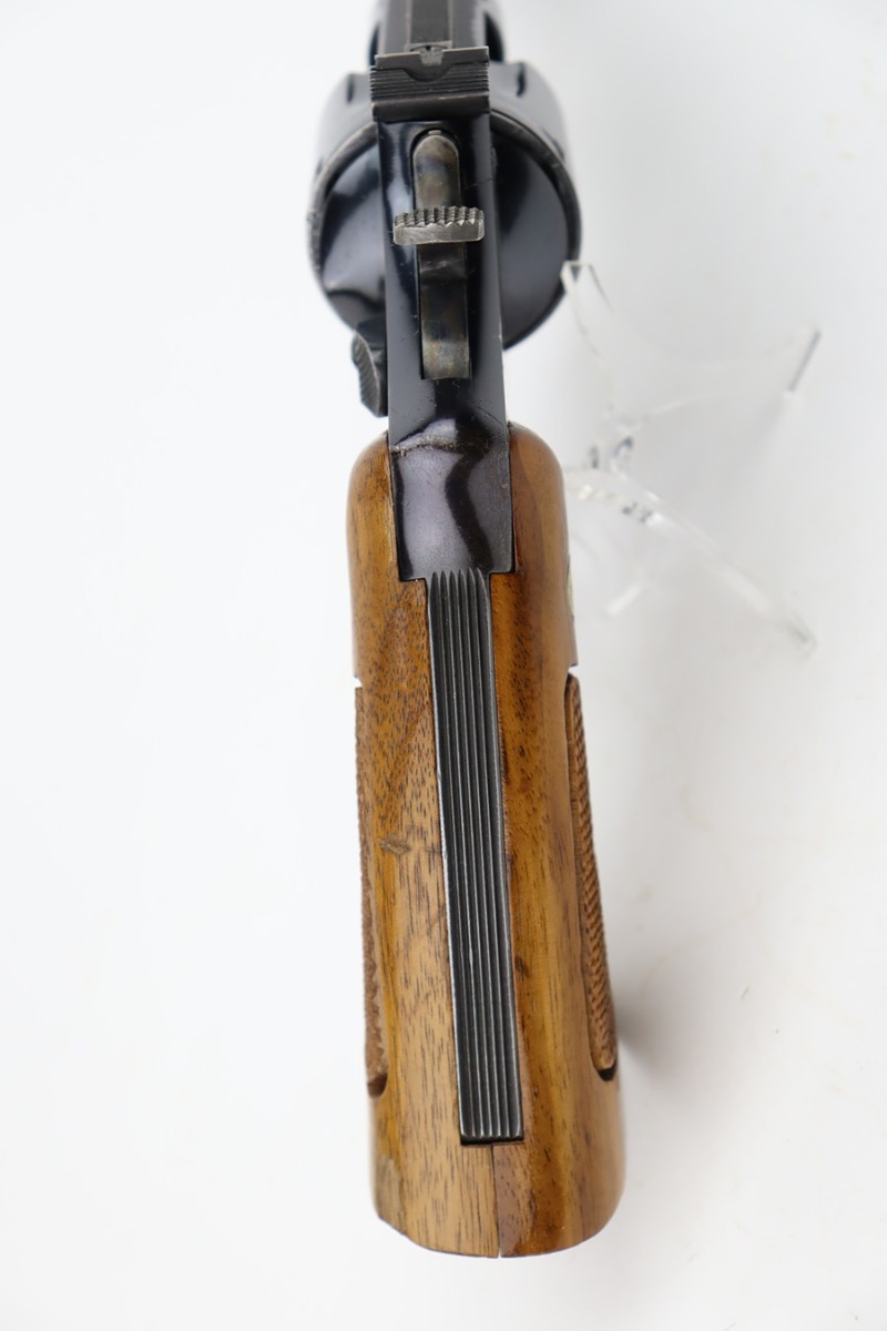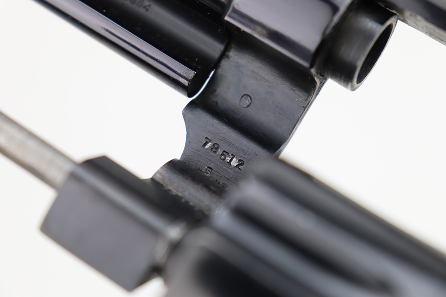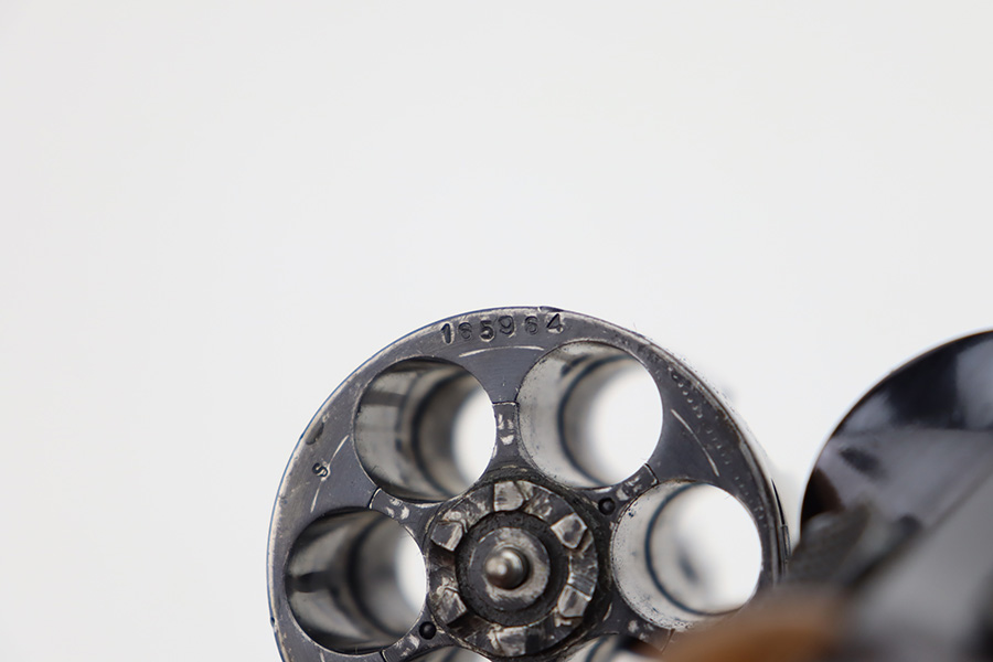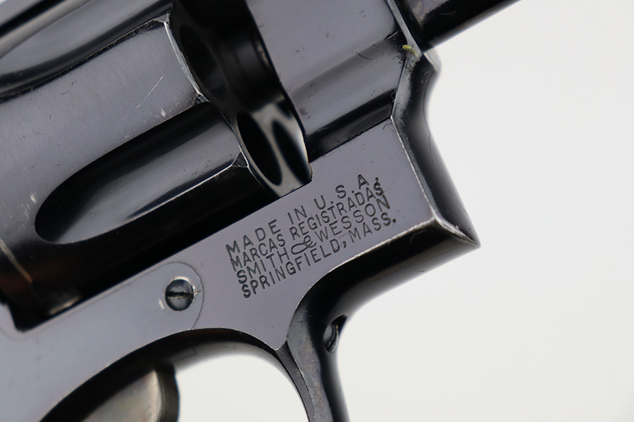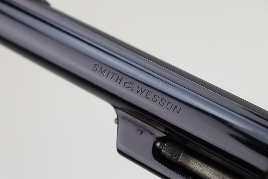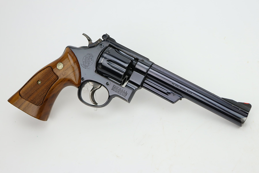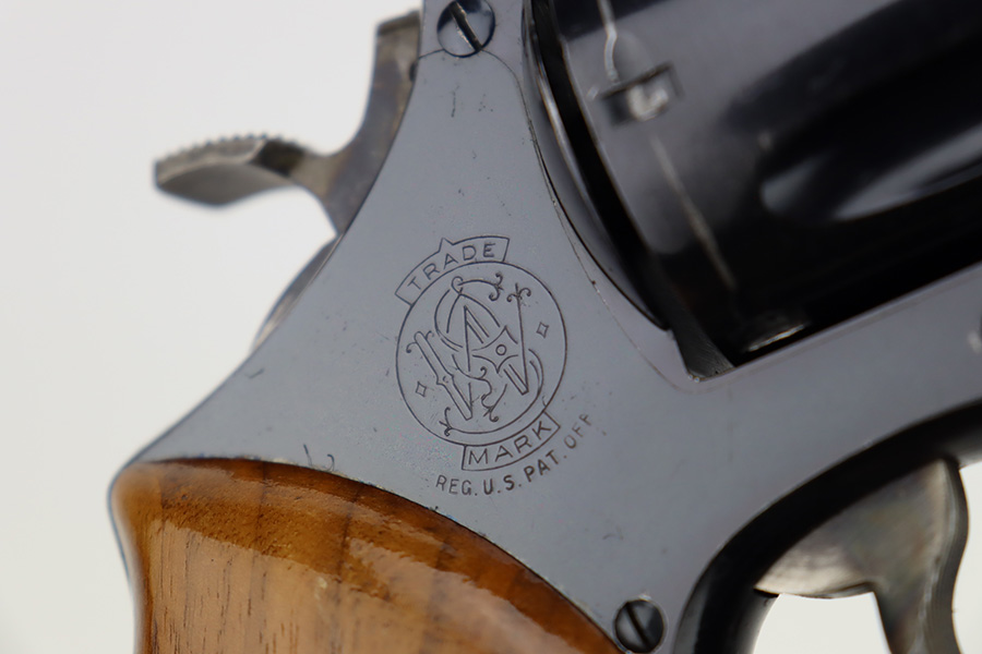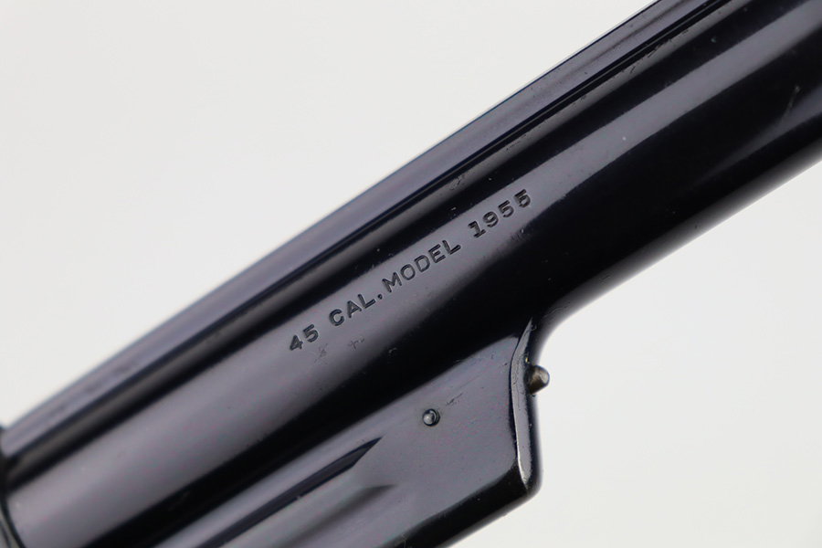 12/5/23 – This is an excellent example of a S&W Model 1955 or pre-25, manufactured in 1957 and chambered in .45 Caliber. 6.5″ barrel. The high polish bluing rates about 95% with some muzzle wear, a roll mark on the cylinder, and some tiny micro-scratches here and there. Fitted with nice hand-checkered wood grips – tiny chip in the left panel. Near-mint bore.