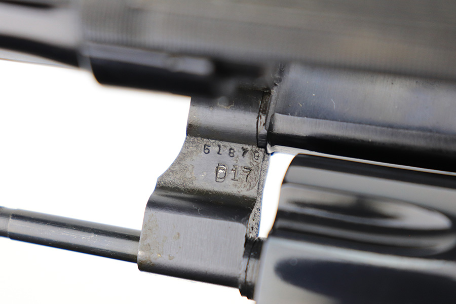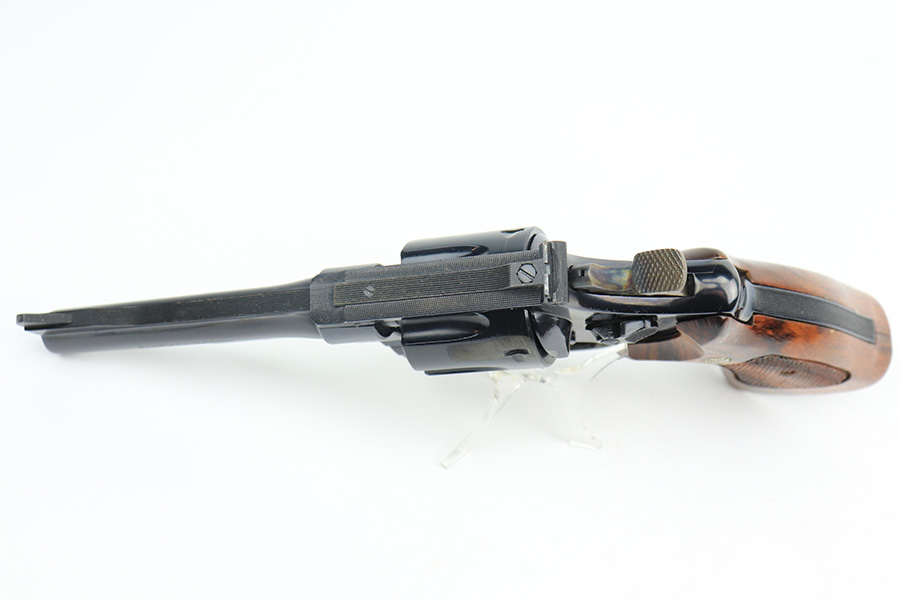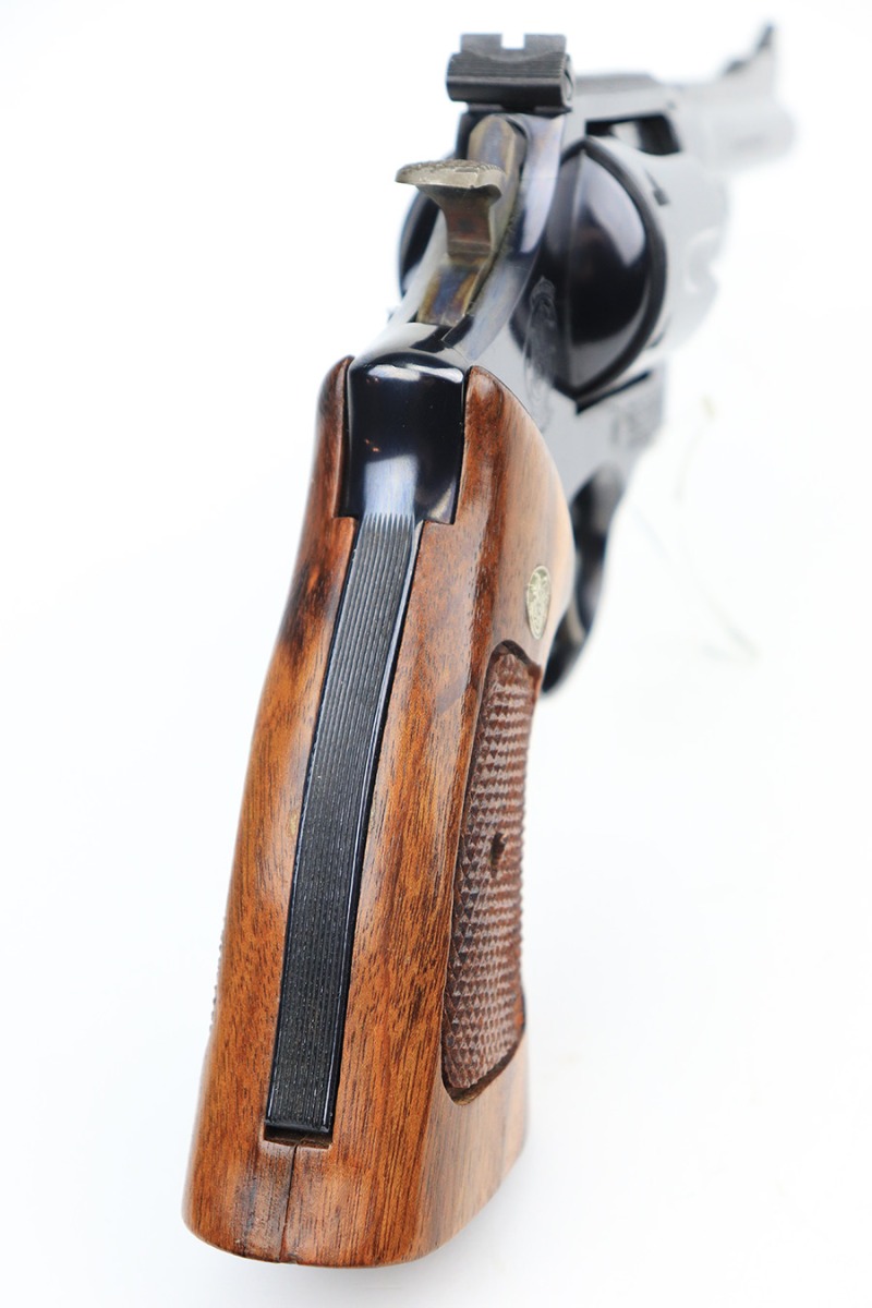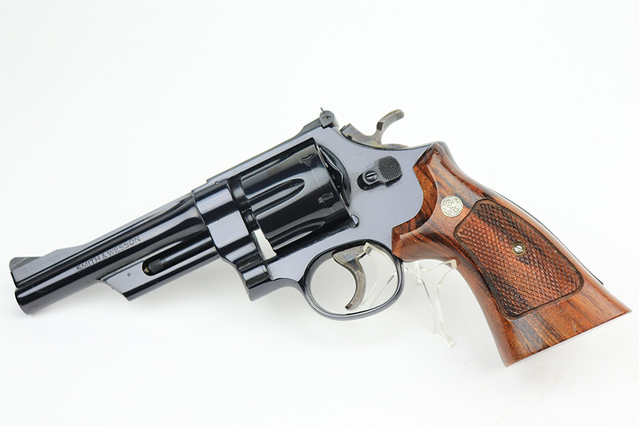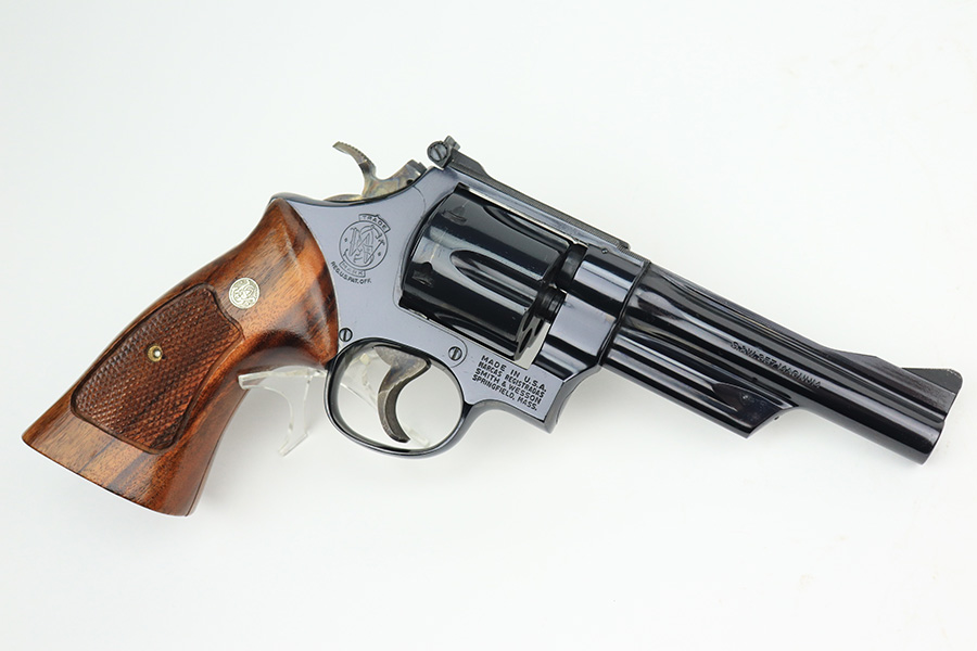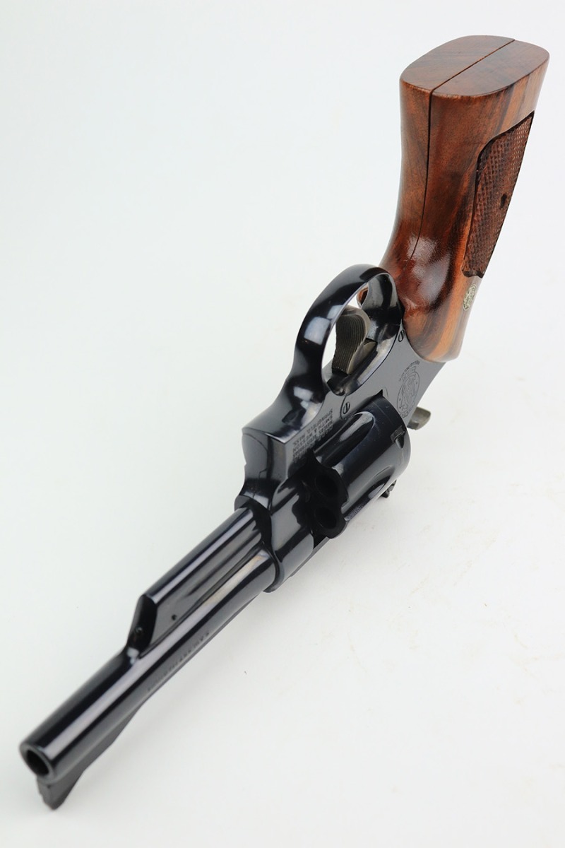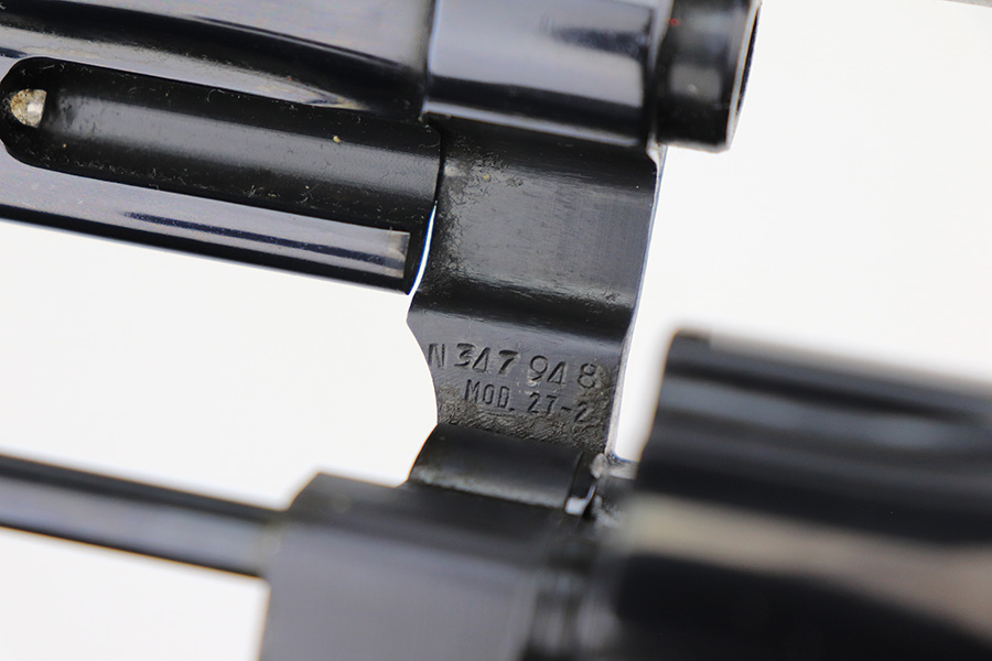 5/23/22 – This is a gorgeous example of a Smith & Wesson Model 27-2 revolver manufactured in about 1976. It is all matching, chambered in .357 Magnum, and has a 5 inch barrel. It has retained virtually all of its original high polish finish with just a faint roll mark on the cylinder. Beautiful case-hardening on the small parts. Comes with excellent wood grips. Mint bore. The cylinder is tight and the action is smooth.