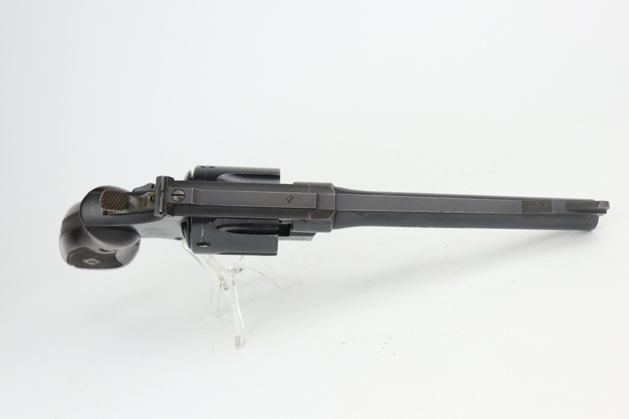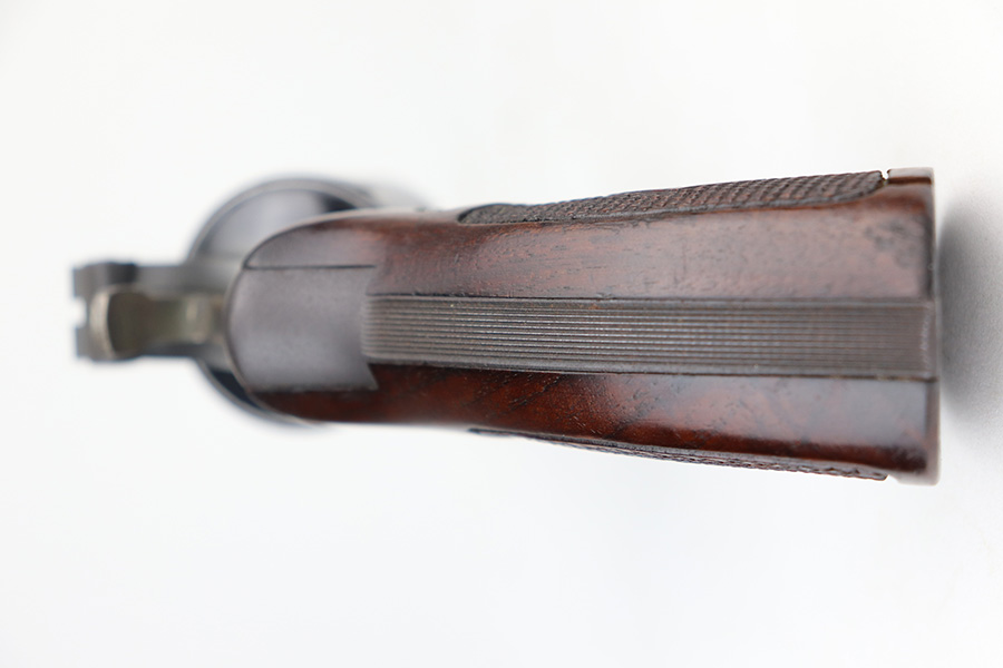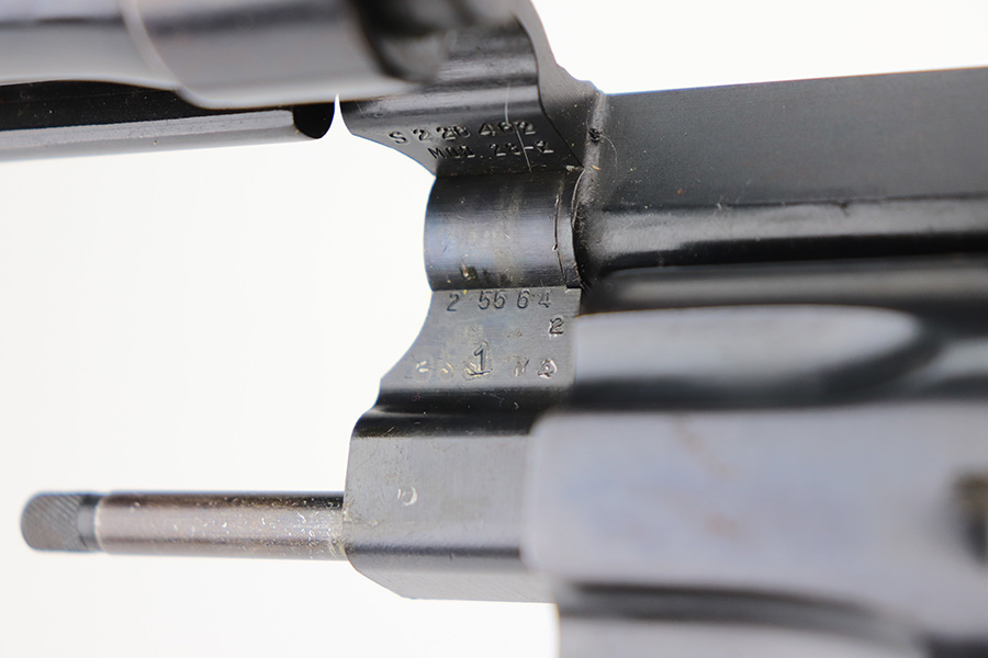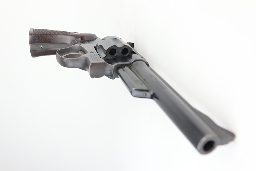 It has a six inch barrel and retains maybe 97% of the original blue. There isn’t much actual bluing loss, just a bit on the cylinder, but there is oxidation in a few areas. C&R eligible. Mint bore and functions smoothly. Beautiful grips with only minor handling wear. The right panel has two serial numbers on it for some reason but one of those numbers is the matching numbered panel to the gun.