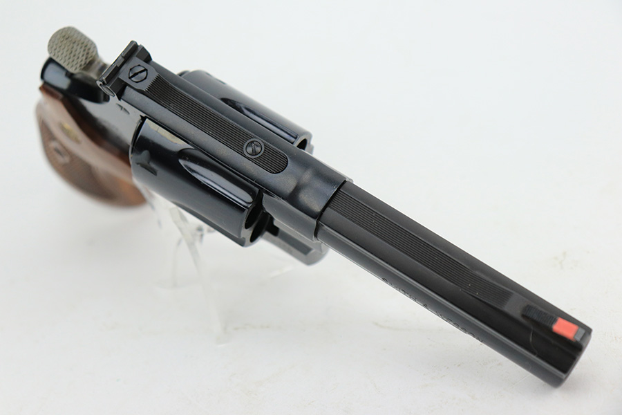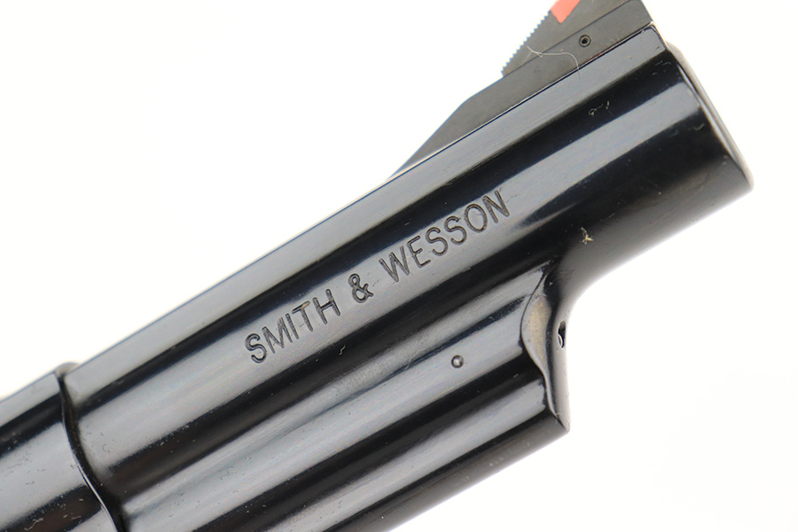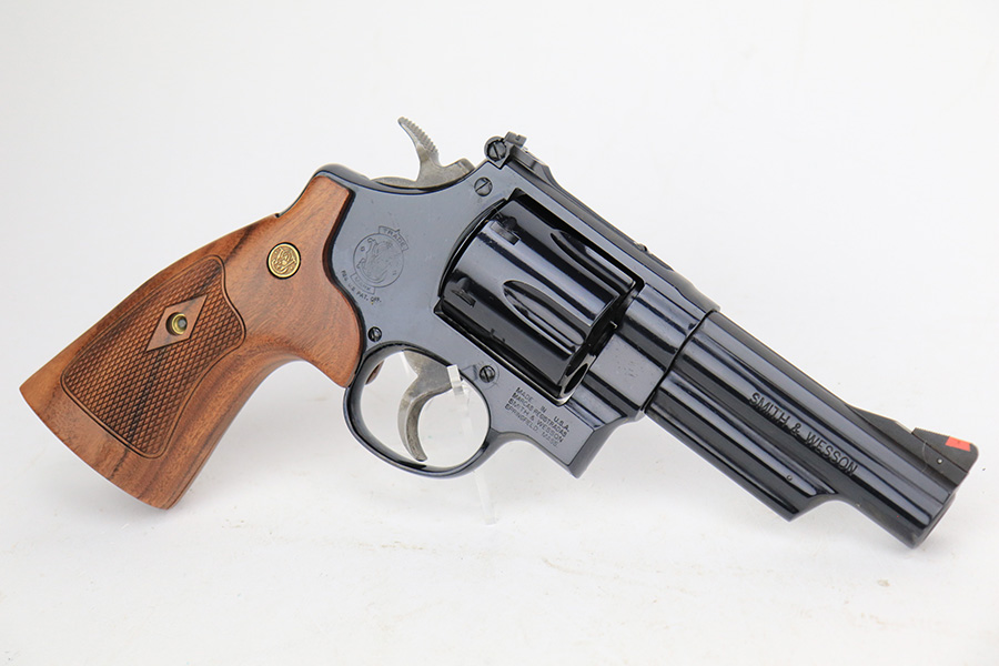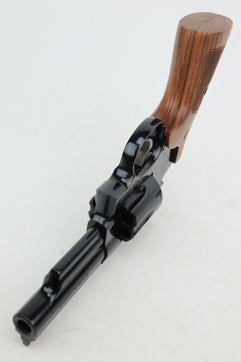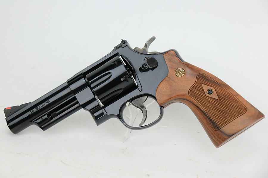 5/22/23 – This is a near-mint example of a Smith & Wesson Model 29-10 Revolver, chambered in .44 Magnum. 4″ barrel. It has retained nearly all of its original high polish finish – the only sign of use or wear is a very light roll mark on the cylinder. Excellent case-hardening on the hammer and trigger. Fitted with beautiful S&W wood grips. Mint bore. The cylinder is tight, and the action is very smooth.