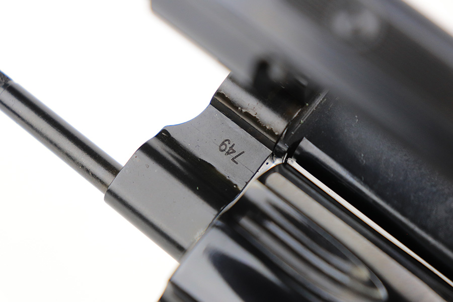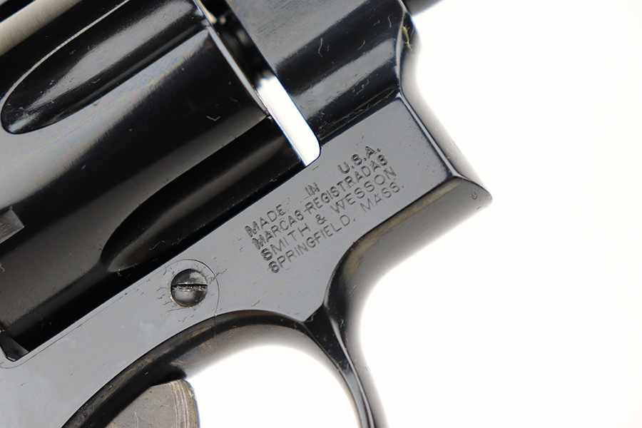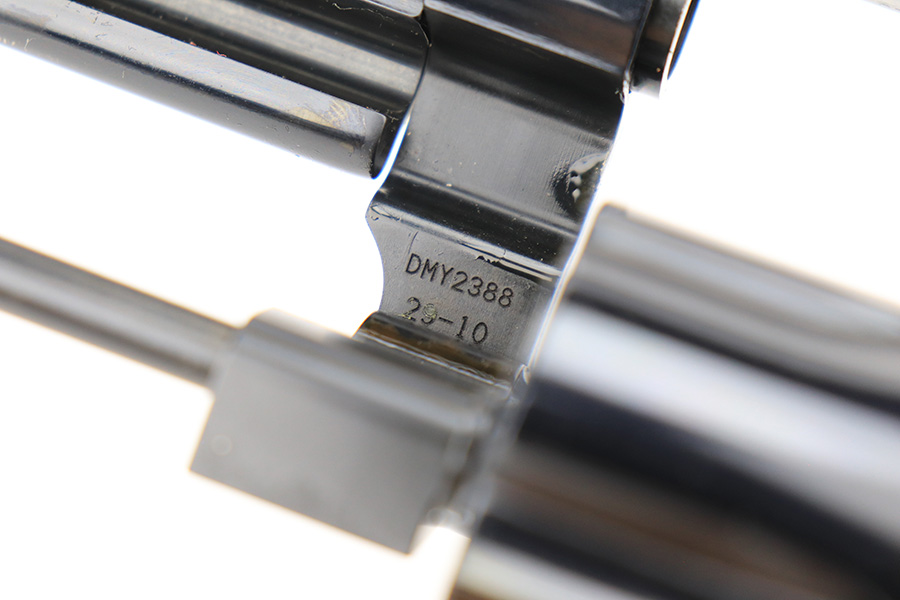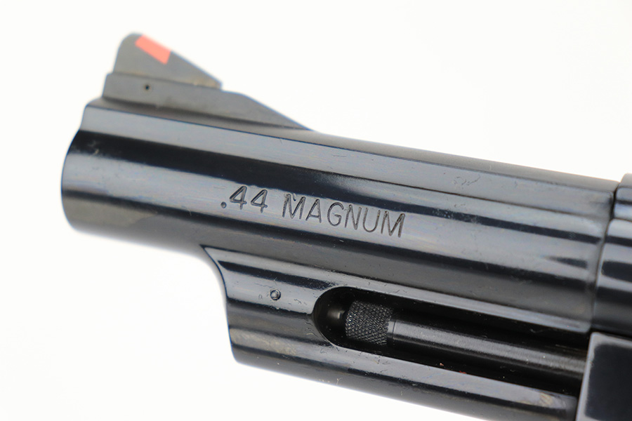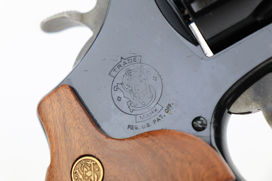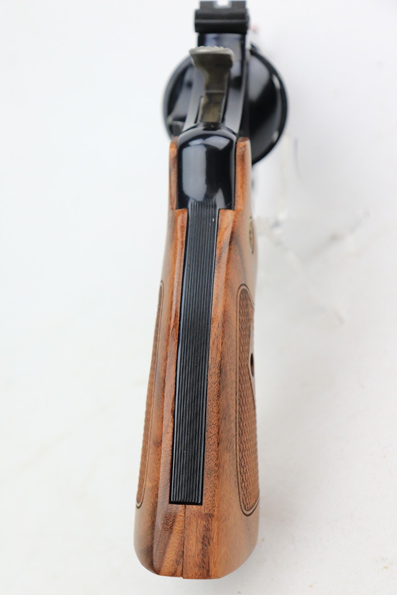 5/22/23 – This is a near-mint example of a Smith & Wesson Model 29-10 Revolver, chambered in .44 Magnum. 4″ barrel. It has retained nearly all of its original high polish finish – the only sign of use or wear is a very light roll mark on the cylinder. Excellent case-hardening on the hammer and trigger. Fitted with beautiful S&W wood grips. Mint bore. The cylinder is tight, and the action is very smooth.