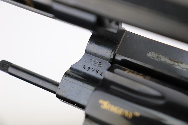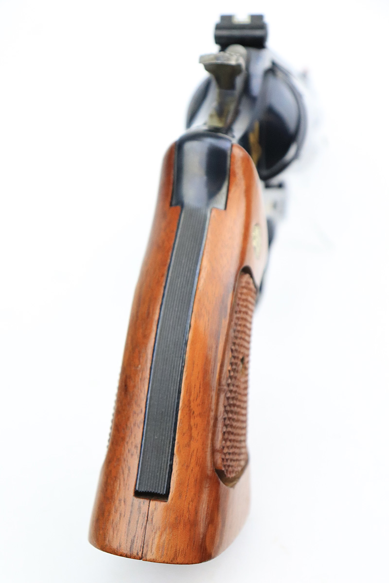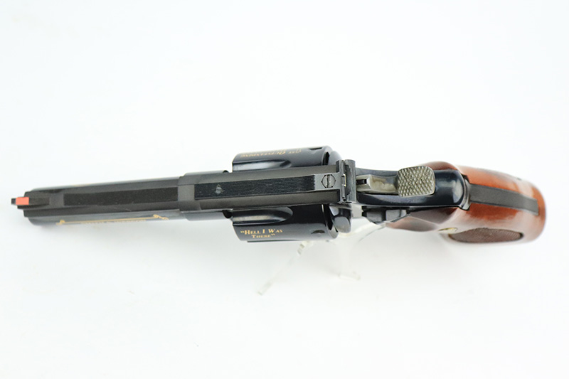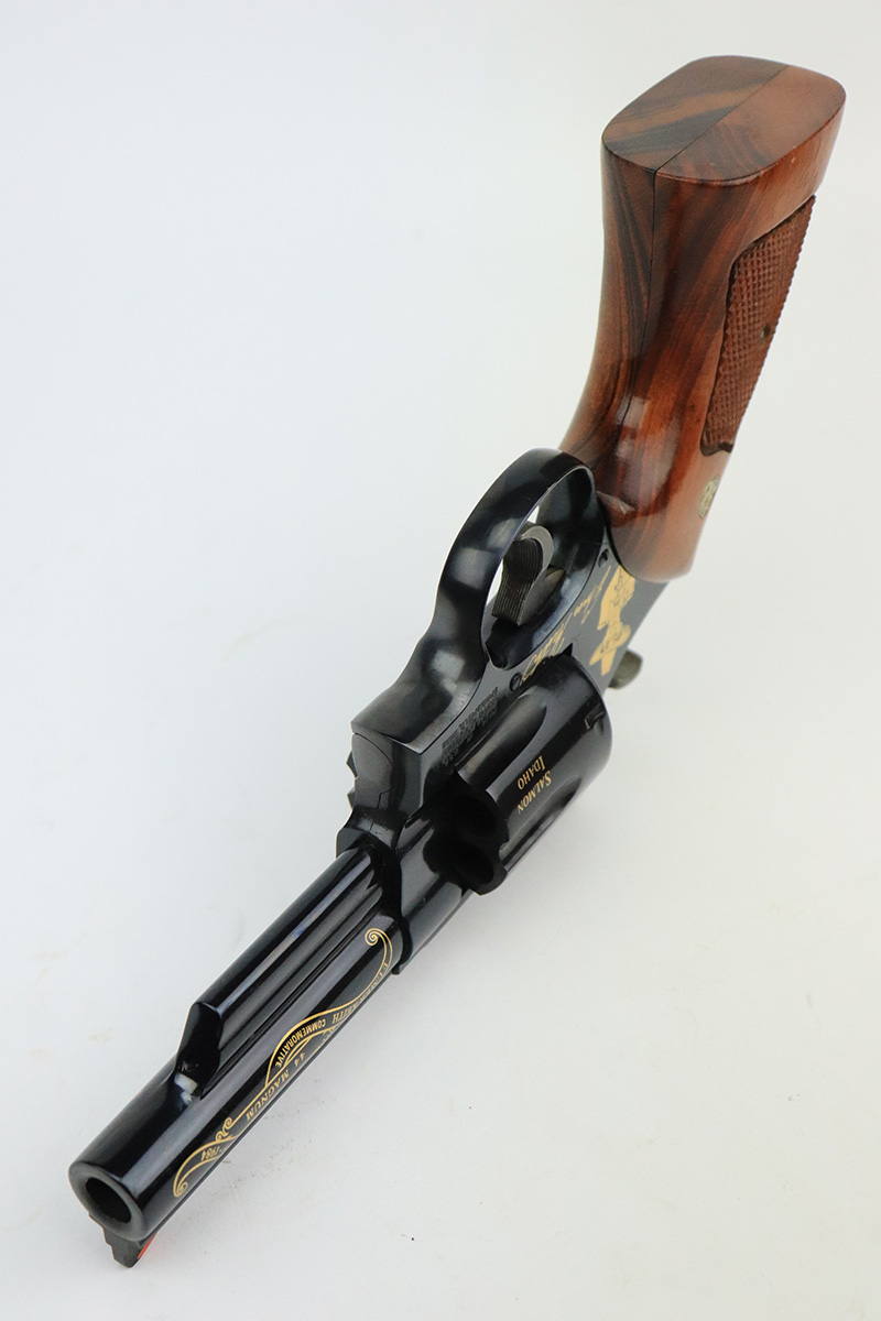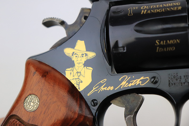 9/27/22 – This is a like-new example of a Smith & Wesson Model 29-3 made to commemorate Elmer Keith, American rancher, firearms enthusiast, and author. One of only 2,500 made by S&W in 1985. The gun has beautiful gold accents throughout. On the right side of the frame is a silhouette of Mr. Keith with his signature underneath. The barrel reads, “Elmer Keith Commemorative”, “44 Magnum”, and “1899-1984”. Around the cylinder, there are several phrases : “Salmon Idaho”, “Sixguns”, “Hell I Was There”, and “1st Outstanding Handgunner”. The left side of the frame reads “1 of 2,500”. The gun has a beautiful deep high polish bluing and case-hardening on the small parts. It is in mint condition with essentially no signs of wear or use. Comes with gorgeous hand-checkered Walnut grips. The bore is like-new.