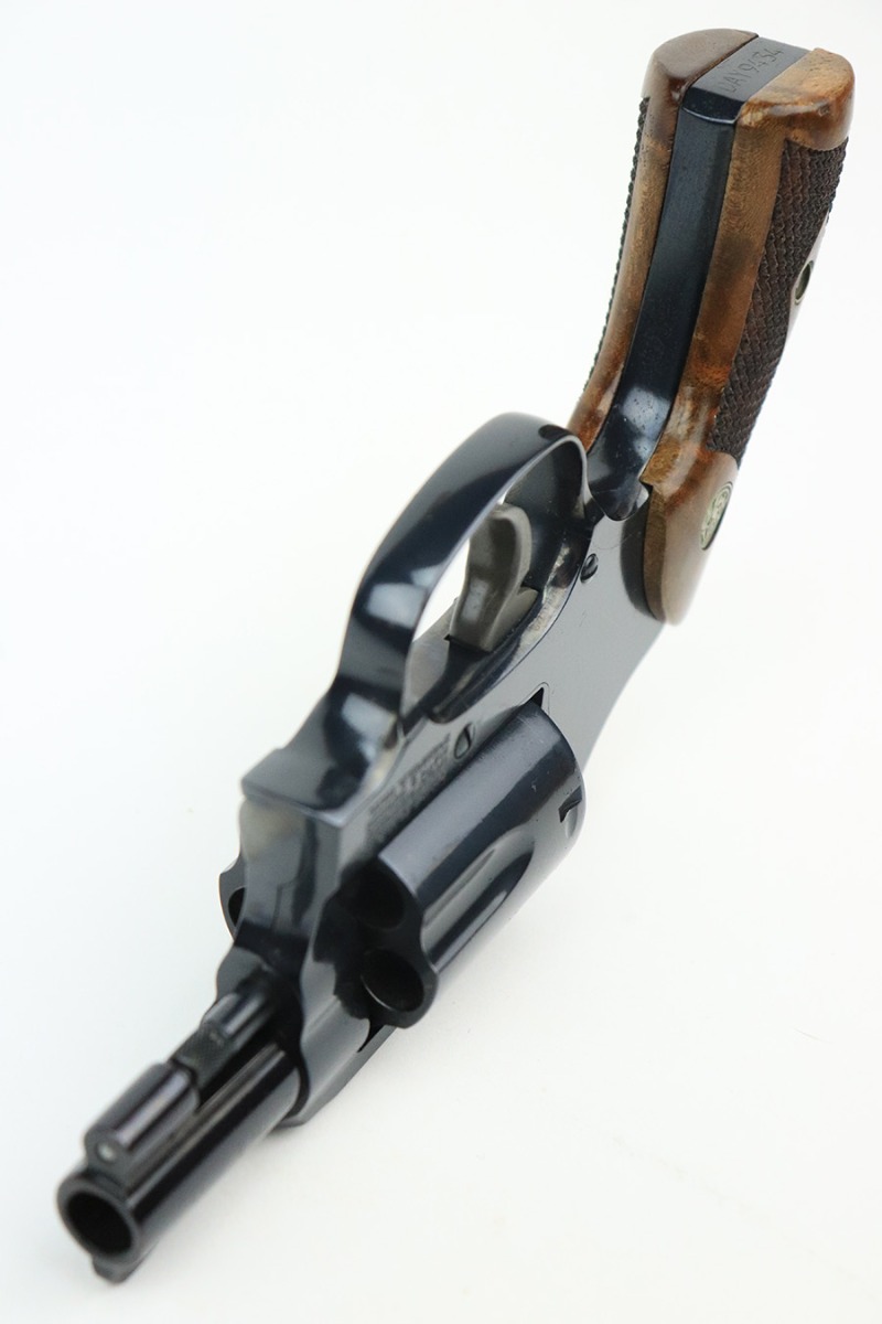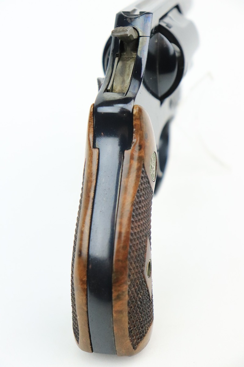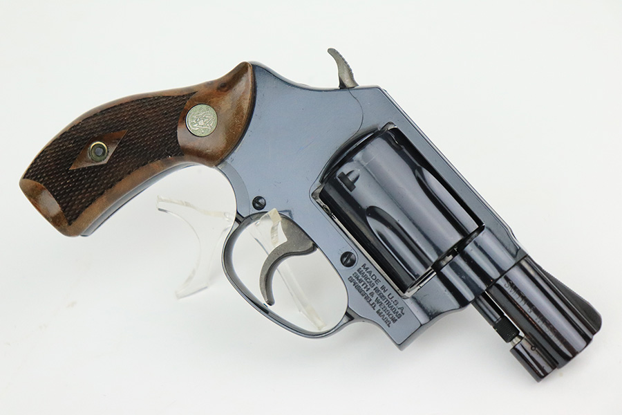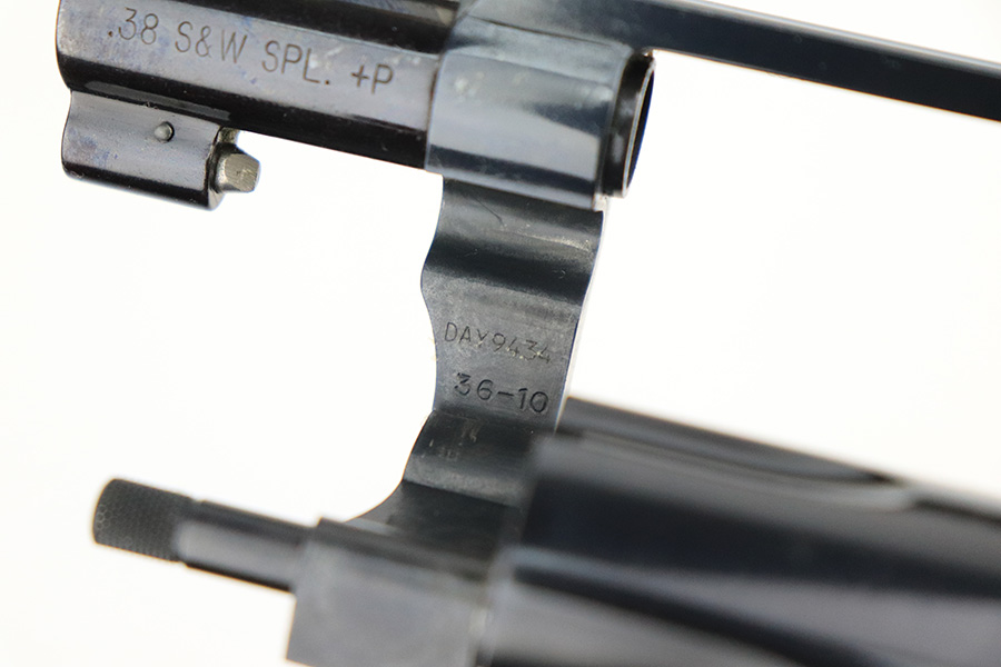 7/8/22 – This is an excellent example of a 2″ Smith & Wesson Model 36-10 revolver, chambered in .38 Special +P. The gun is fully functional and has retained virtually all of its original finish – there is barely even a roll mark on the cylinder. However, there is some light freckling on both grip straps. Comes with excellent Walnut grips. Mint bore. The cylinder is tight and the action is smooth.