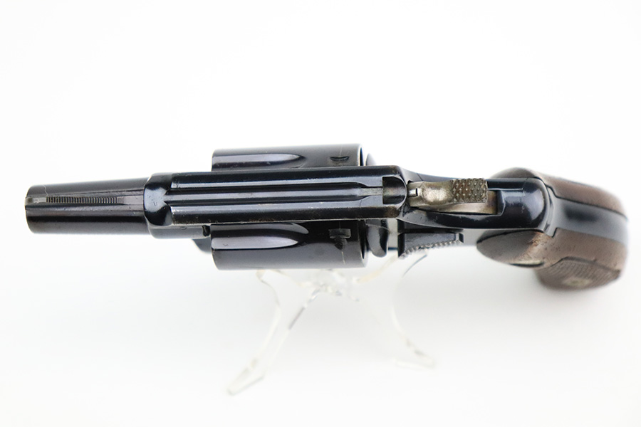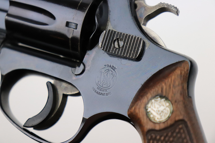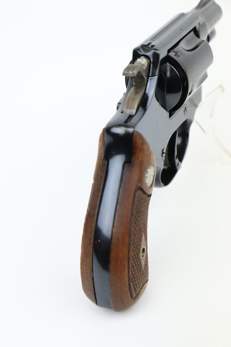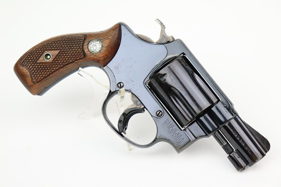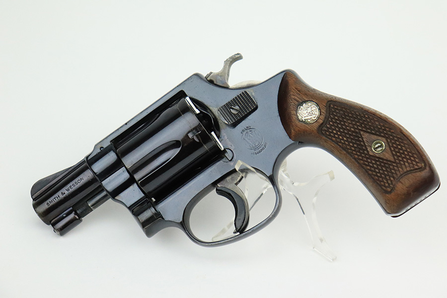 7/8/22 – This is a very nice example of a 2″ S&W Model 36 revolver, manufactured in about 1960 and chambered in .38 Special. The gun is all matching and has retained about 95% of its original high polish finish. Generally, there is minor wear around the high edges and around the muzzle. Light roll mark on the cylinder. There are some light surface scratches and a few small dots of oxidation on both sides of the frame. Excellent Walnut grips. Mint bore. The cylinder is tight, and the action is smooth.