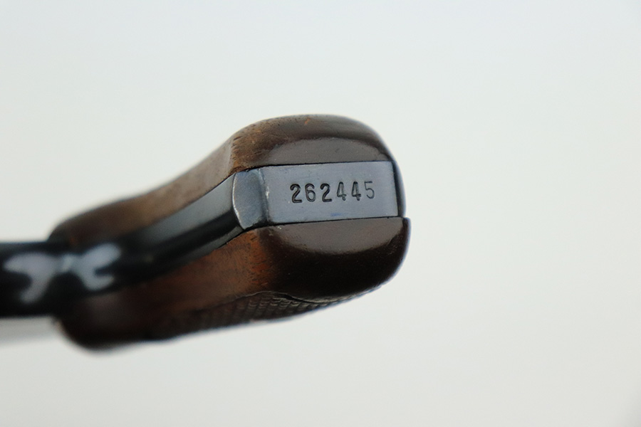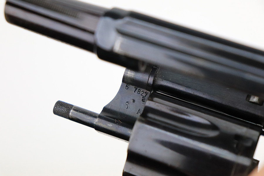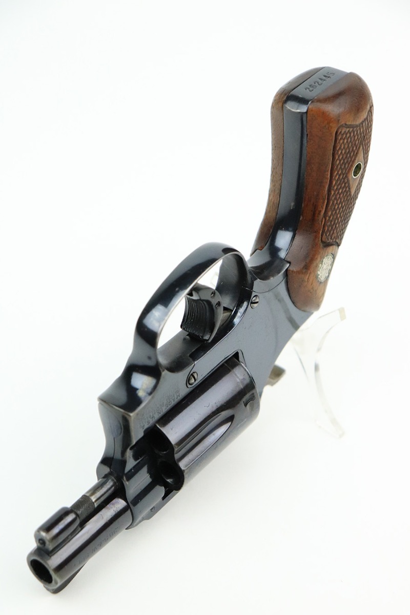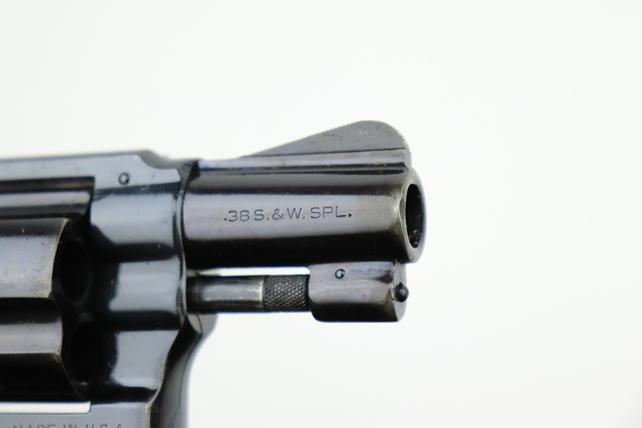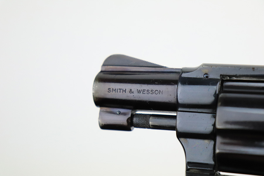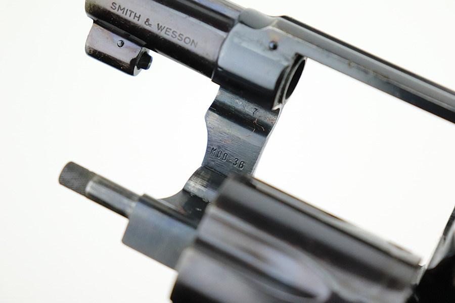 7/8/22 – This is a very nice example of a 2″ S&W Model 36 revolver, manufactured in about 1960 and chambered in .38 Special. The gun is all matching and has retained about 95% of its original high polish finish. Generally, there is minor wear around the high edges and around the muzzle. Light roll mark on the cylinder. There are some light surface scratches and a few small dots of oxidation on both sides of the frame. Excellent Walnut grips. Mint bore. The cylinder is tight, and the action is smooth.
