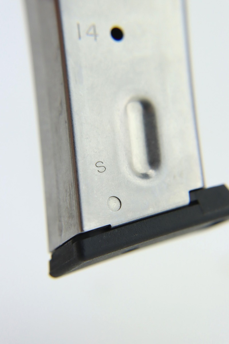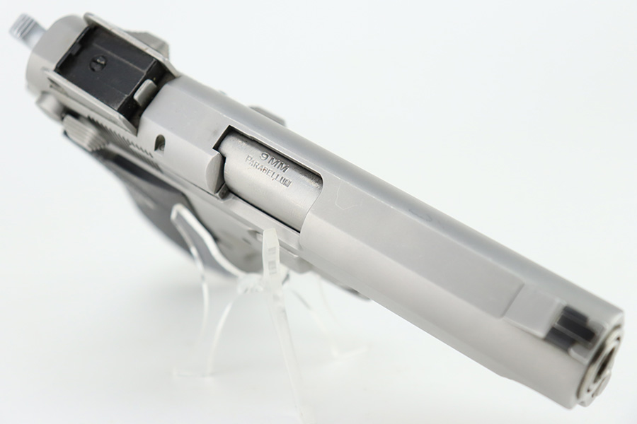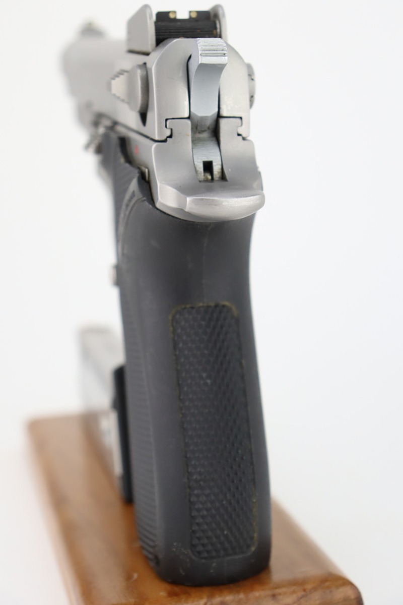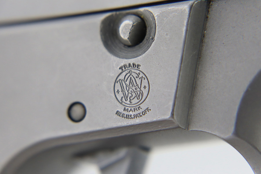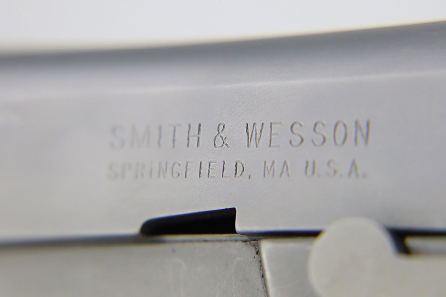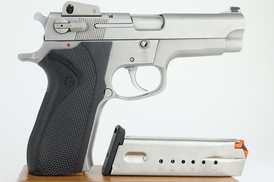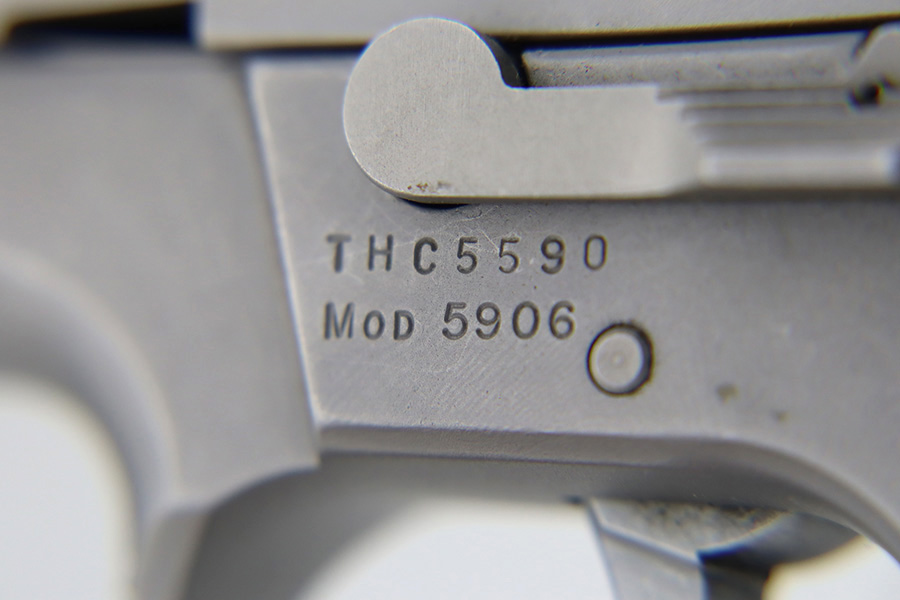 1/8/24 – This is a Smith & Wesson Model 5906 semi auto pistol, manufactured in 1991 and chambered in 9mm. Very nice matte stainless finish. Overall, it is in excellent condition, but there are very light surface scratches and scuffs here and there – most noticeable on the left side of the gun. Fitted with excellent black plastic grips and comes with one proper magazine. Minty bore.