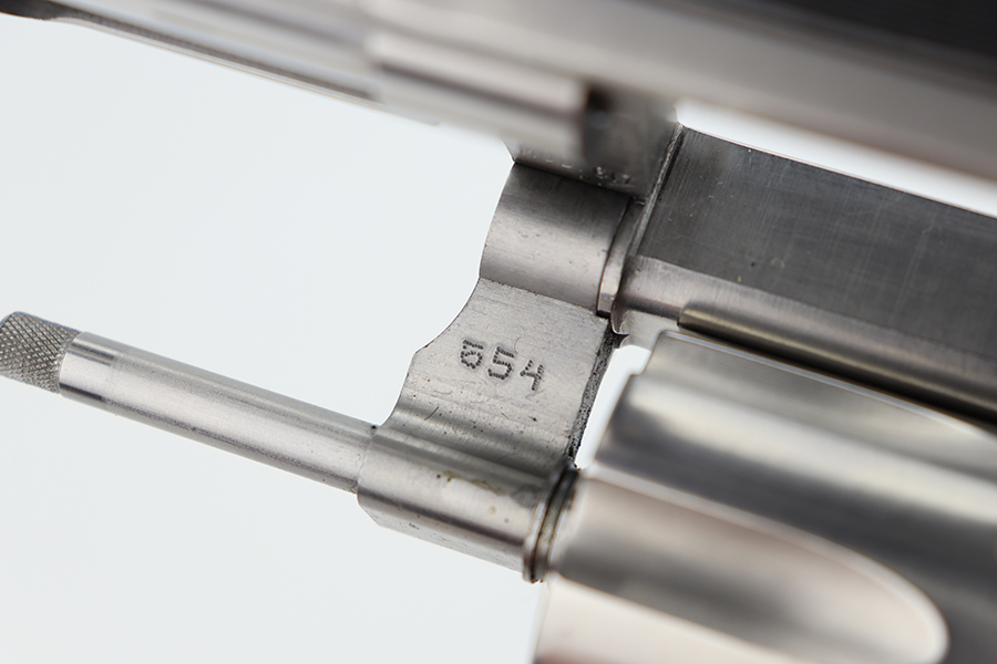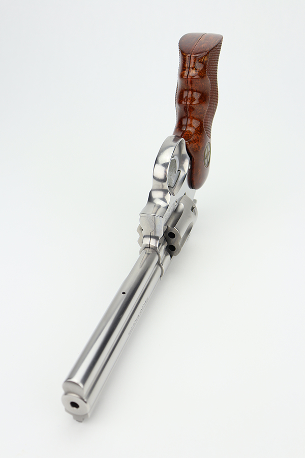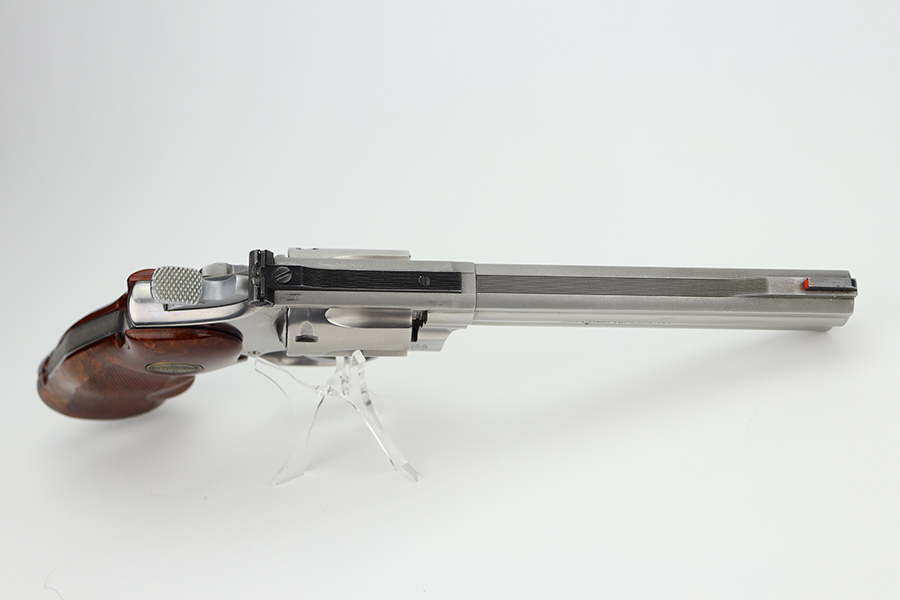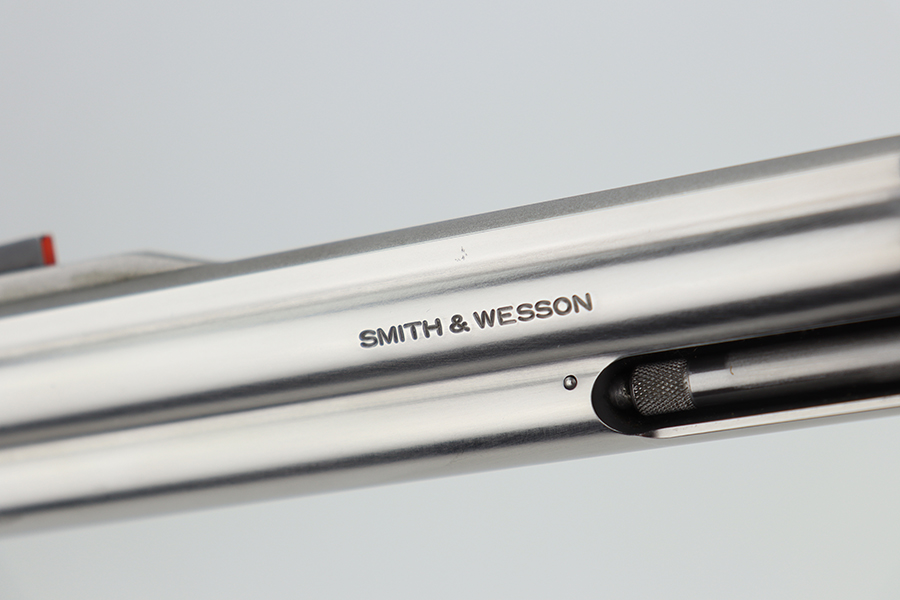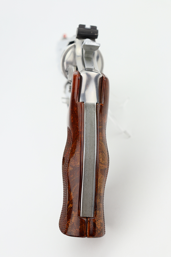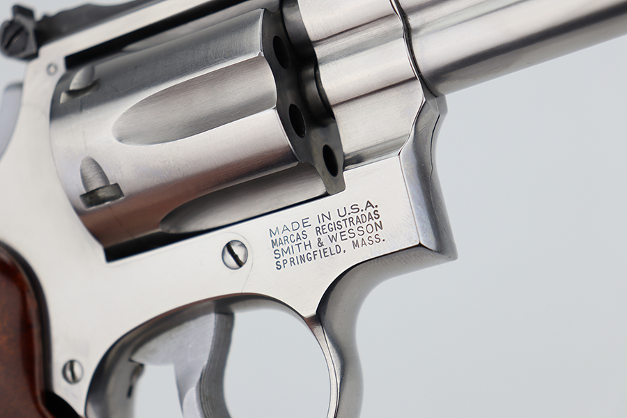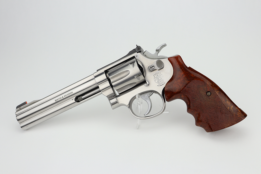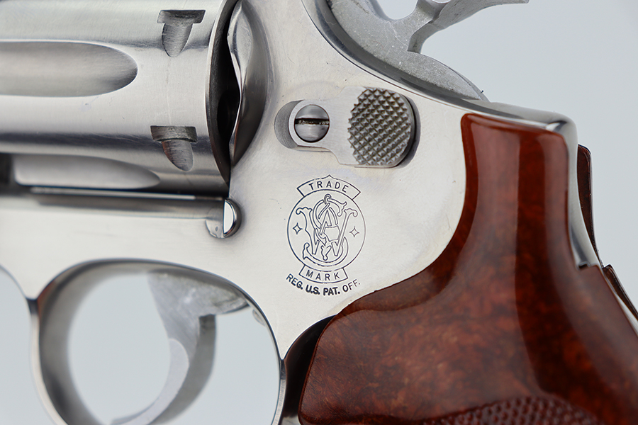 7/1/24 – This is an excellent example of a Smith & Wesson Model 617 Revolver. Chambered in .22 LR with a 6 inch barrel. It has a nice stainless finish with minimal signs of wear. There are just some tiny surface scratches here and there. Fitted with aftermarket marbled brown plastic grips. Mint bore. Smooth action.