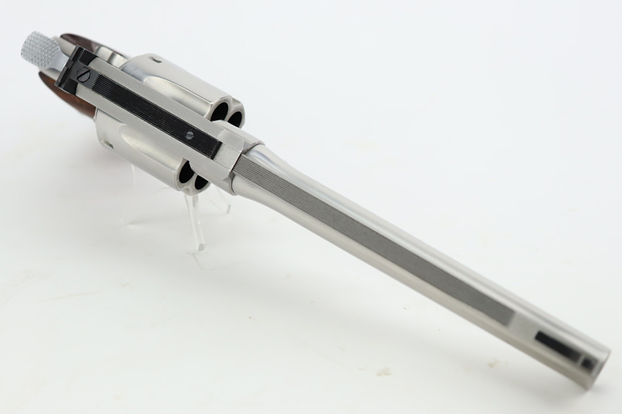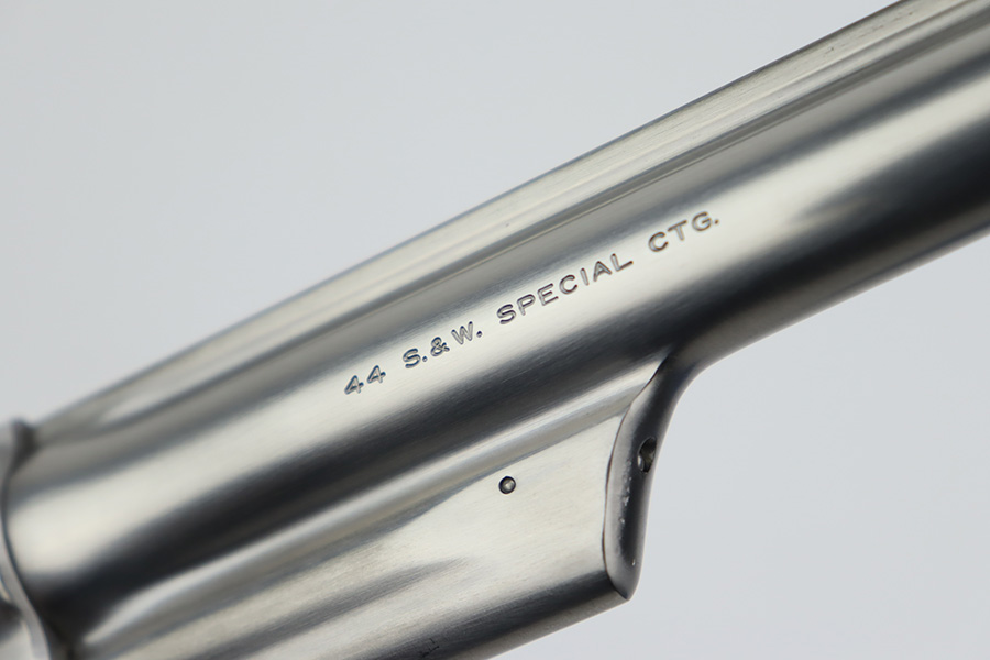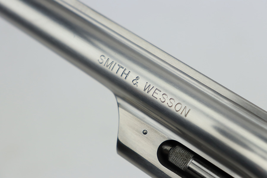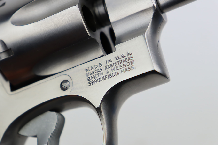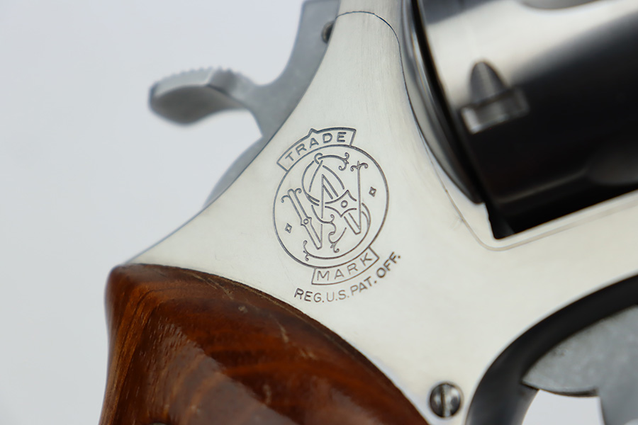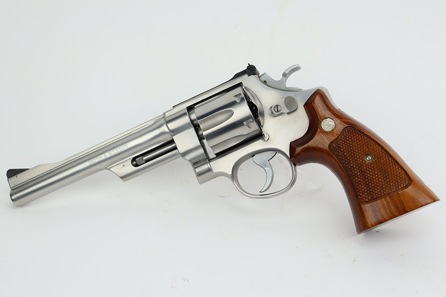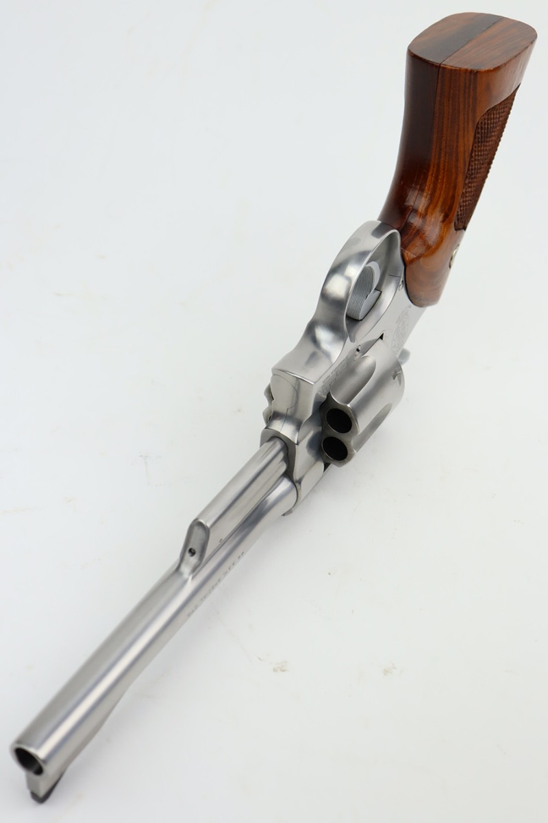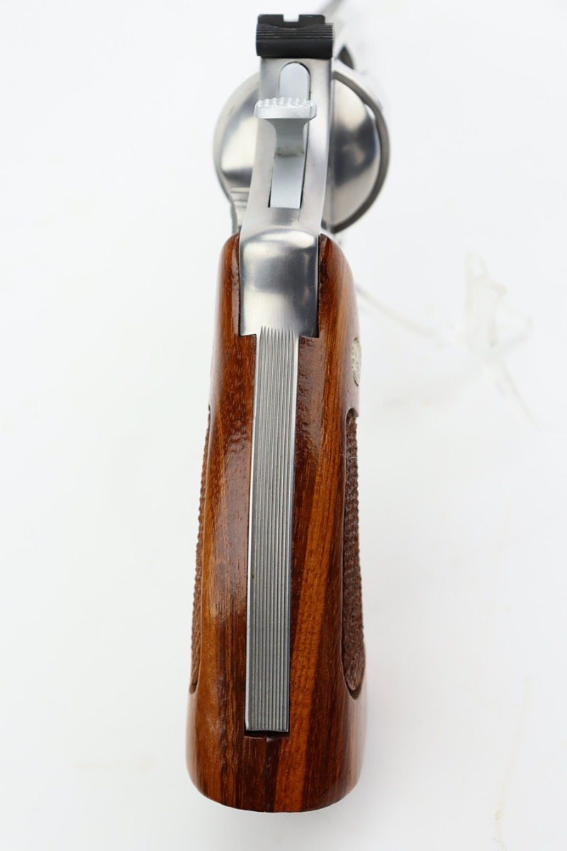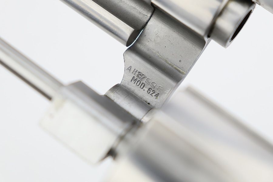 9/27/23 – This is an excellent example of a Smith & Wesson Model 624 revolver, chambered in .44 Special. The gun has a nice polish stainless finish with very little sign of wear except for some micro-scratches in the finish (typical). Fitted with excellent checkered wood grips. Mint bore.