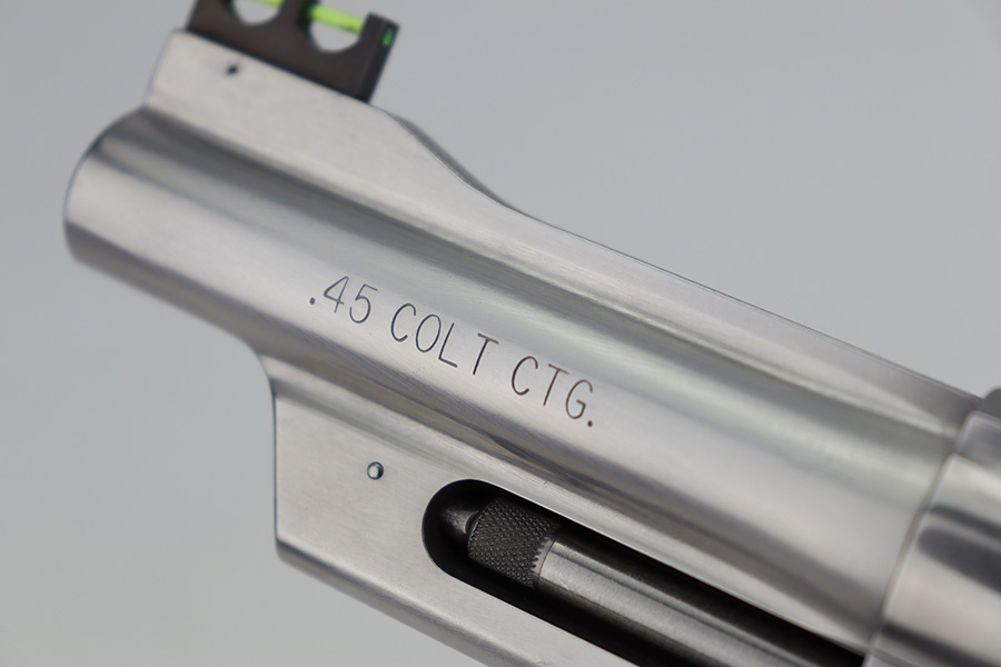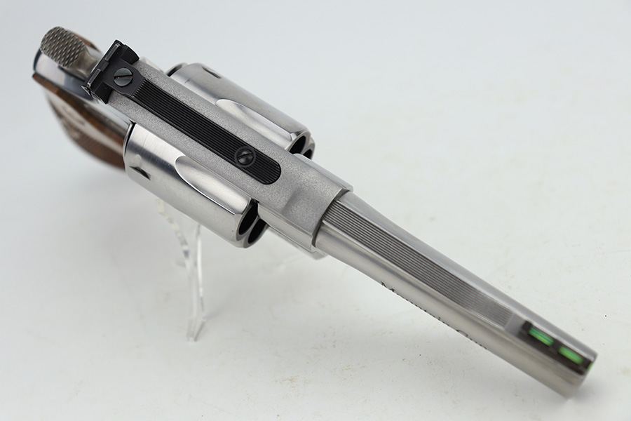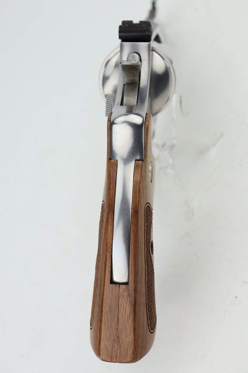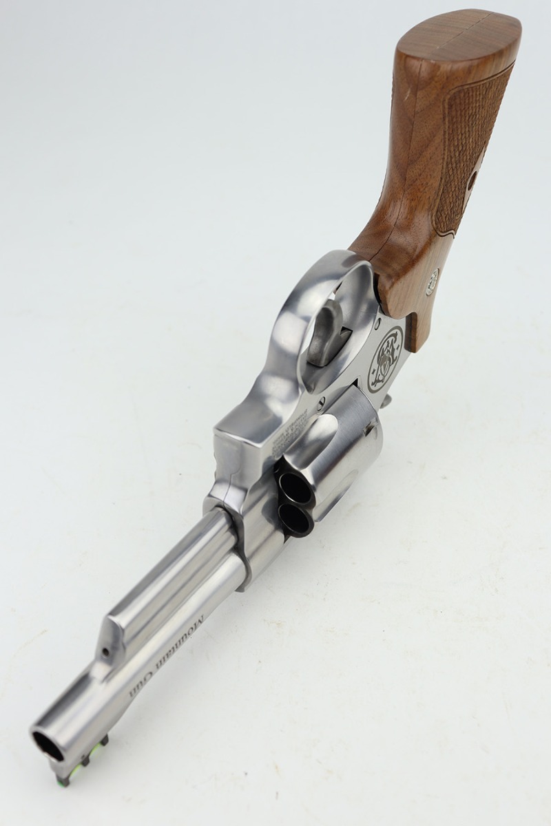 12/27/23 – This is an excellent Smith & Wesson Model 625-9 Mountain Gun Revolver, chambered in .45 Colt with a 4.25″ barrel. The gun has a really nice stainless finish. Very little sign of wear or use except for some micro-scratches (typical) and a light roll mark on the cylinder. Fitted with excellent wood grips. Mint bore.