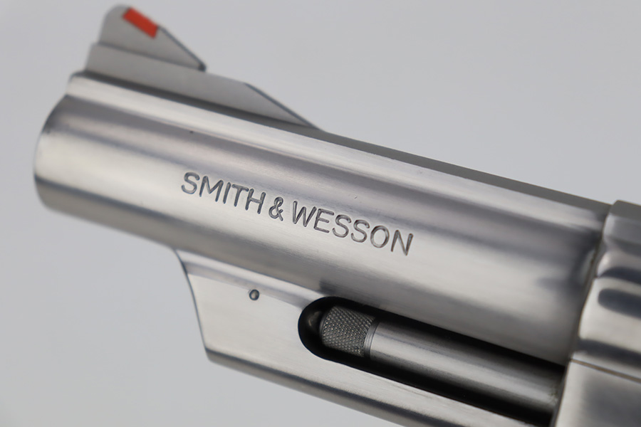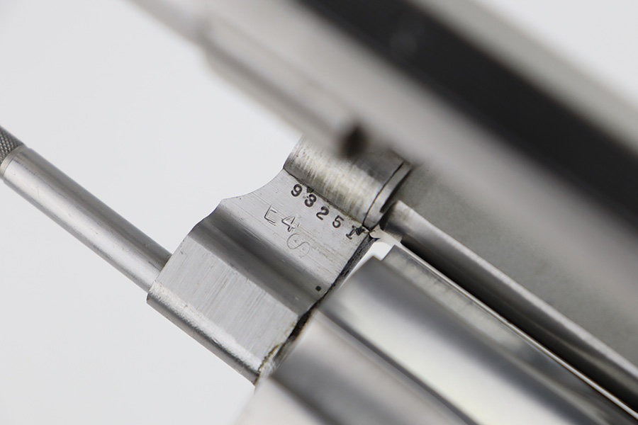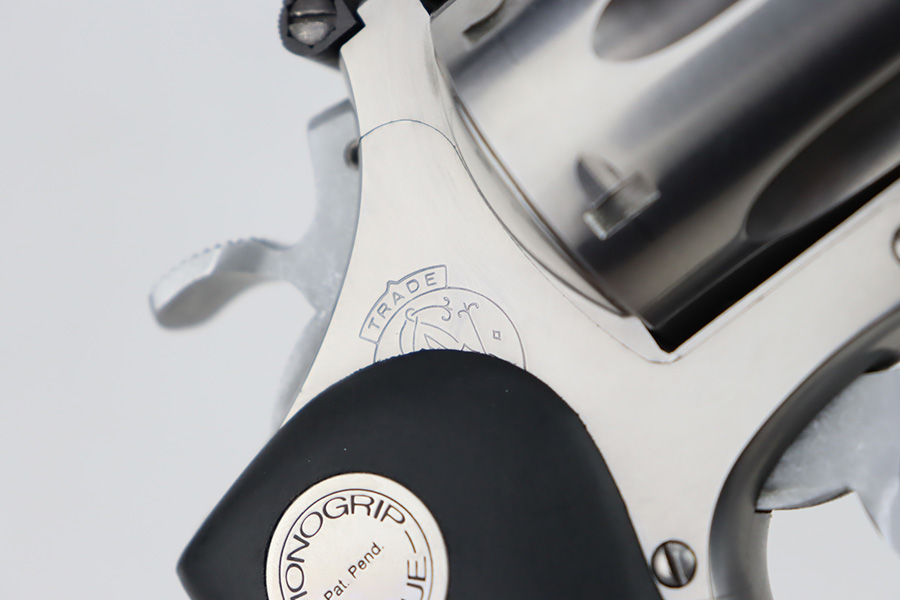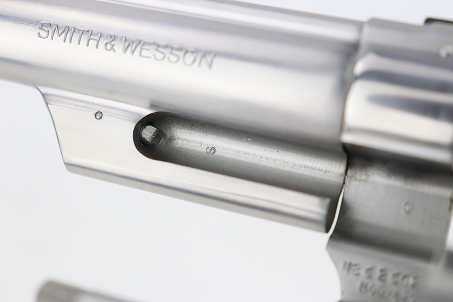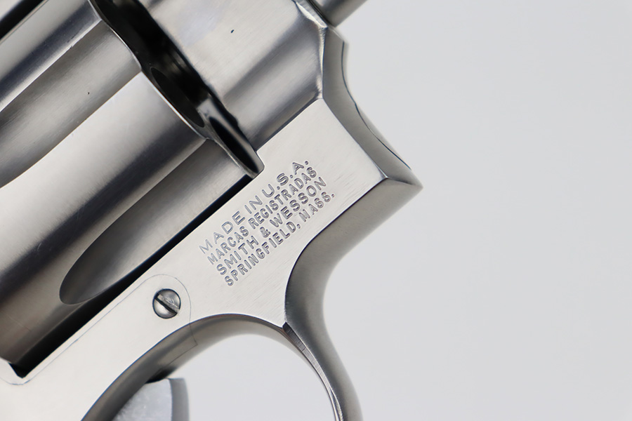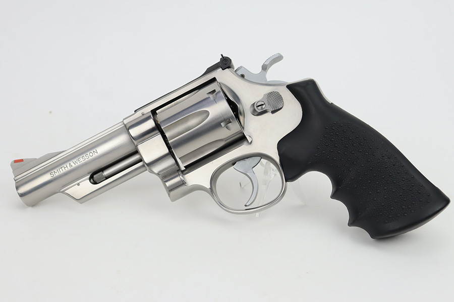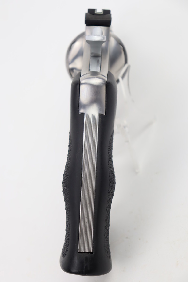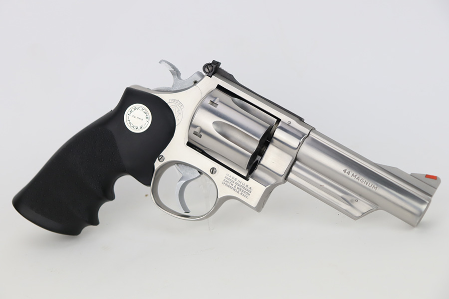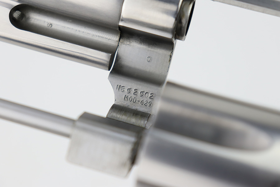 10/18/23 – This is an excellent Smith & Wesson Model 629 revolver, manufactured in 1981-82 and chambered in .44 Magnum. It has a really nice polished stainless finish. There is not much sign of wear, just micro-scratches in the finish throughout. Fitted with a Hogue black plastic grip. Mint bore. Very smooth action.